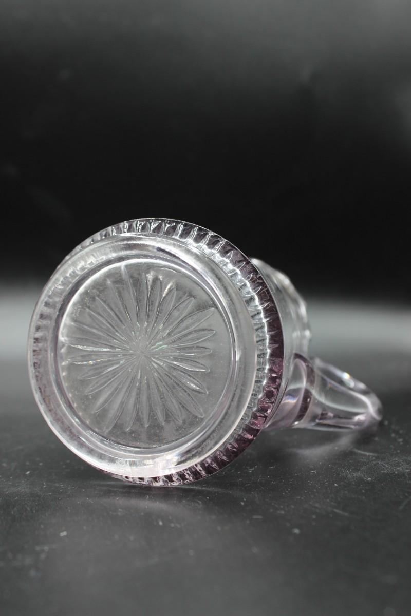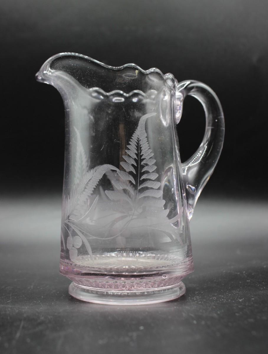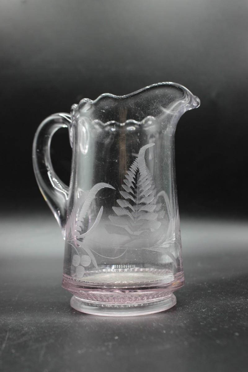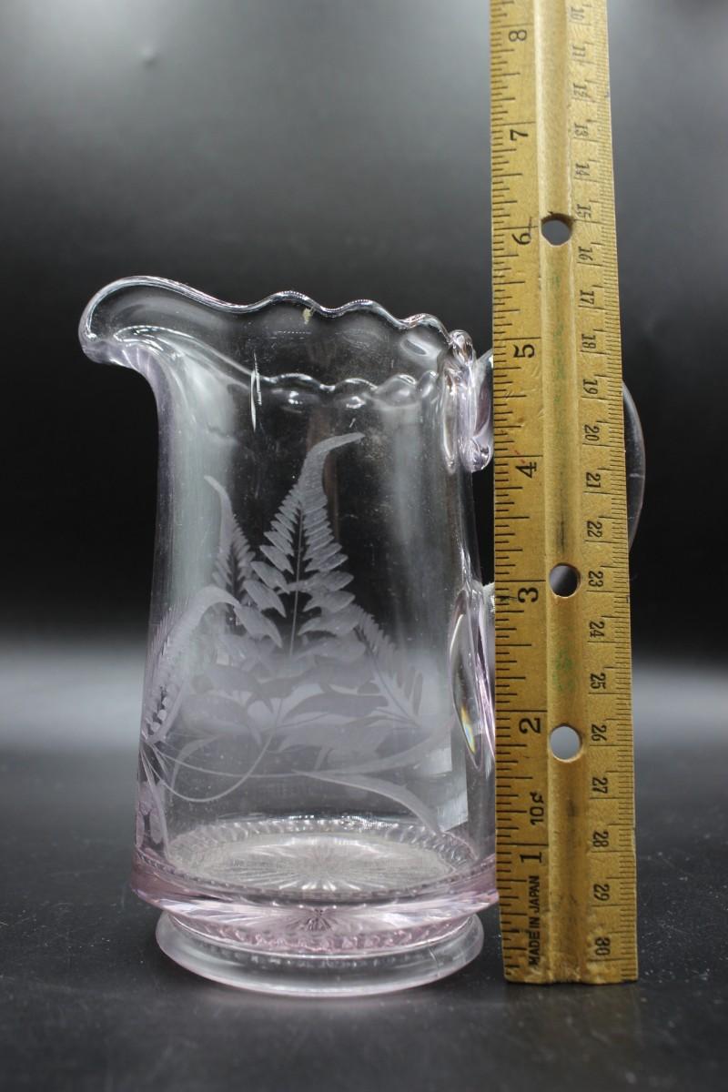 Vintage Small Pink Crystal Glass Leaf Pitcher, there are no cracks or chips to the pitcher and is in good condition. Check pictures for more details, the pitcher stands at about 5 1/2 inches tall.