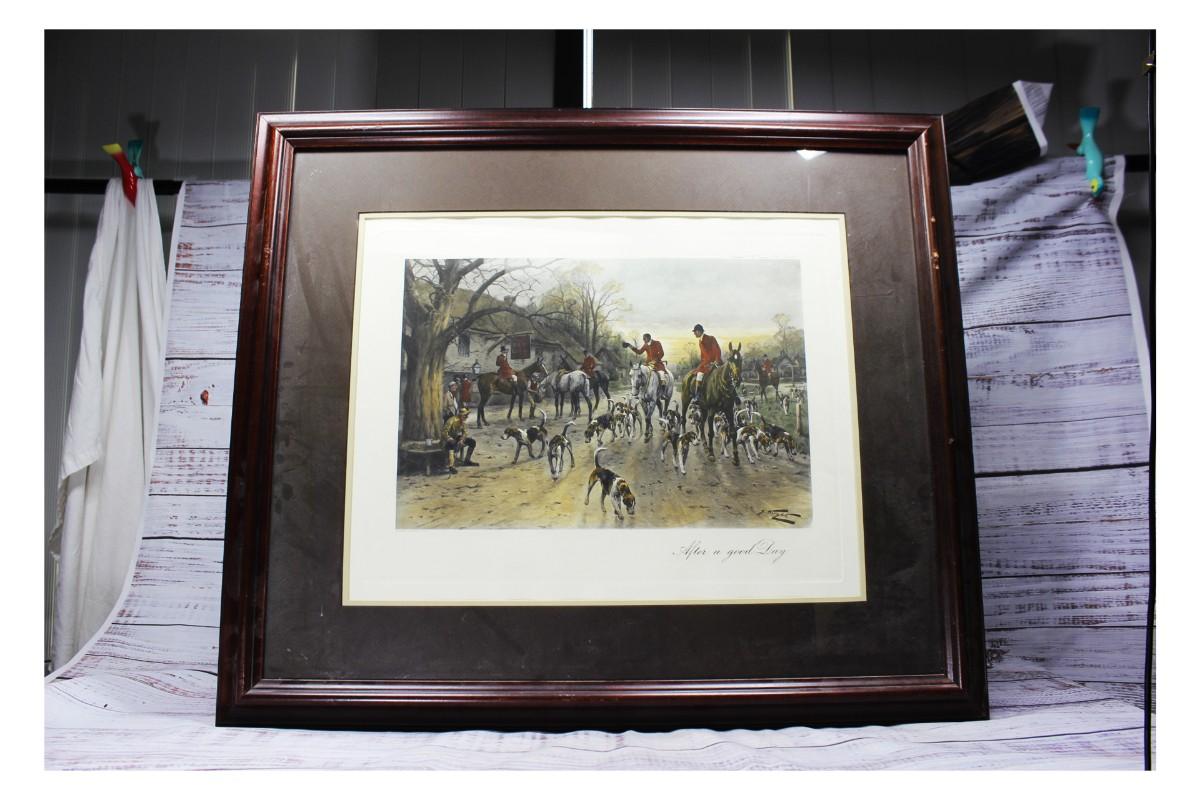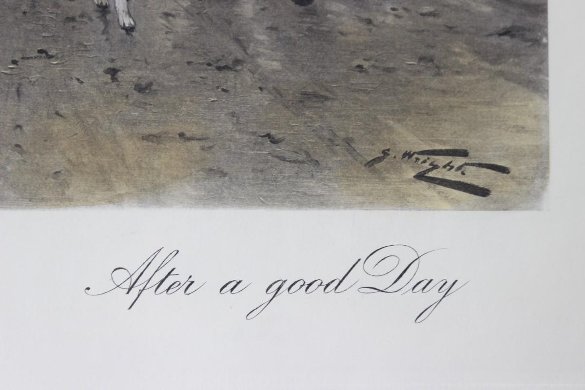 Vintage Framed George Wright Colored Etching After A Good Day, there are no cracks or chips to the frame and protective glass. Check pictures for more details and for sizing.