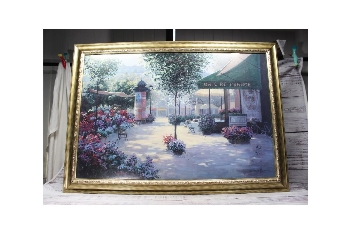 Vintage Framed Print My Favorite Cafe by Christa Kieffer, there is one side of the frame that is damaged and loose, but there are no other cracks or chips to the protective glass or frame. Check pictures for more details and for sizing