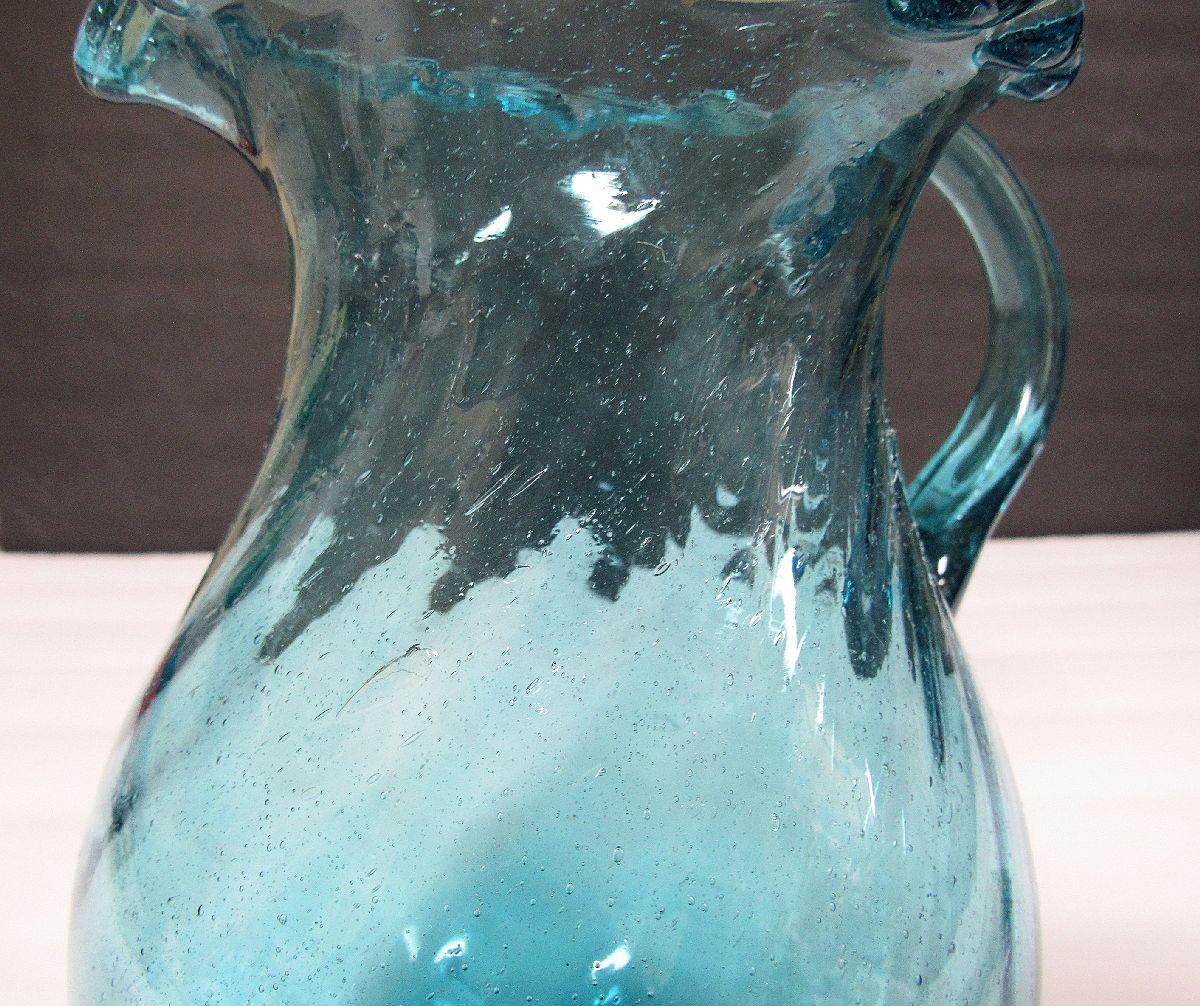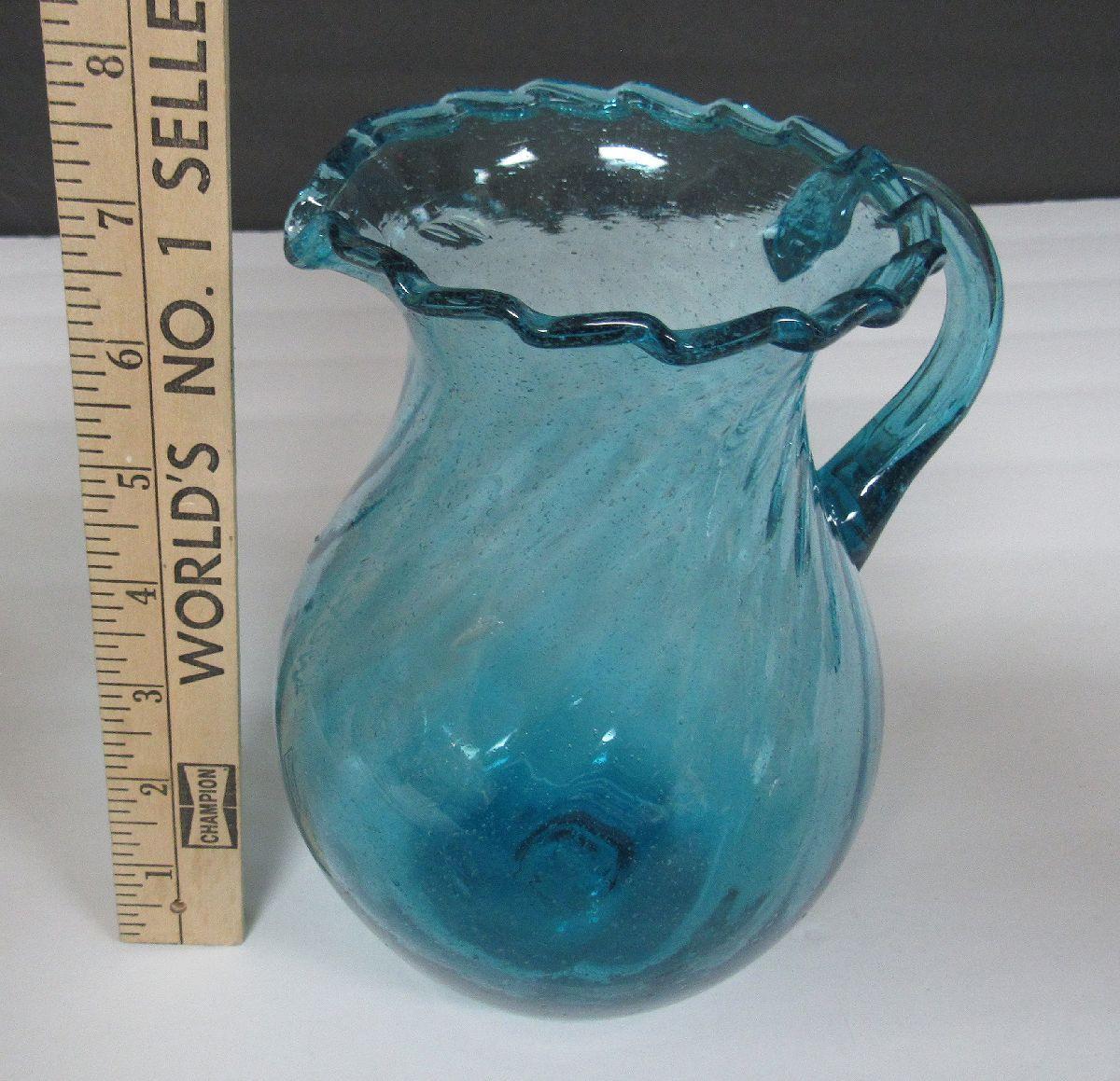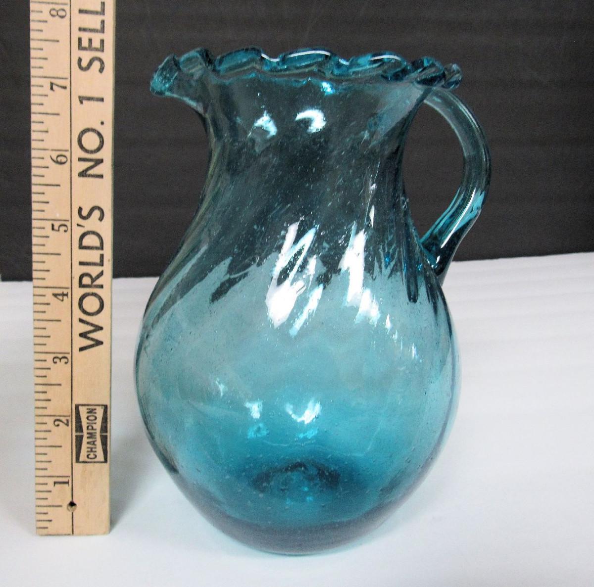 Mid Century Teal Colored Pitcher, Ruffled Rim, Tiny Bubbles Throughout, Pontil