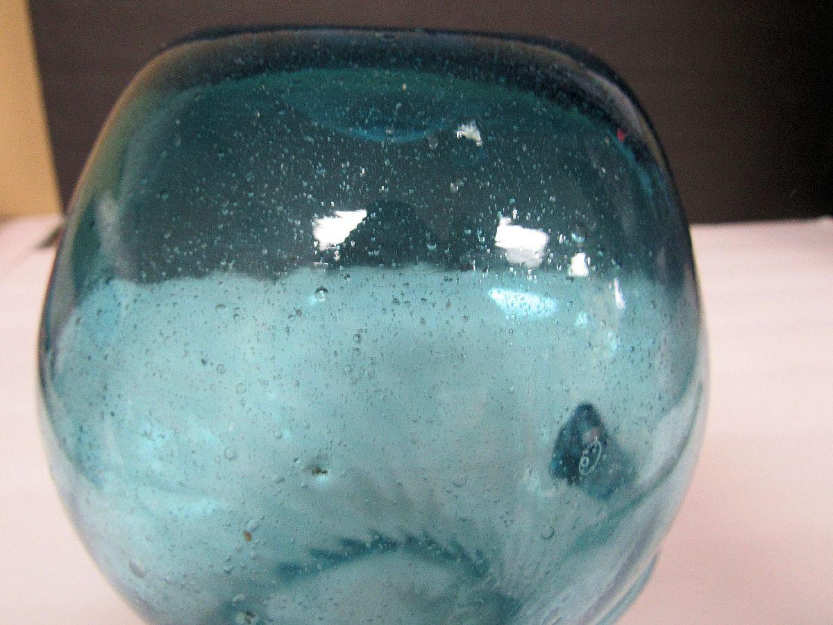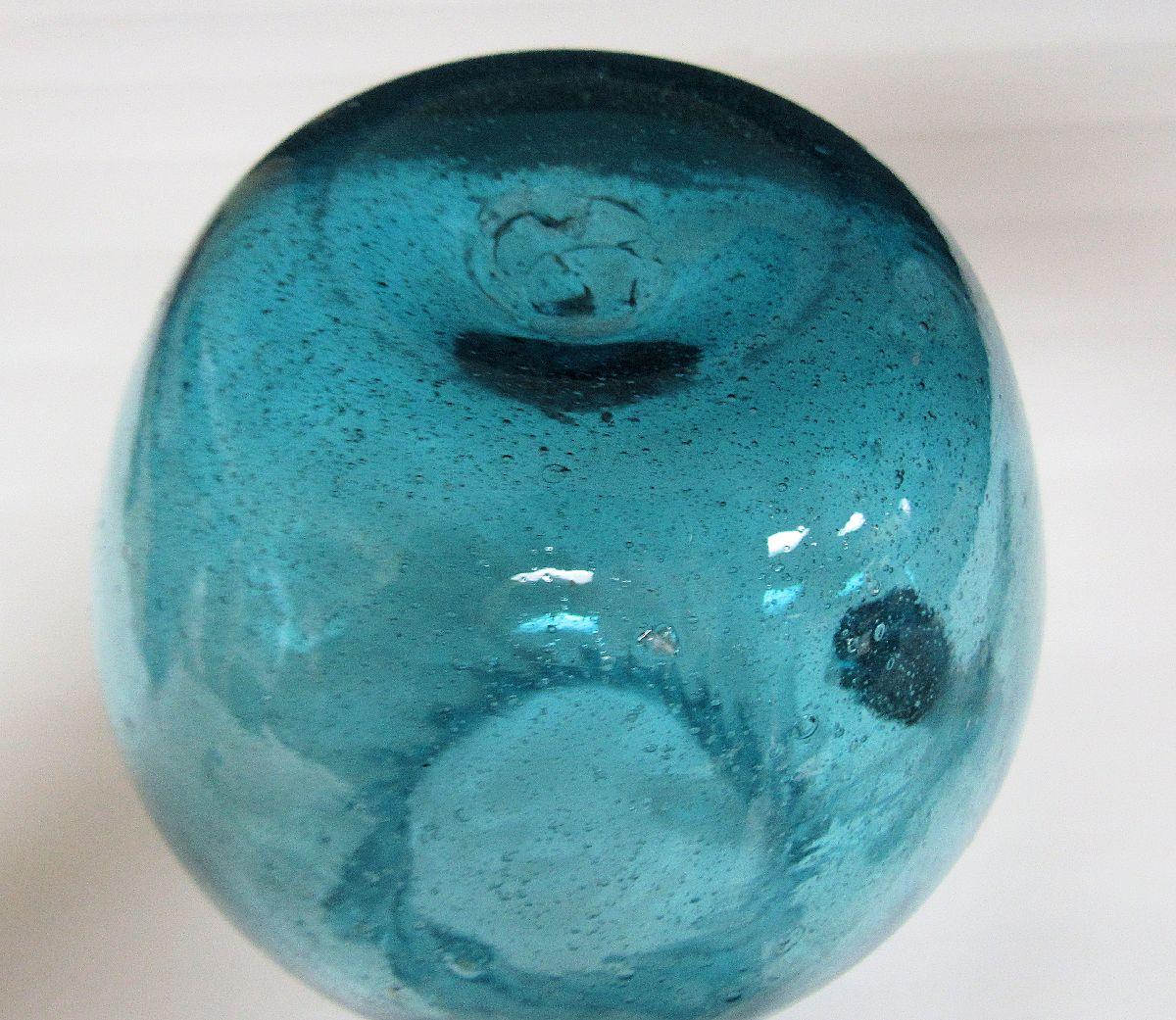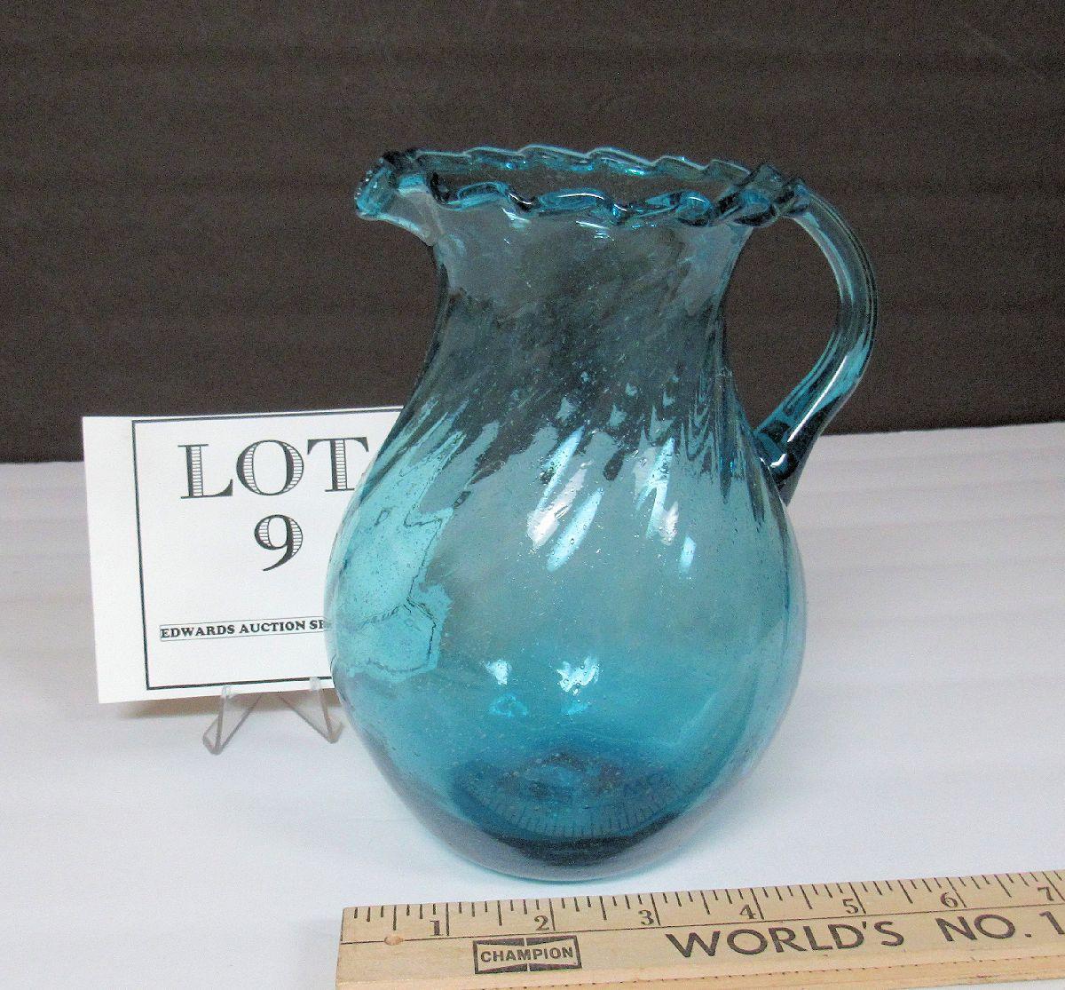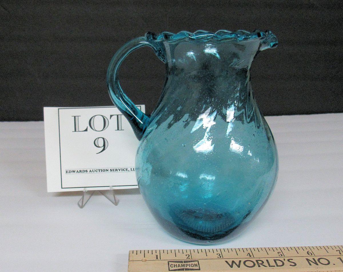 Mid Century Teal Colored Pitcher, Ruffled Rim, Tiny Bubbles Throughout, Pontil