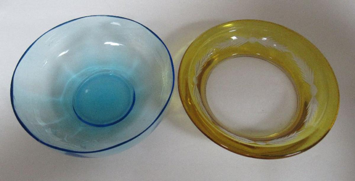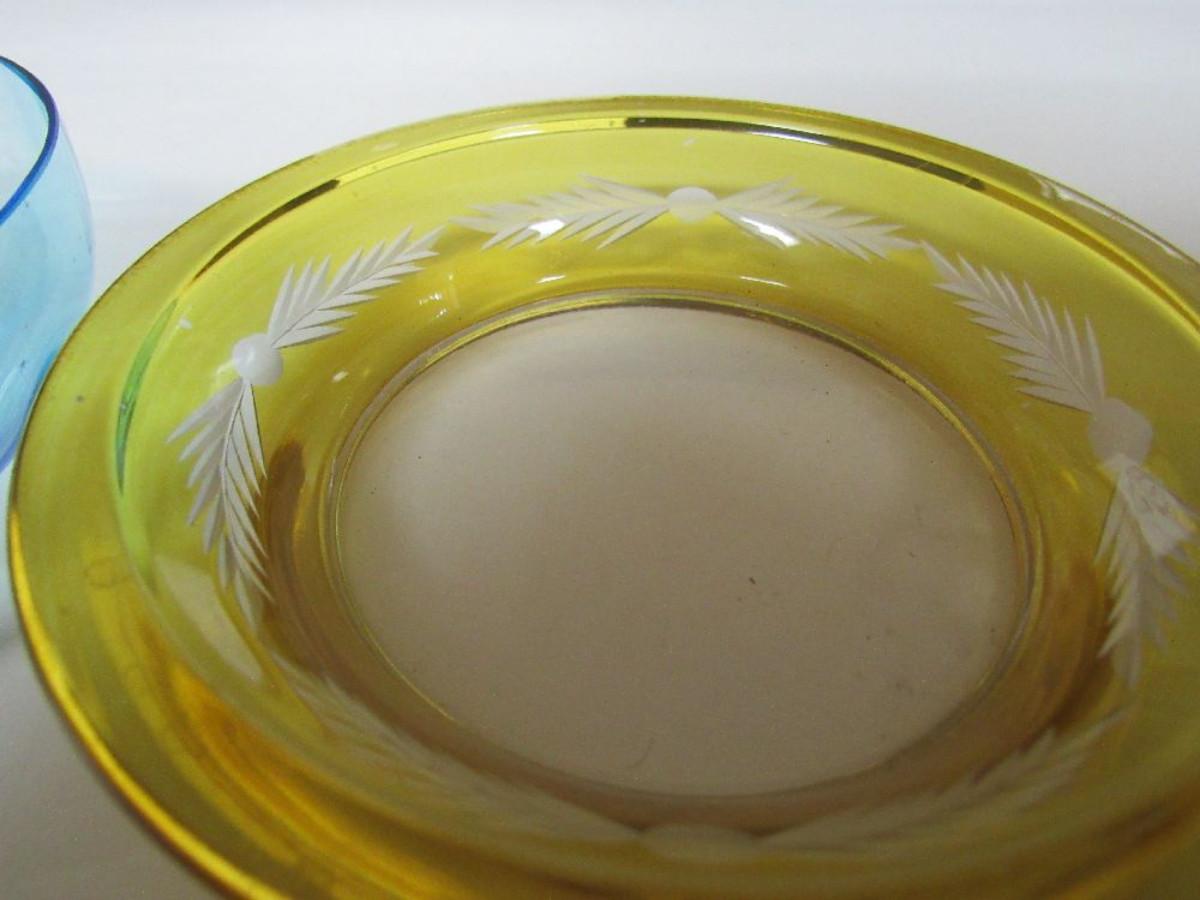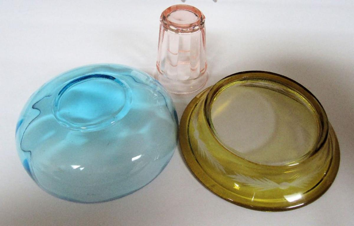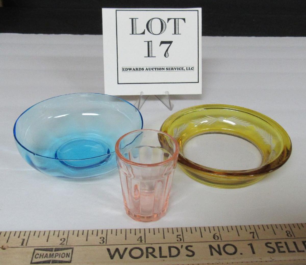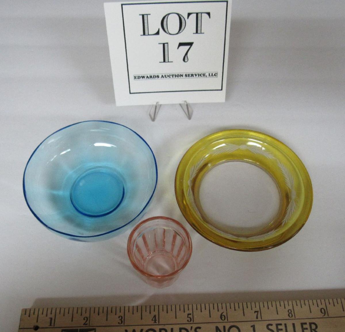 Vintage Glassware Lot, Cut to Clear Small Dish, Depression Glass Shot Glass, Small Blue Bowl