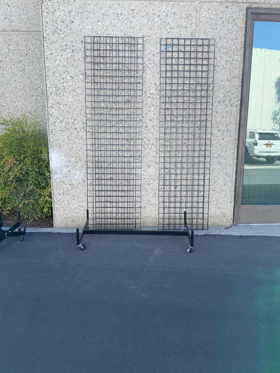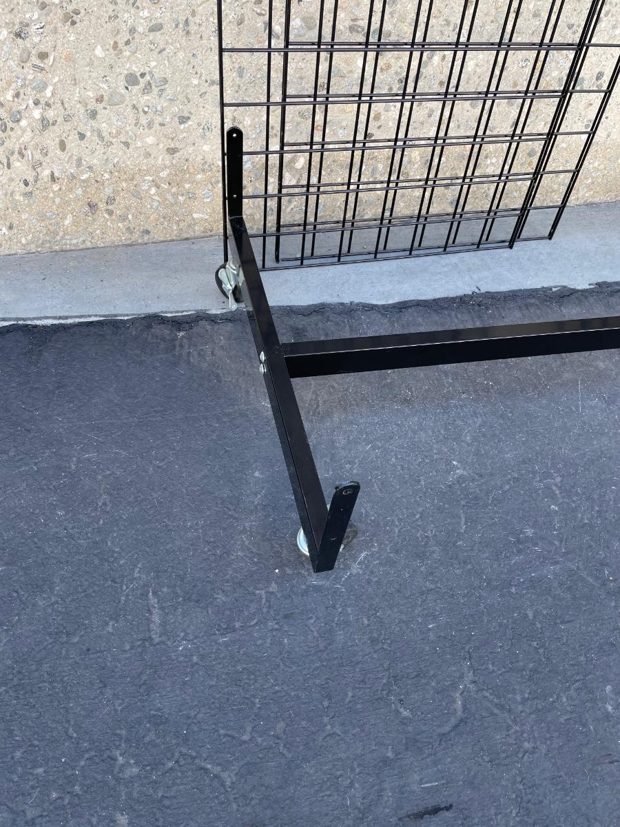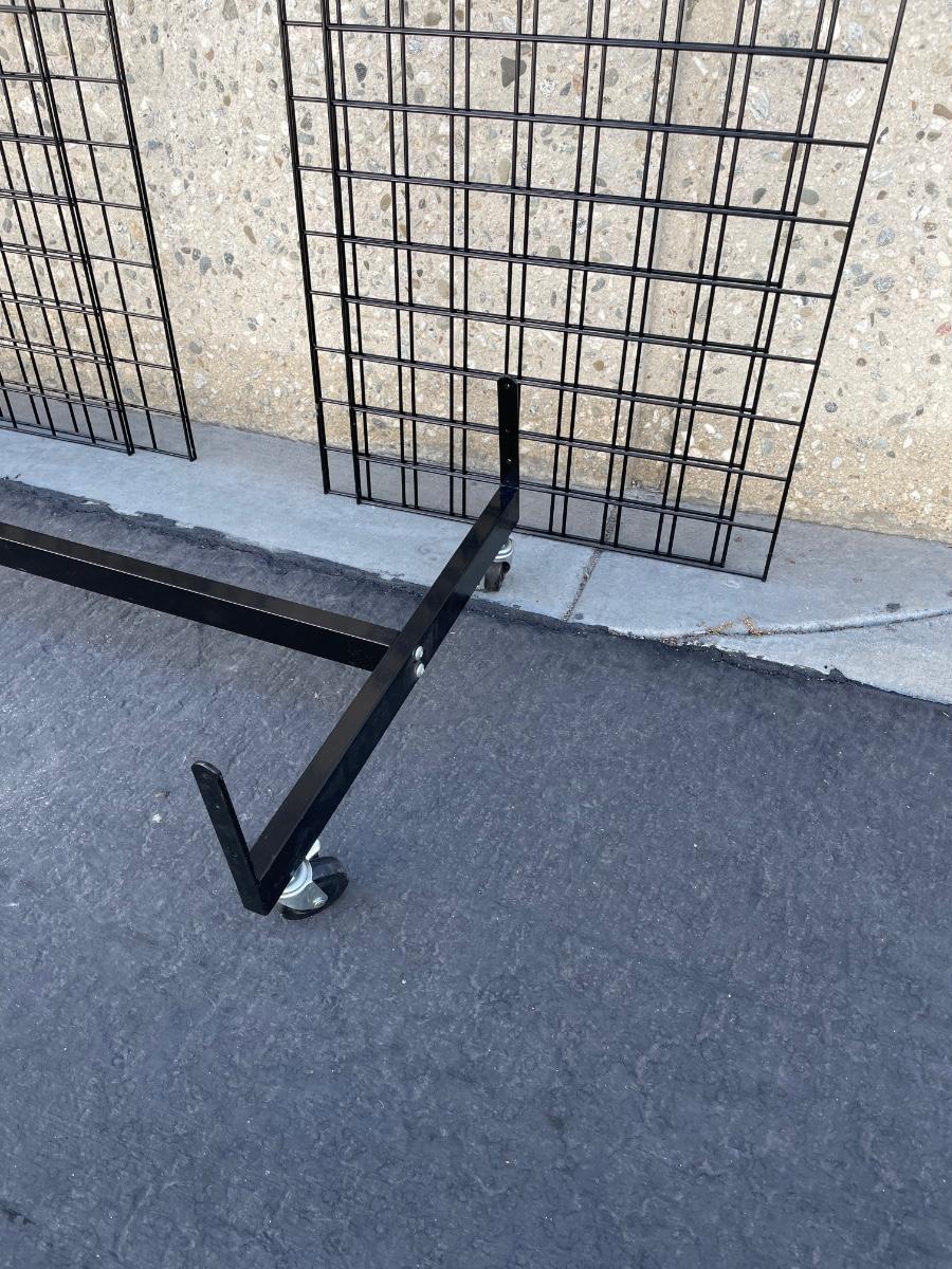 Rolling display rack. Includes set of 6 joining clips for connecting wire panels to each other. May need some additional fasteners or hardware to connect panels to rolling base.