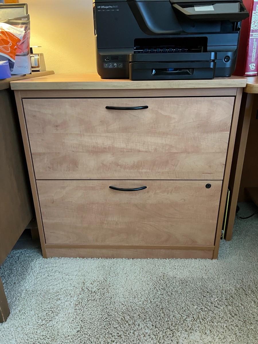 There is no significant damage to the desk or filing cabinet and is in overall good useable or displayable condition. Check pictures for more details and for what comes in the lot. Does not come with the items on or in the desk and file cabinets.