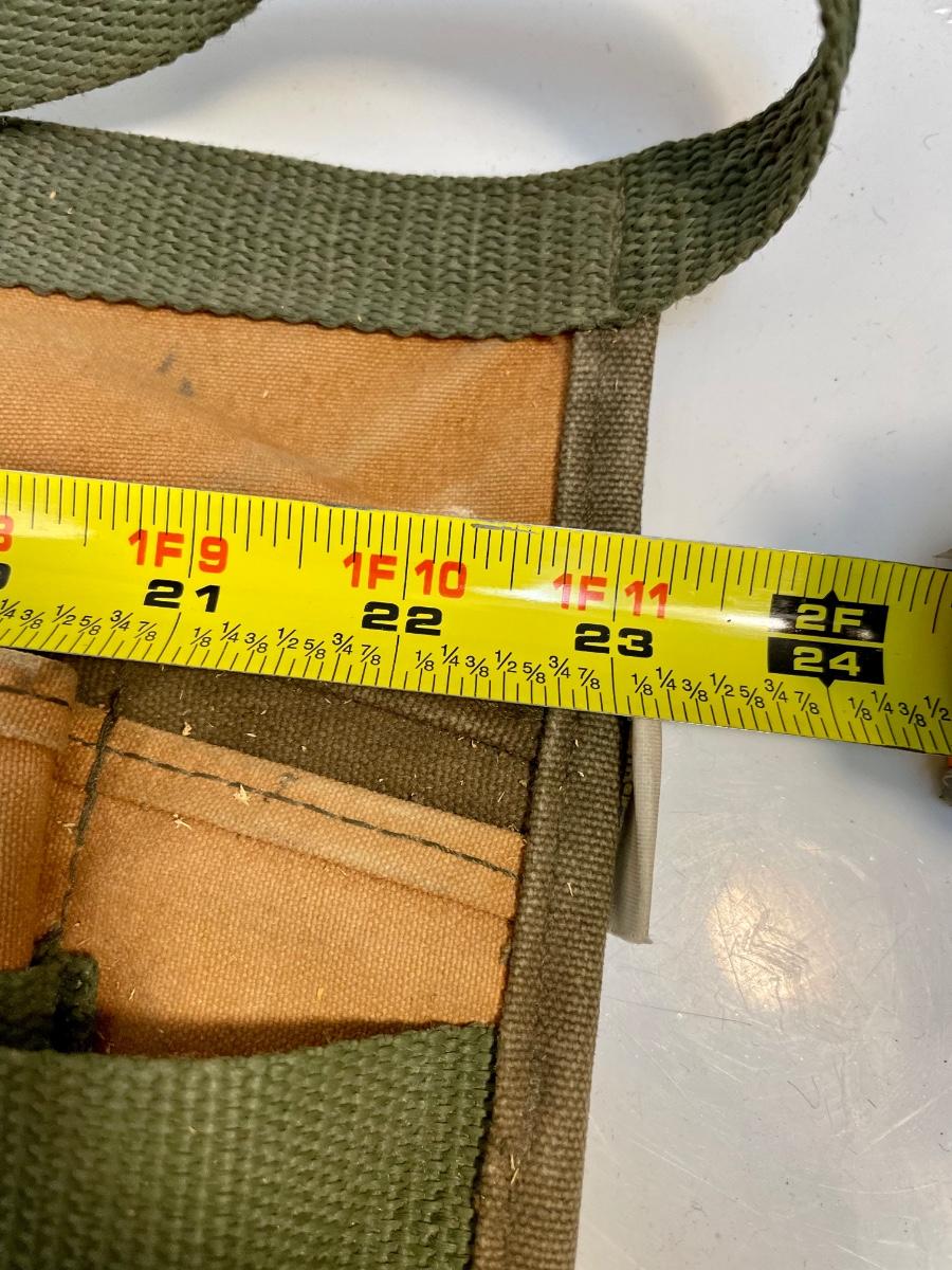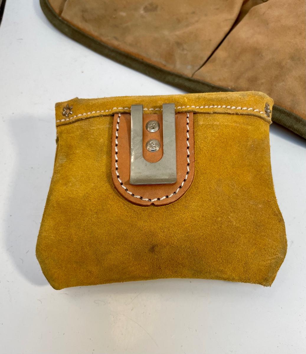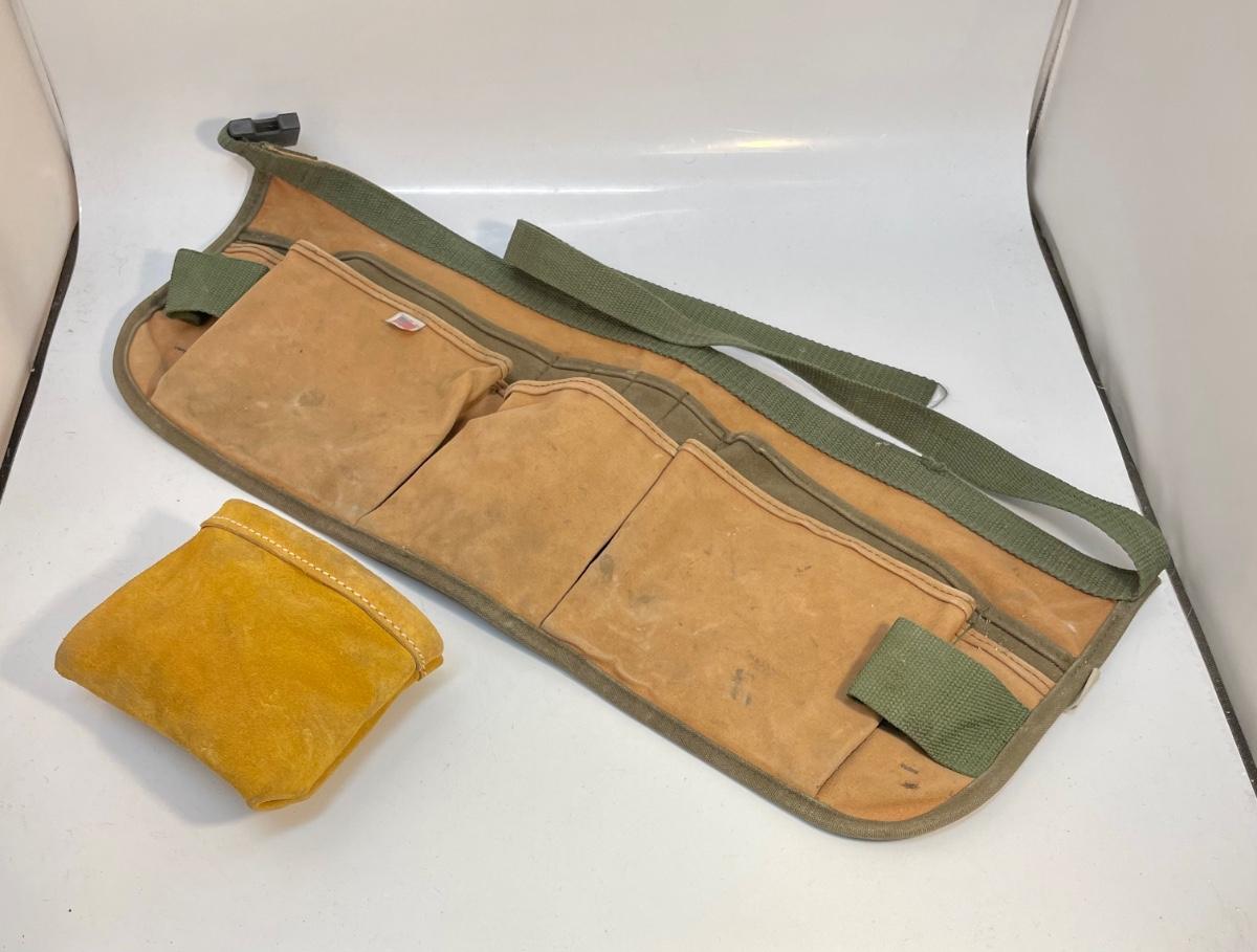Leather tool belt with 3 separate pockets and 2 tool loops (for things like hammers). Has an adjustable quick-release belt. Also a separate leather clip-on pouch, can easily hold a 25' tape measure.