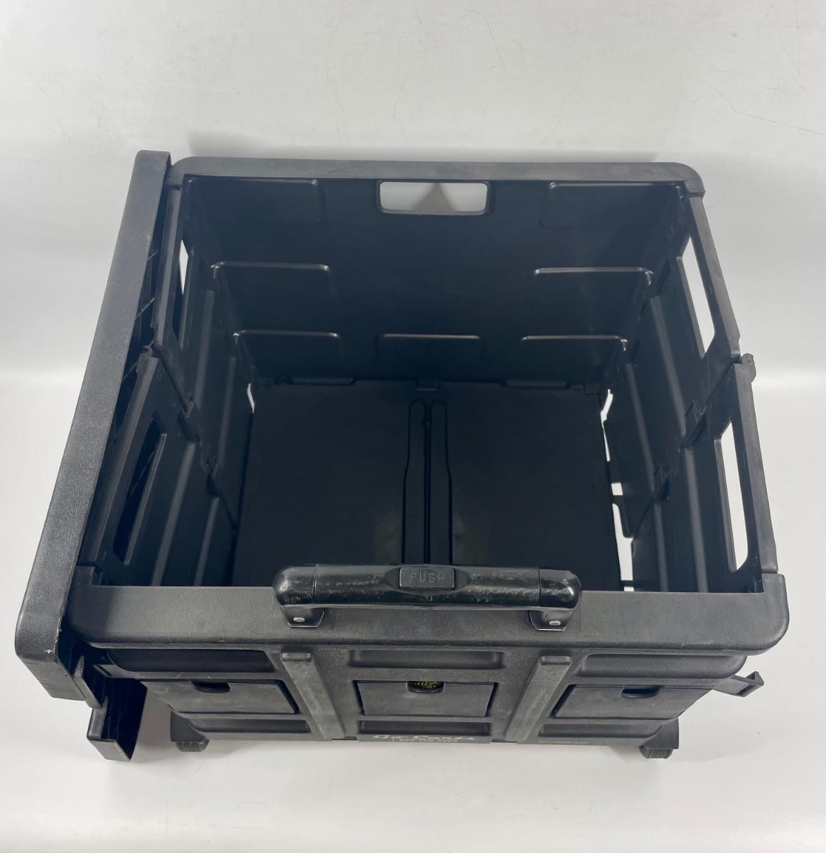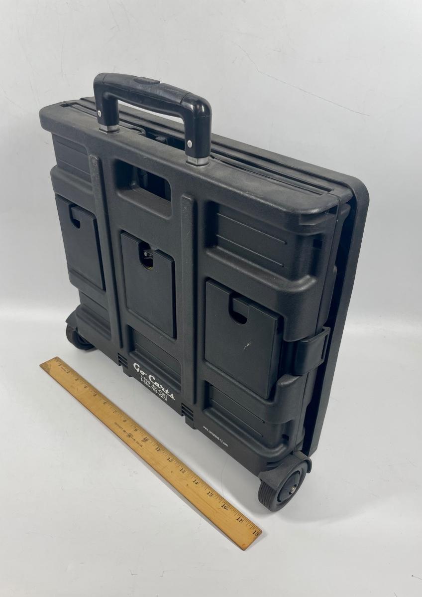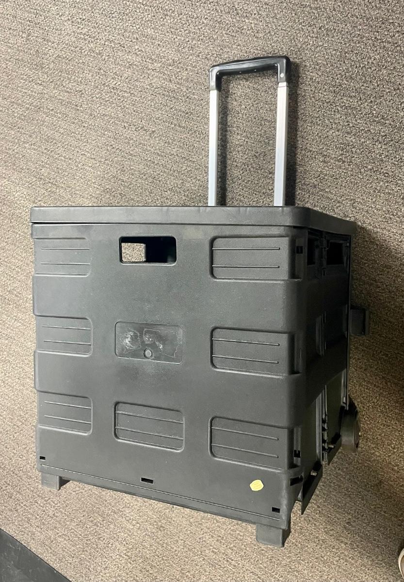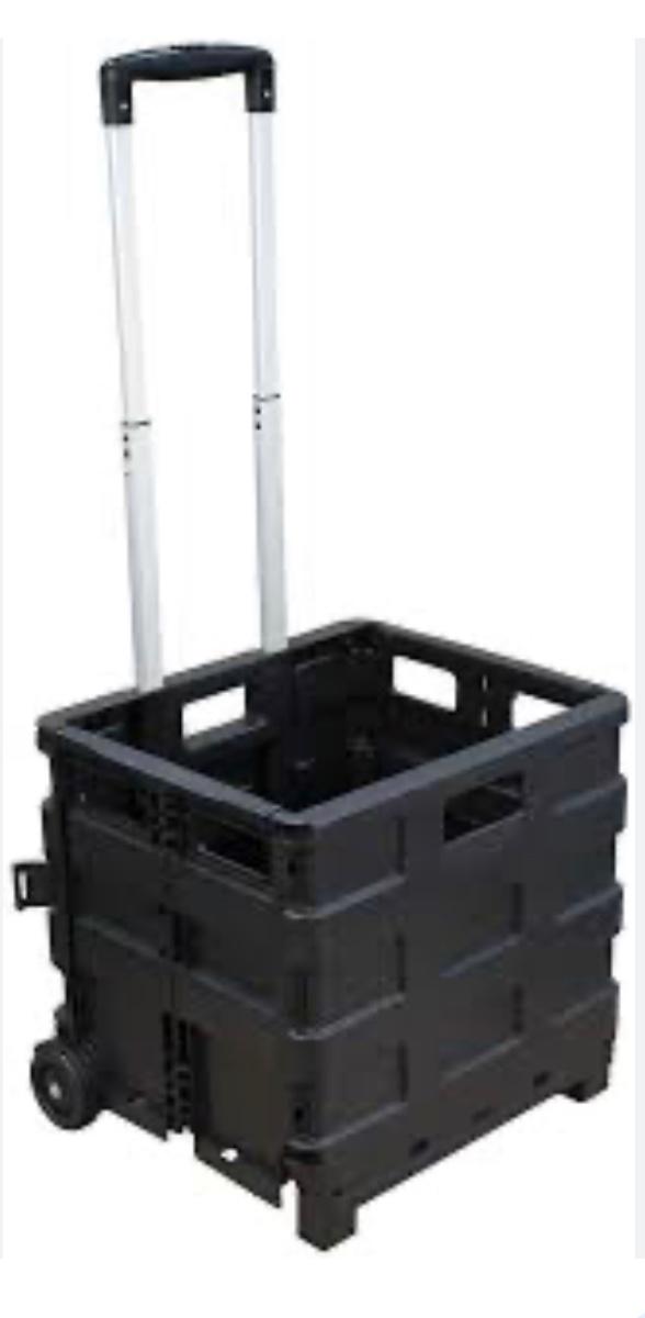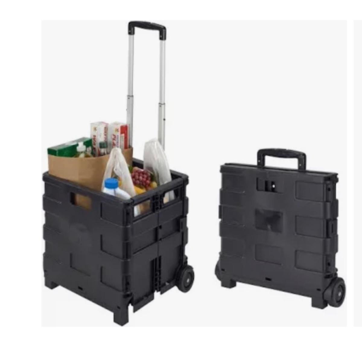 Collapsible Rolling Utility Cart with Snap-on Cover and Telescopic Handle, Made by Go-Carts. Measures approx. 17" high x 17" wide x 15" deep when open, is less than 5" thick when collapsed. Can hold up to 60lbs,