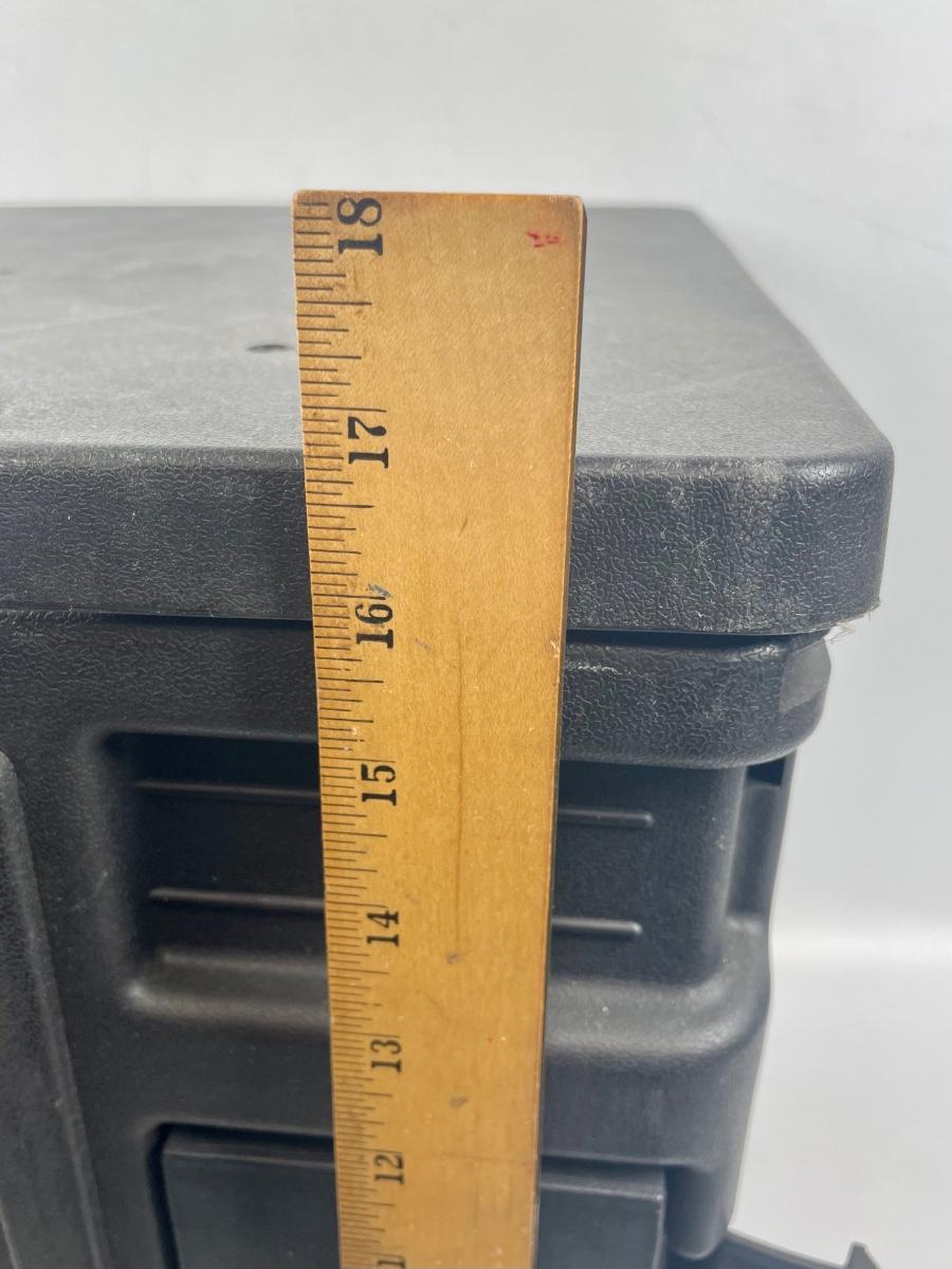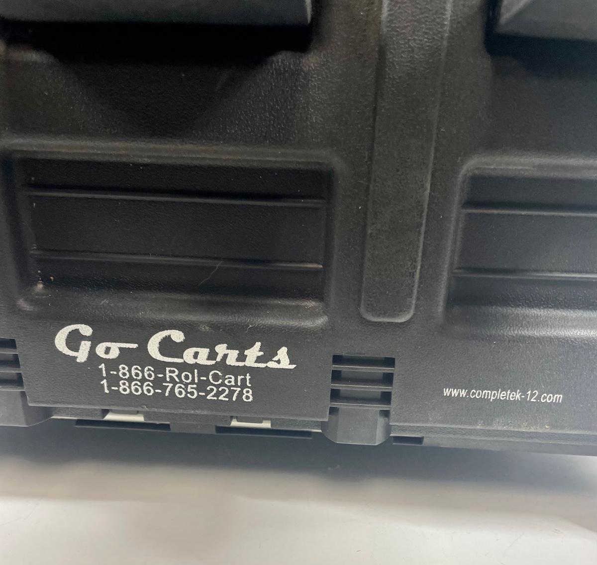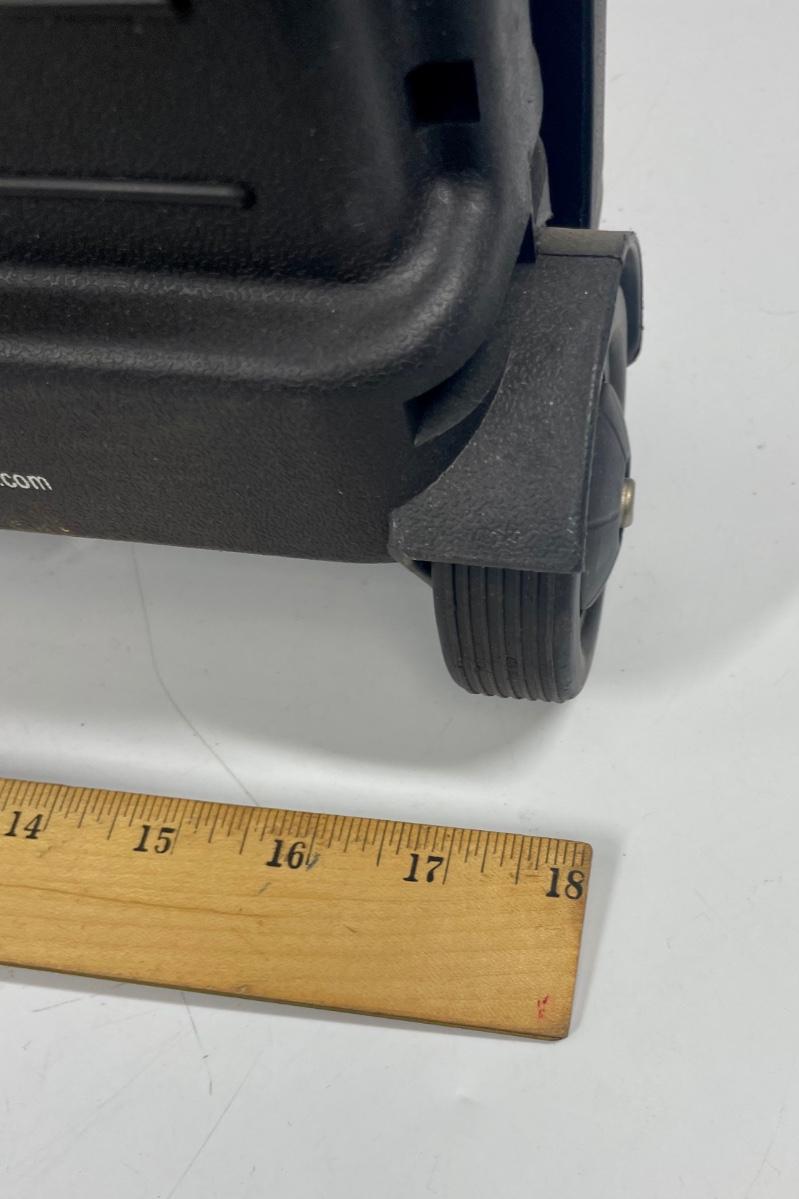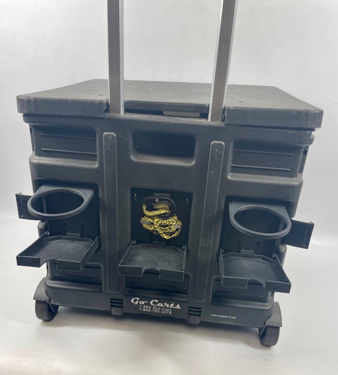 Collapsible Rolling Utility Cart with Snap-on Cover and Telescopic Handle, Made by Go-Carts. Measures approx. 17" high x 17" wide x 15" deep when open, is less than 5" thick when collapsed. Can hold up to 60lbs,