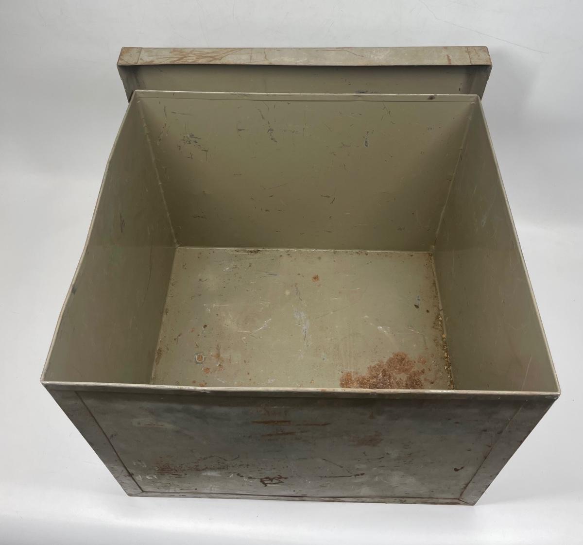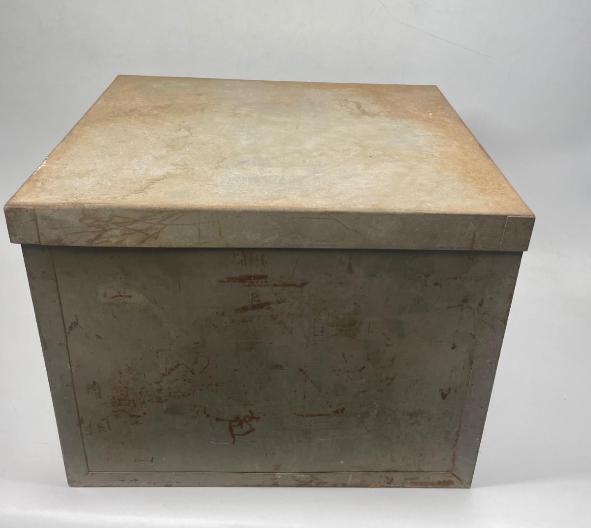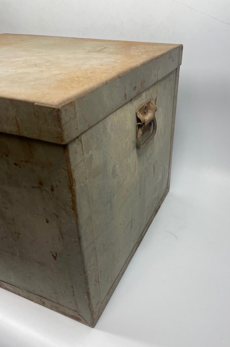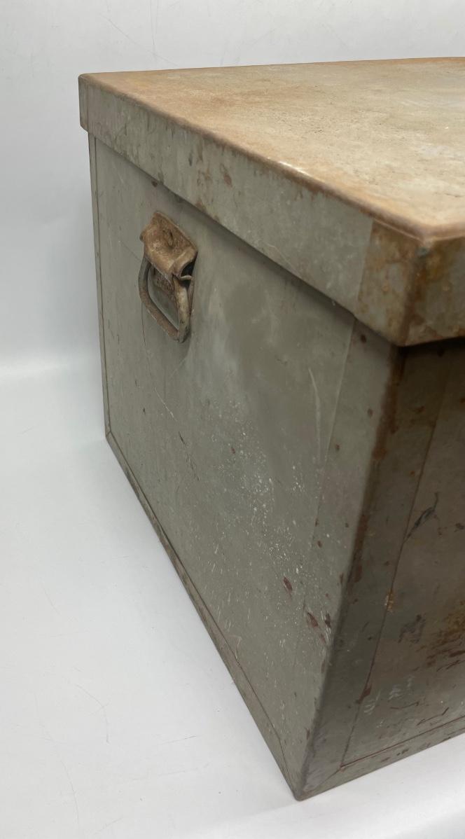 Steel storage box with side handles and tight-fitting lid. Very solid, small amounts of surface rust.