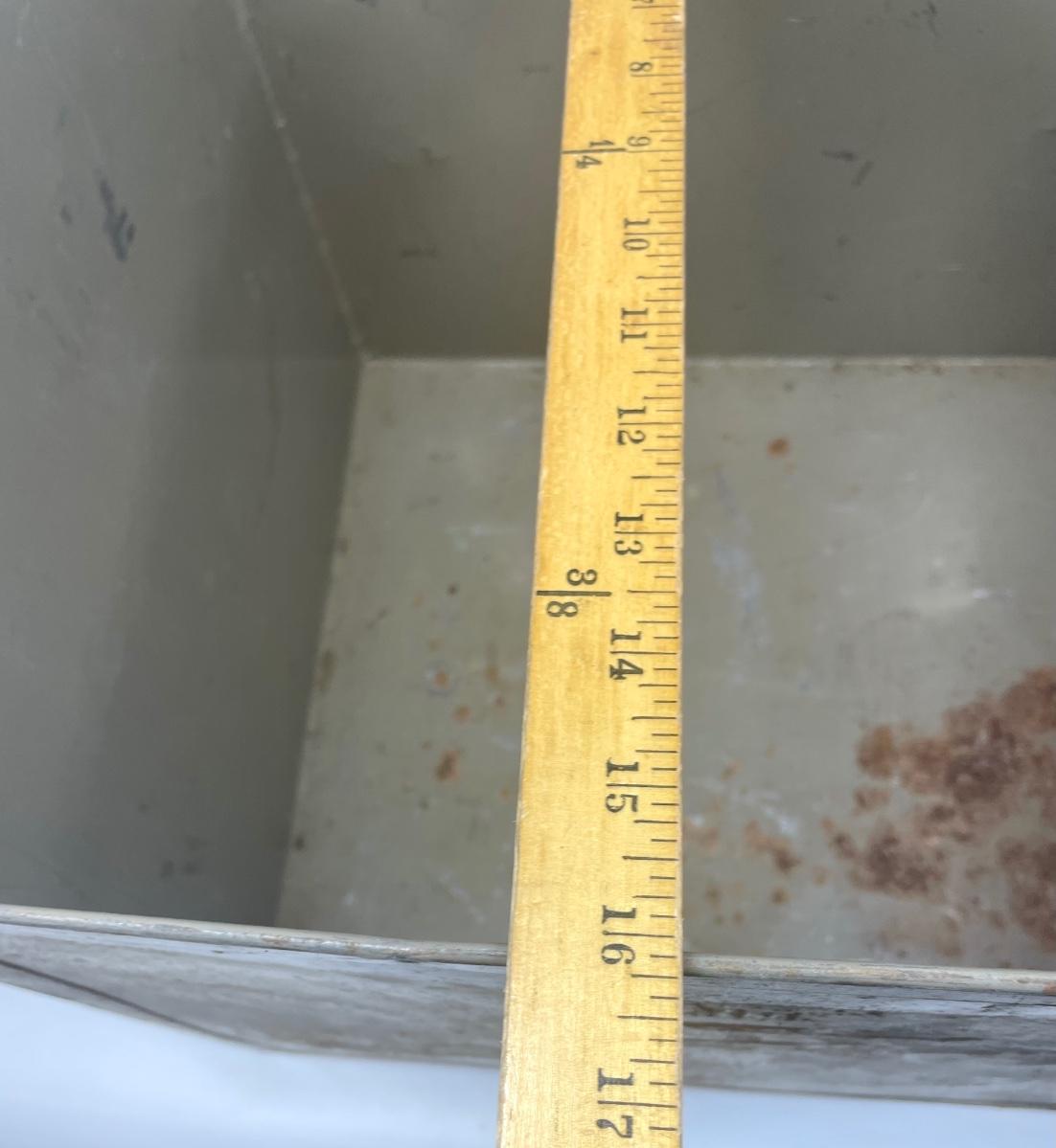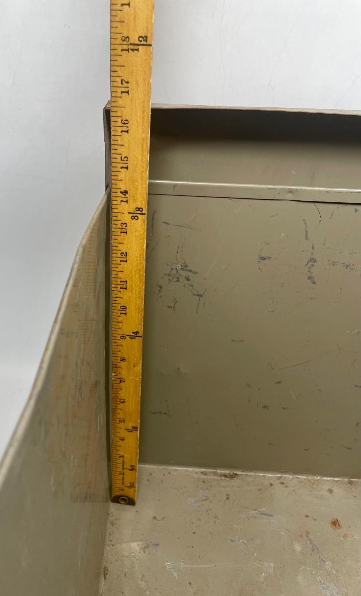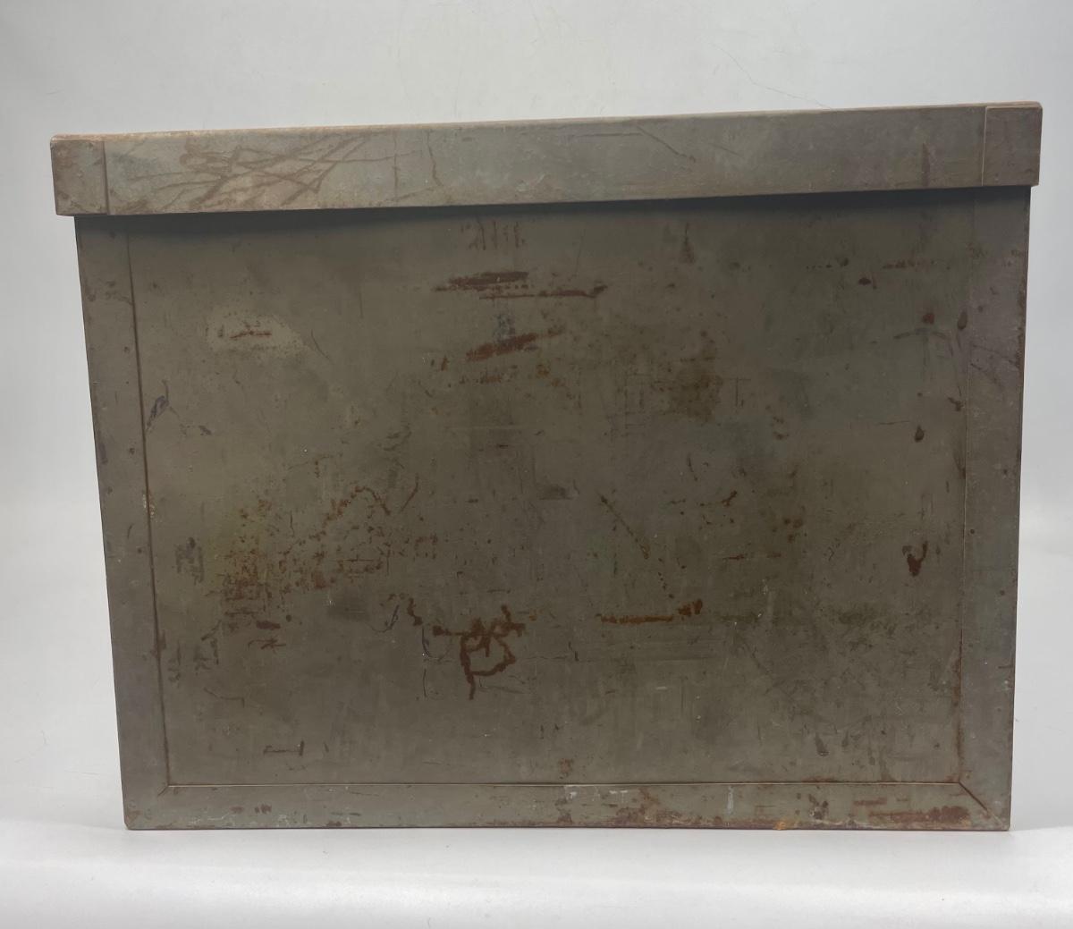 Steel storage box with side handles and tight-fitting lid. Very solid, small amounts of surface rust.