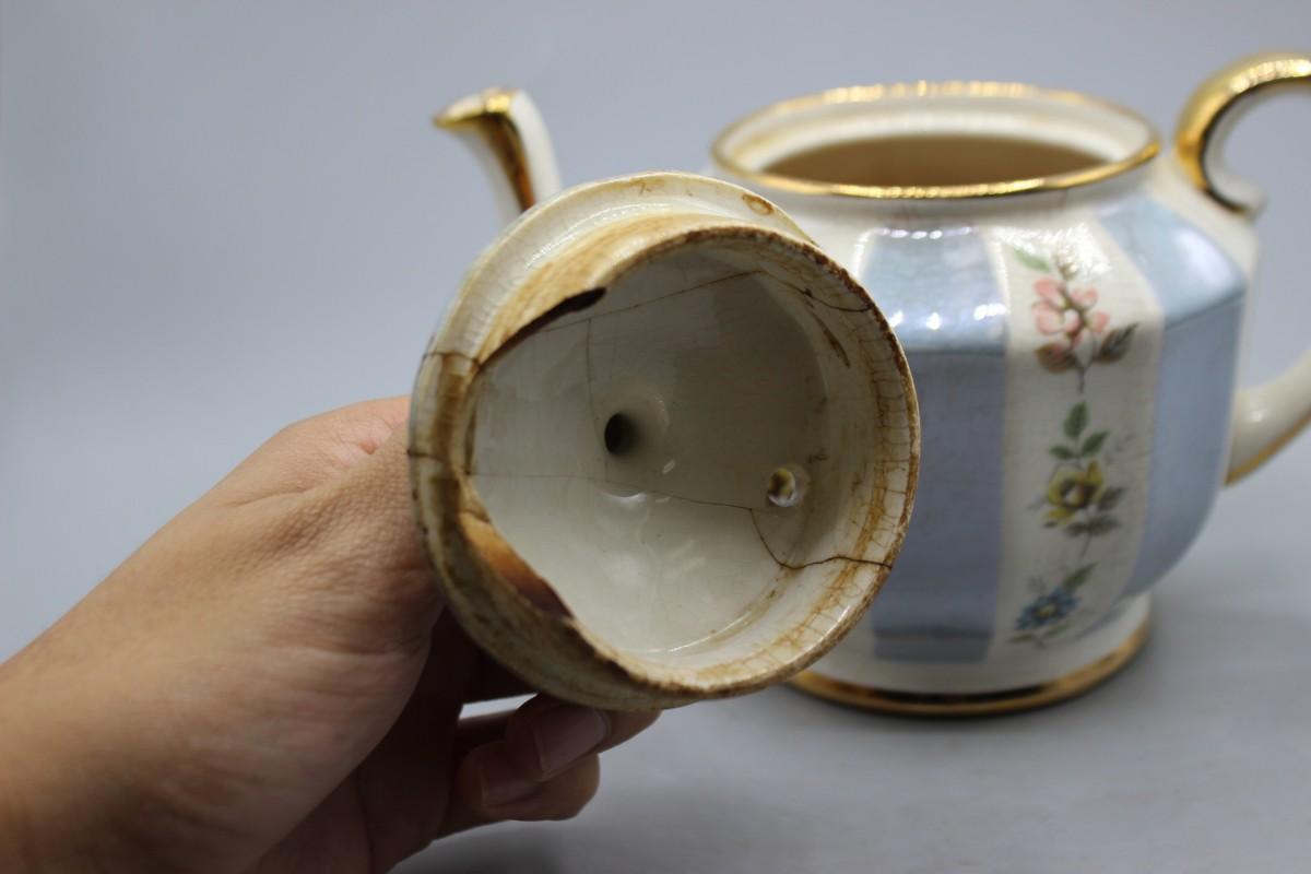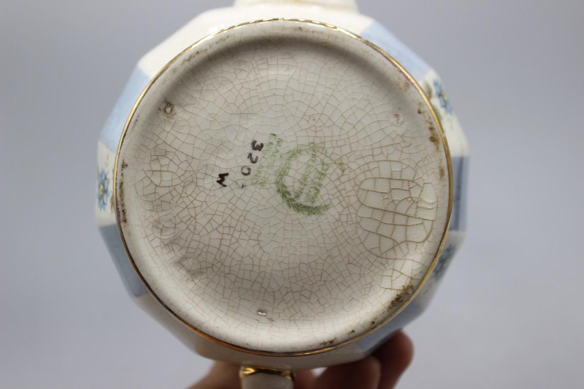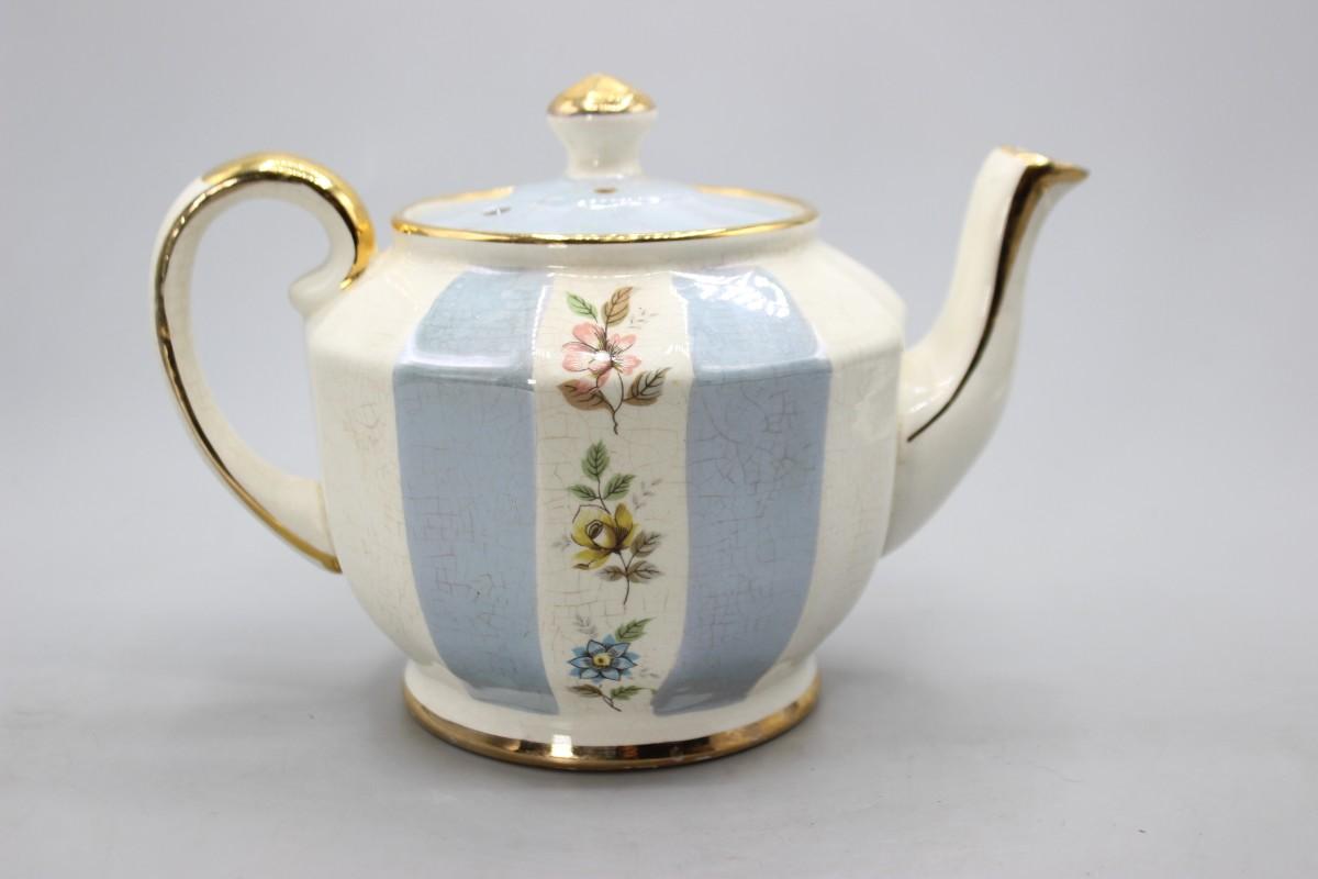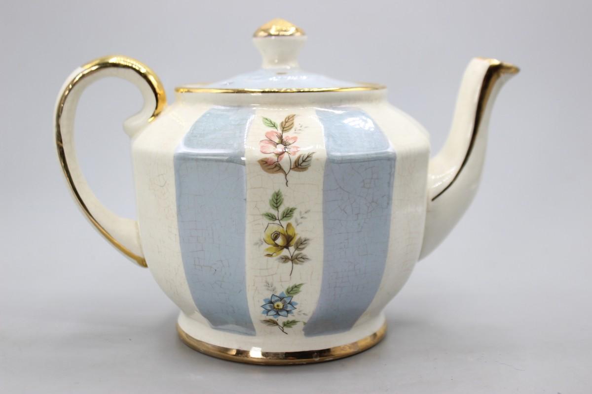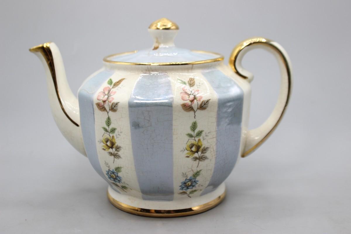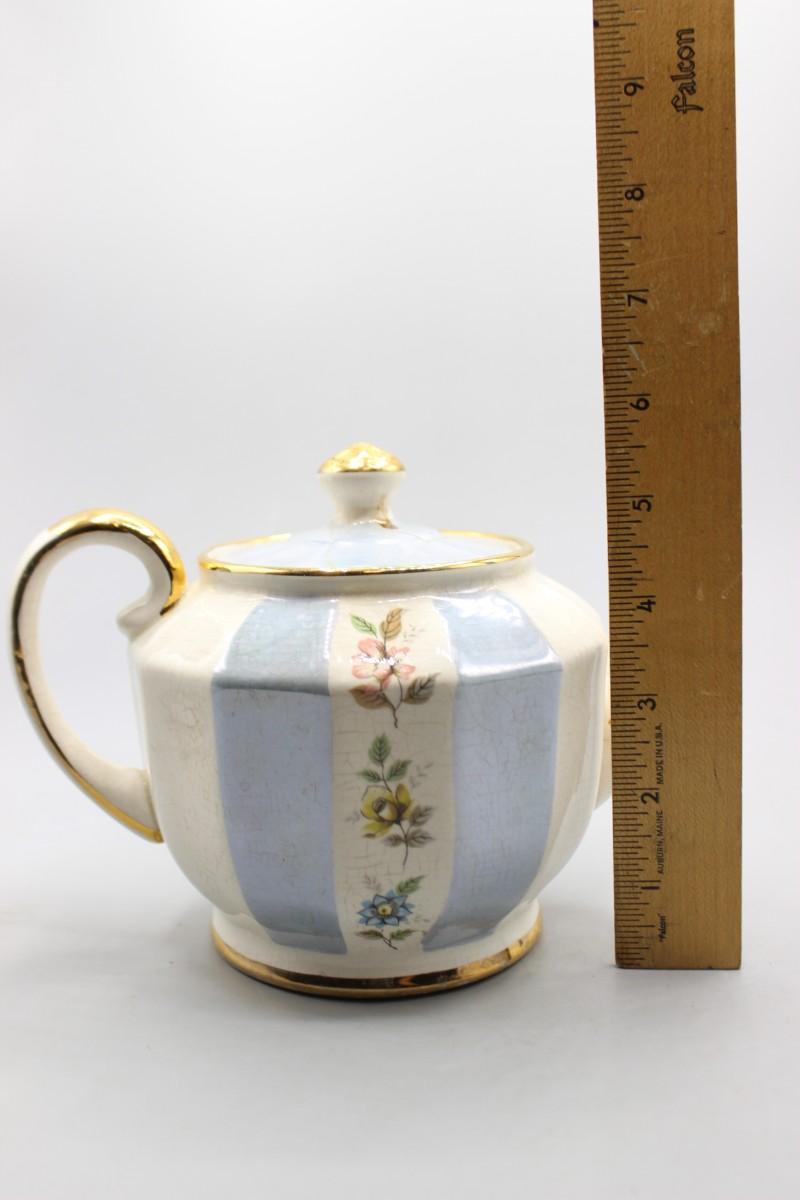 Antique Vintage Porcelain Teapot Blue Striped with Flowers for Display