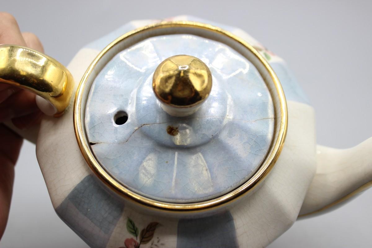 Antique Vintage Porcelain Teapot Blue Striped with Flowers for Display. Heavy crazing and lid has been repaired. Good for display or repurposing.
