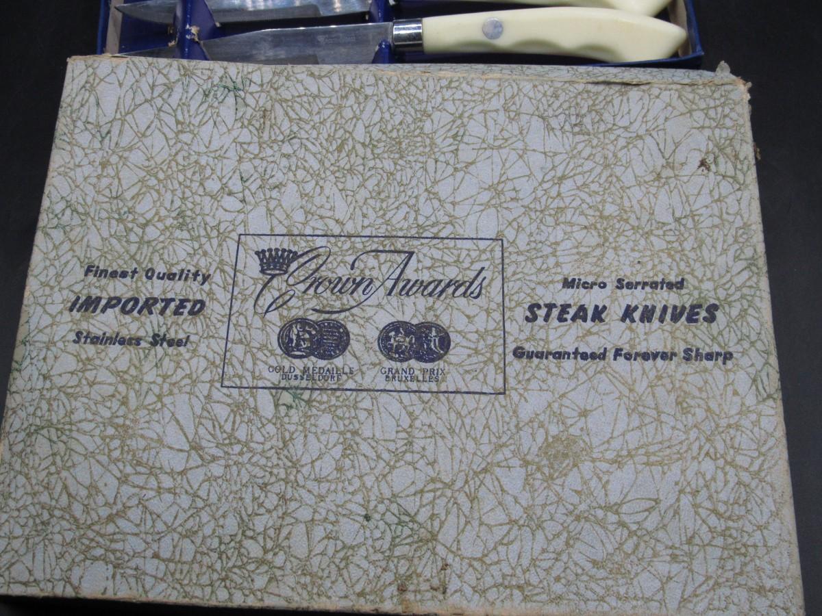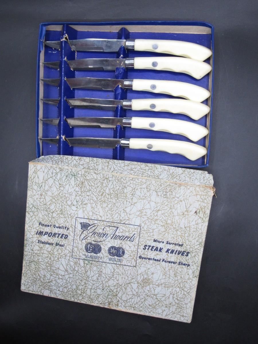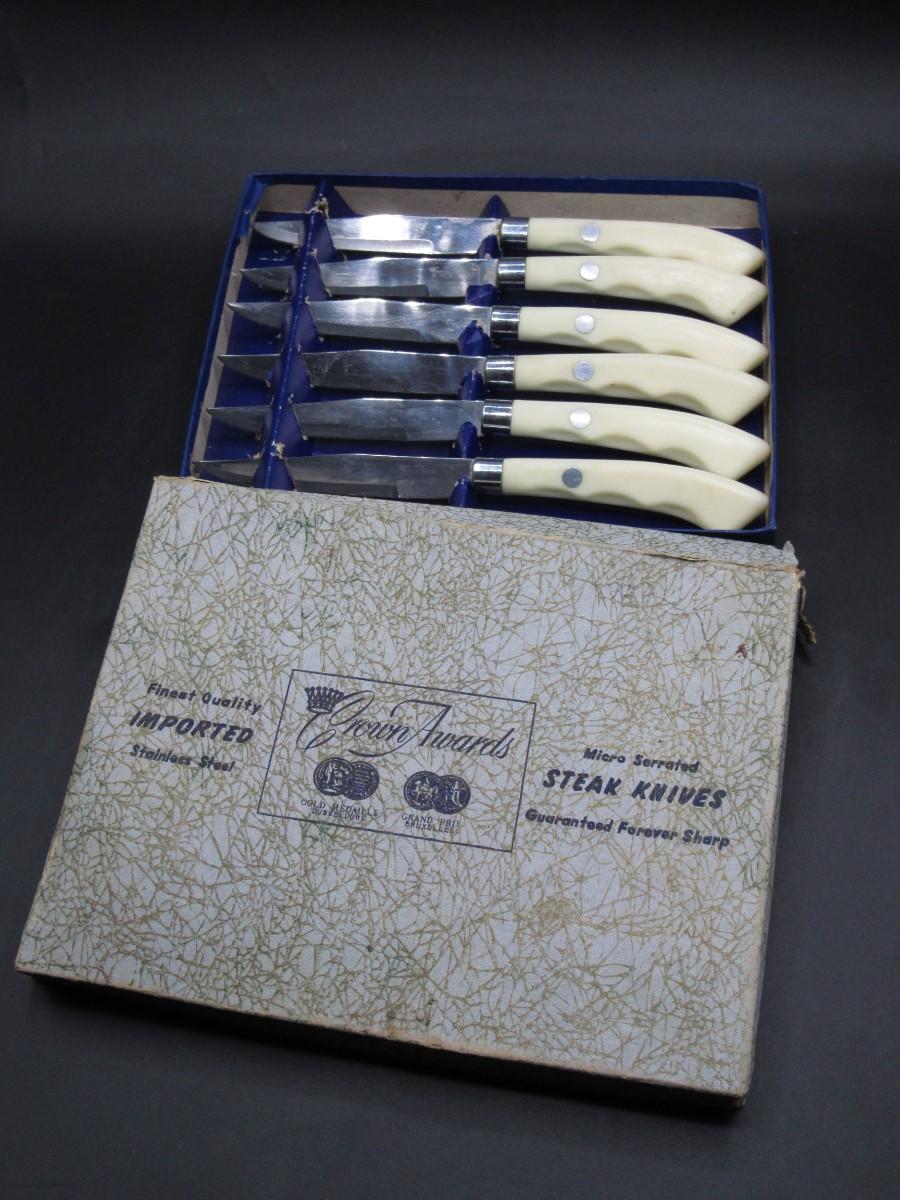 Vintage Crown Awards Micro Serrated Steak Knives Stainless Steel Gold Medal Dusseldorf Grand Prix Bruxelles