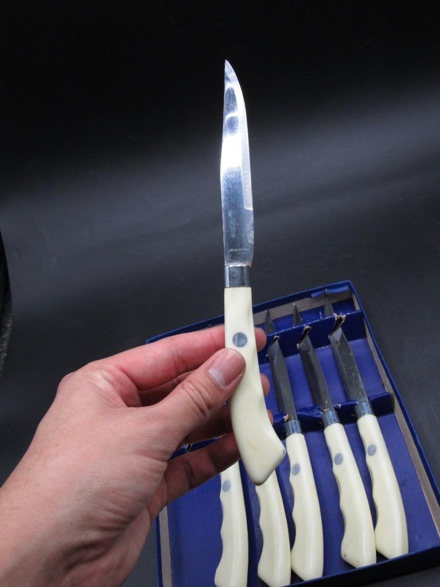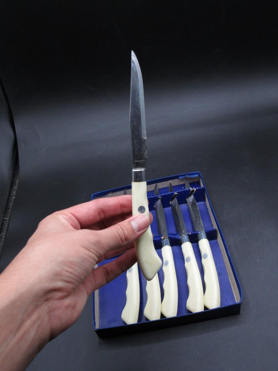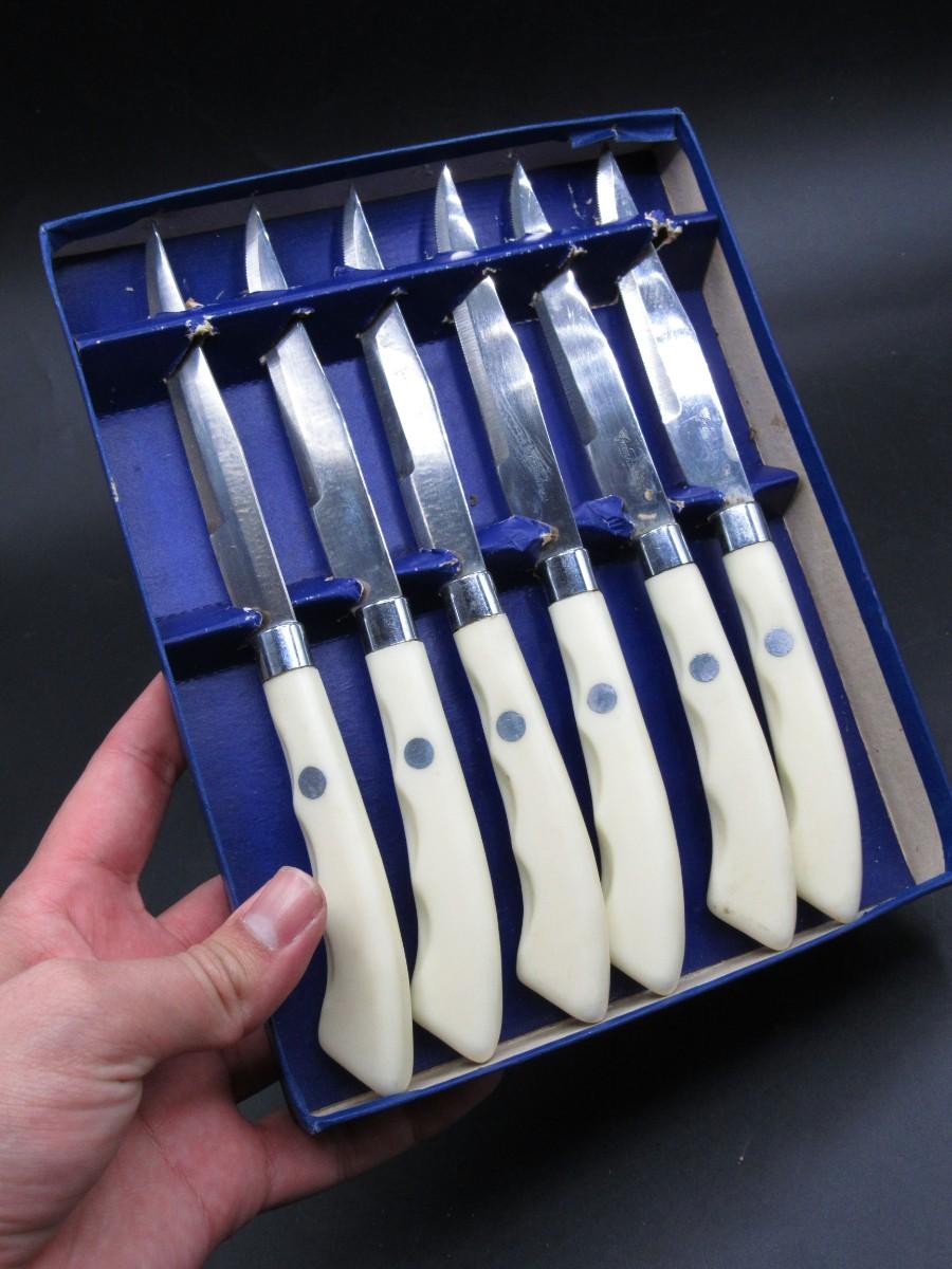 Vintage Crown Awards Micro Serrated Steak Knives Stainless Steel Gold Medal Dusseldorf Grand Prix Bruxelles