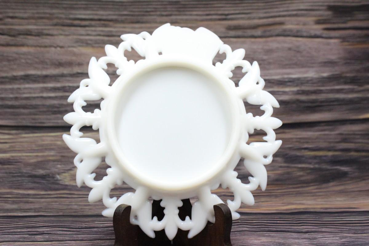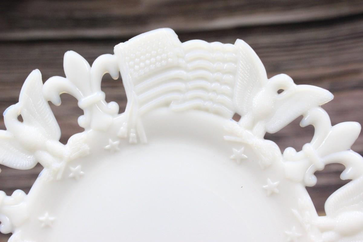 Antique White Milk Glass Patriotic Plate Adorned with Stars, Eagles, and American Flag. There's no chips or cracks to plate and is in good condition, see pictures for more details.