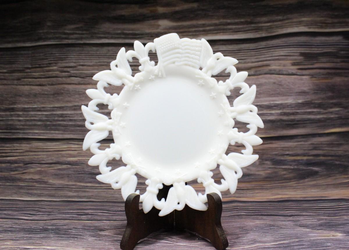 Antique White Milk Glass Patriotic Plate Adorned with Stars, Eagles, and American Flag