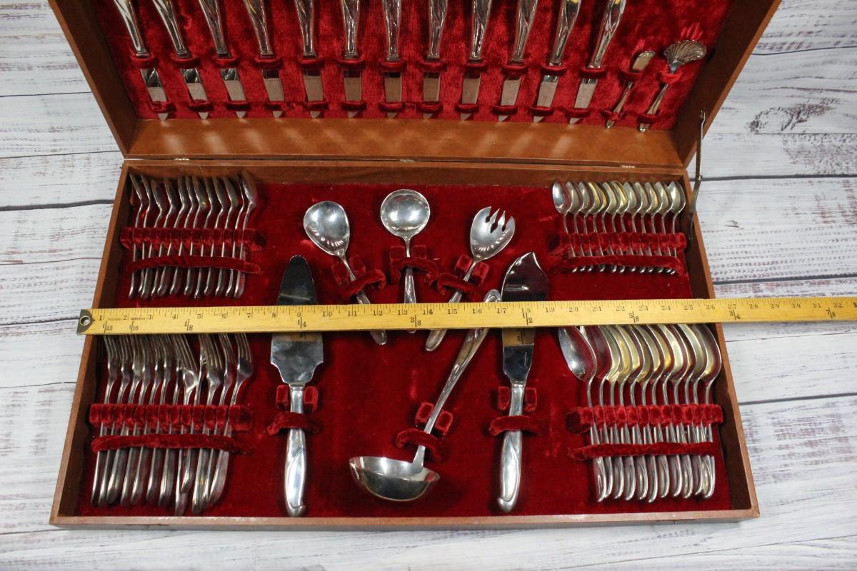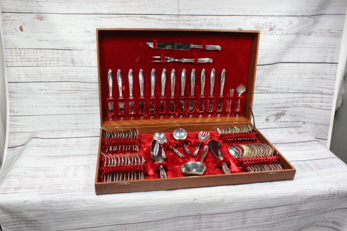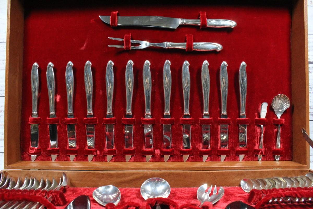 Vintage sterling silver flatware, service for 12 plus serving pieces. Marked Sterling I.C. on all pieces except knives and meat fork have stainless blades. Total weight is 3904g. Forks and spoons weighed separately from knives to account for proper weight with stainless blades. See photos. Come in huge storage box.