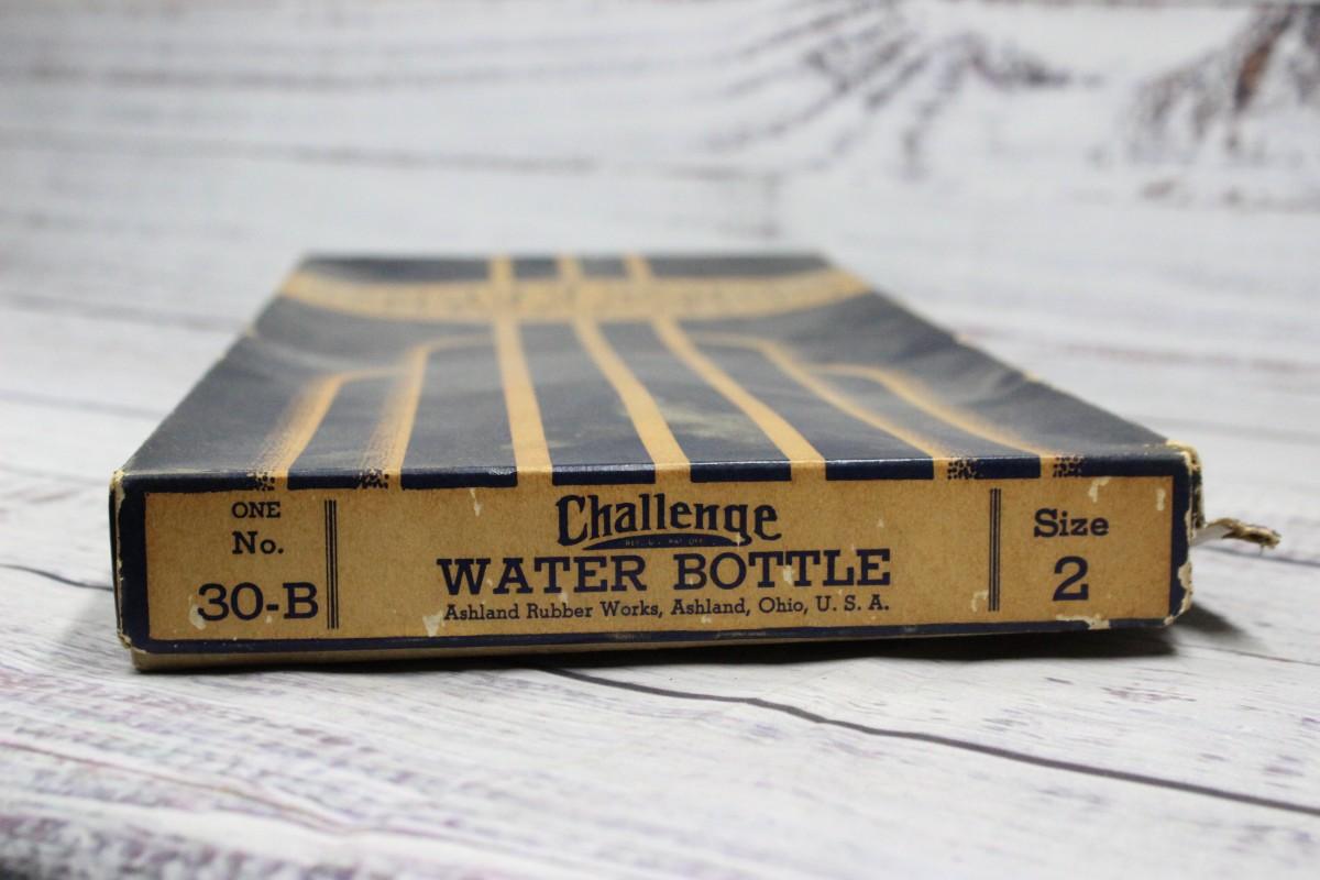 Vintage Challenger Hot Compress Rubber Water Bottle, there is no significant damage to the rubber bottle and is in good working vintage condition. The box is a little worn, check pictures for more details.