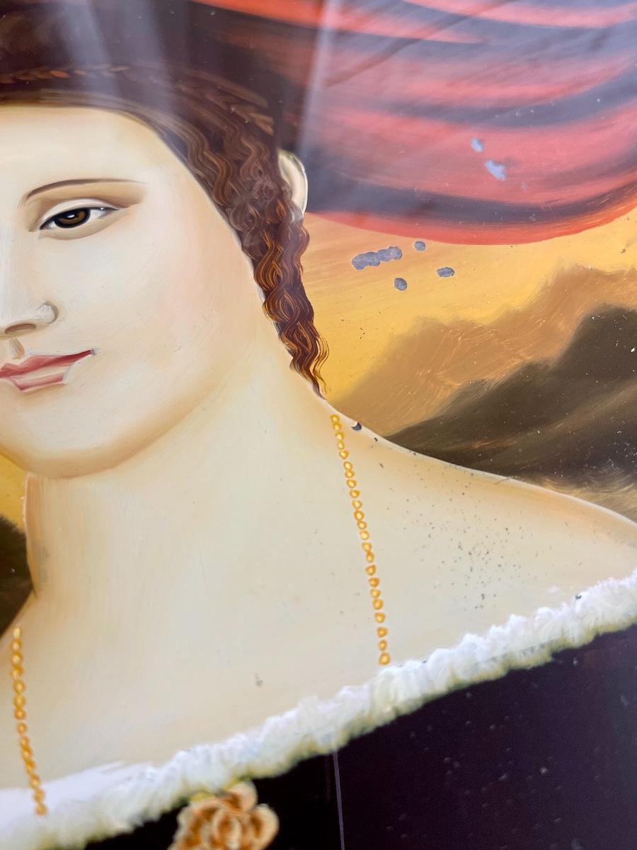 Vintage Hand Painted on Glass Reproduction of Mrs. Minor by Orlando Hand Bears. Looks like it was reverse painted on glass. Measures approx 22” W x 26” H. There's no significant damage to the protective glass or the frame and is in good vintage condition. There is some paint chipping on one spot where the glass was painted over, check pictures for more details and for sizing.