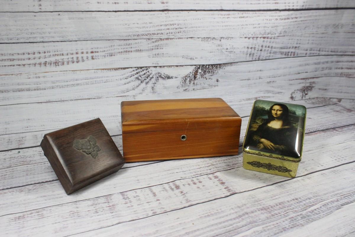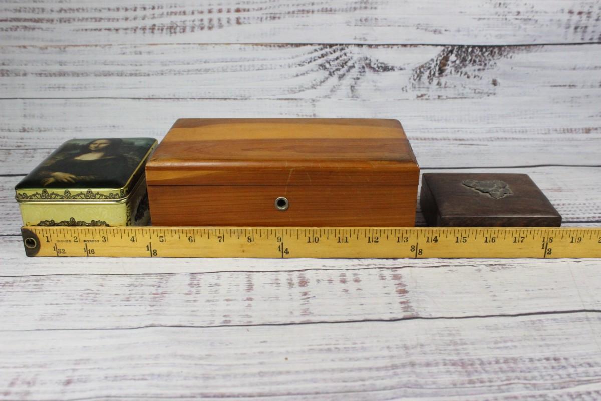 Set of Vintage Trinket Boxes, there's no damage to to any of the boxes and is in good vintage condition. The small wooden box was made in Bunos Aires, the bigger wooden box is made by Kirks Furniture Company, and the tin Mona Lisa box was made in Holland. Check photos for more details and for sizing.