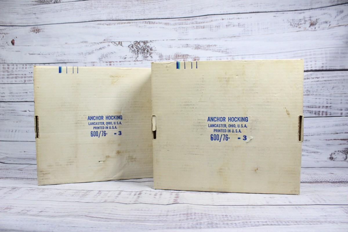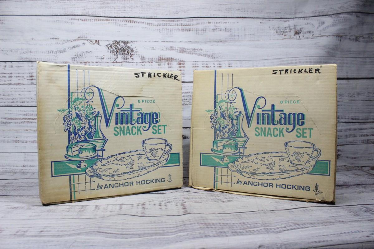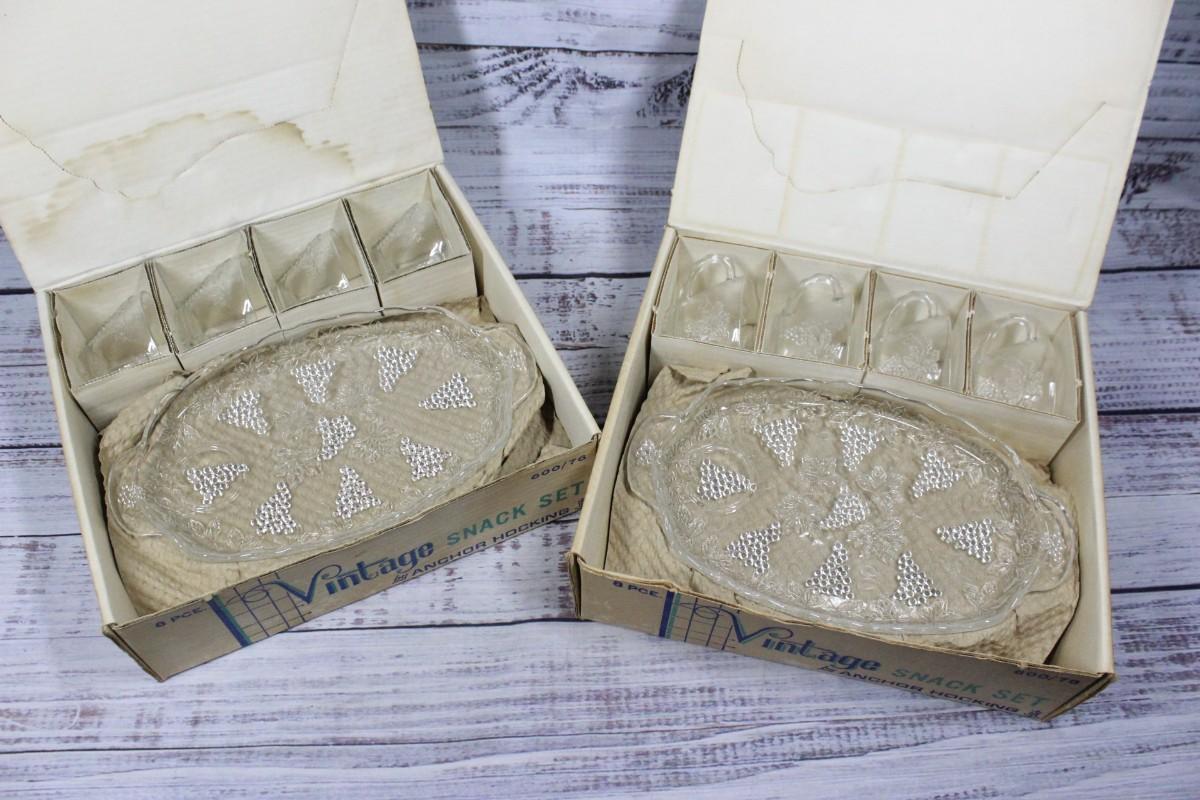 Pair of Vintage Anchor Hocking 8 Piece Glass Snack Set Lot 1, there are no cracks or chips to any of the glass pieces and is in good vintage. Check pictures for more details and for sizing. Both boxes come with a complete set of 8 glass pieces.