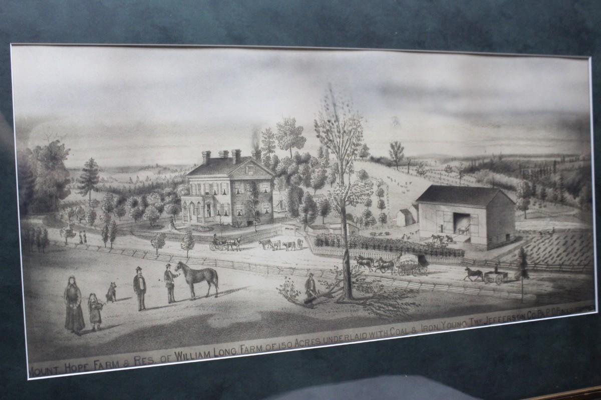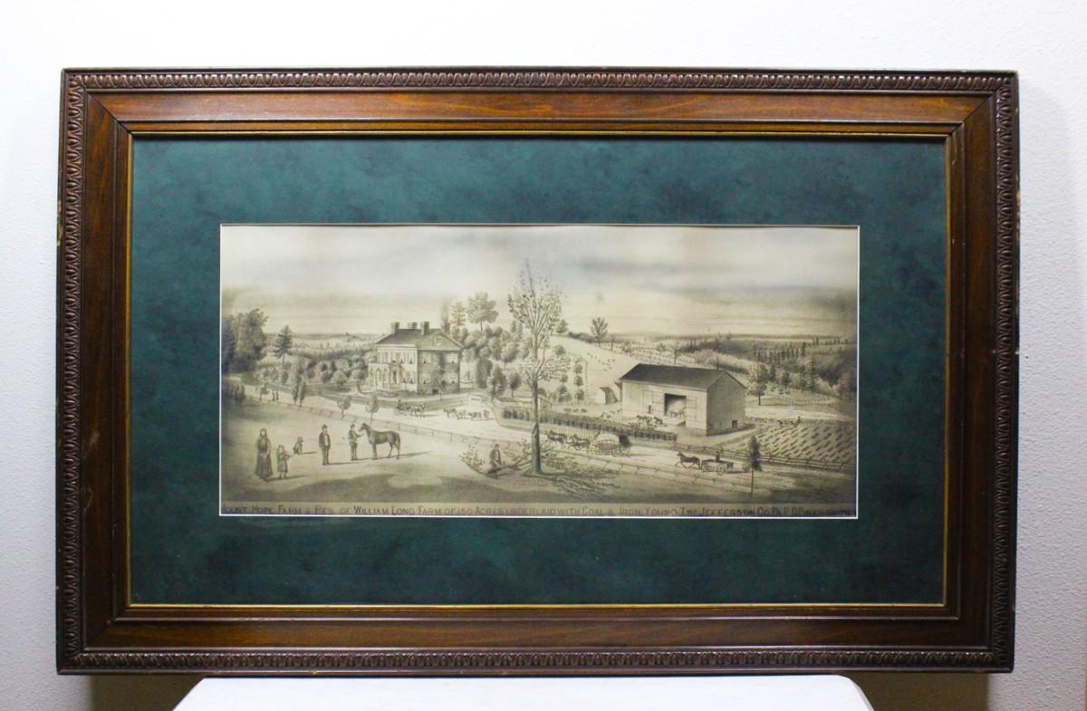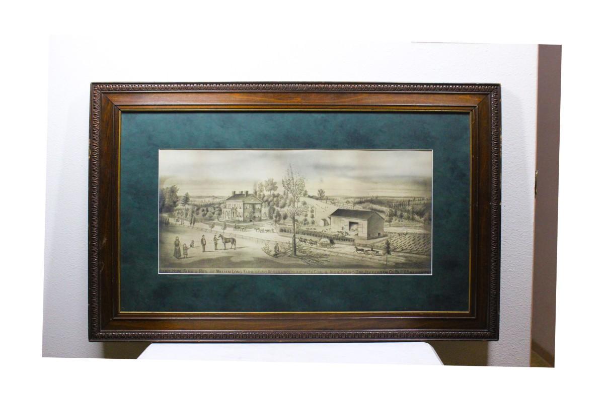 Vintage Framed Print of a 19th Century Homestead Settlement, there are no cracks or chips to the frame or the protective glass and is in good condition. Check pictures for more details and for sizing. The description of the settlement is underneath the image and reads: "Mount Hope Farm & Res. of William Long Farm of 150 Acres Underlaid With Coal & Iron Young Two Jefferson Co PA OR"
