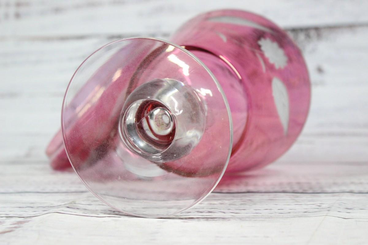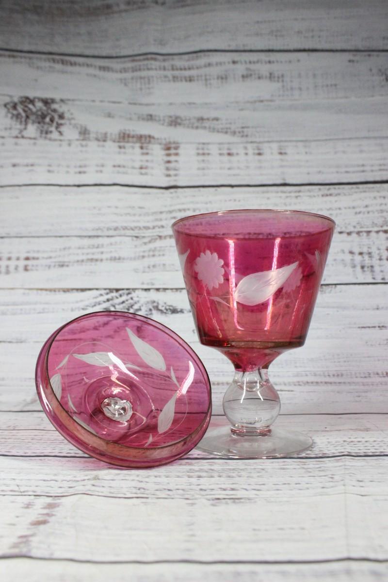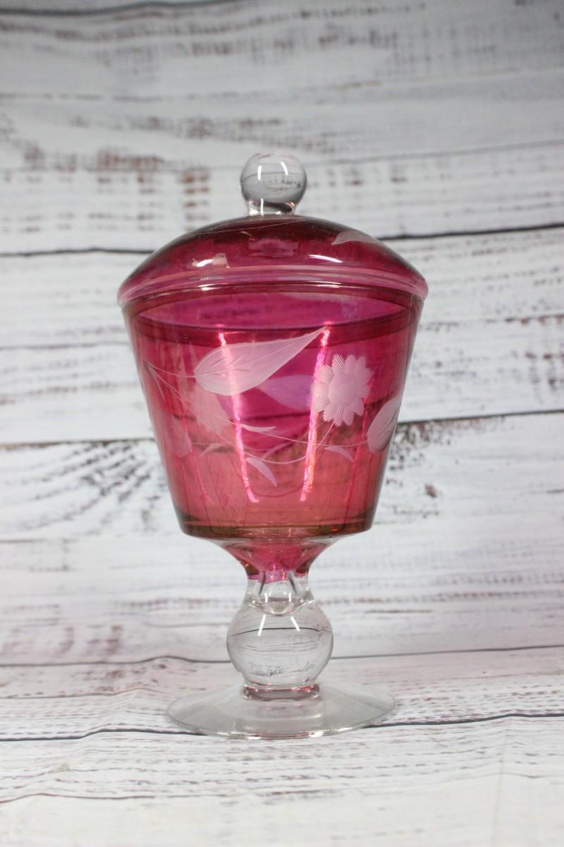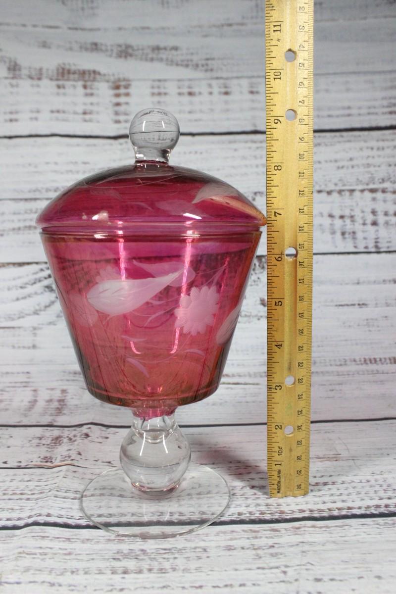 Retro Cranberry Floral Pattern Lidded Pedestal Glass Candy Jar