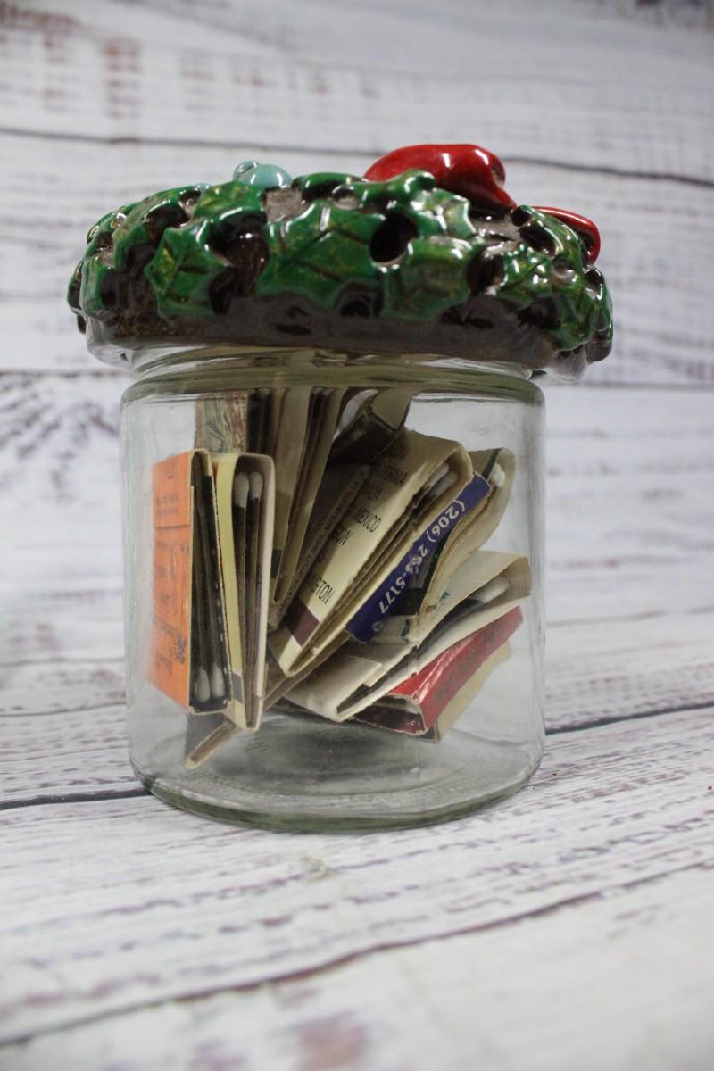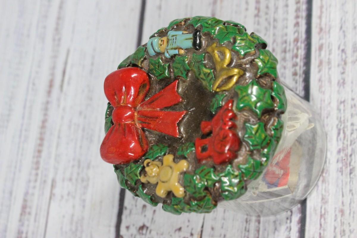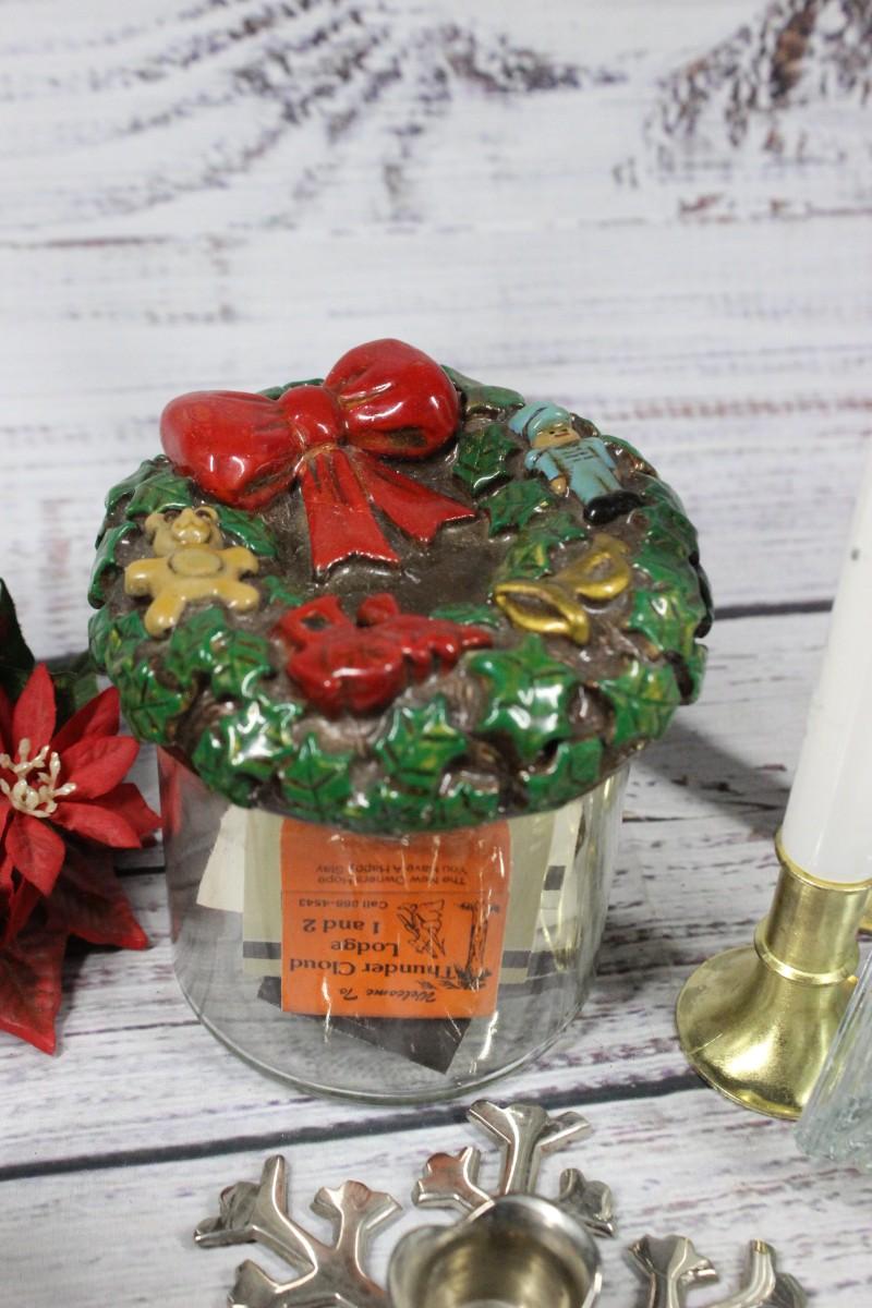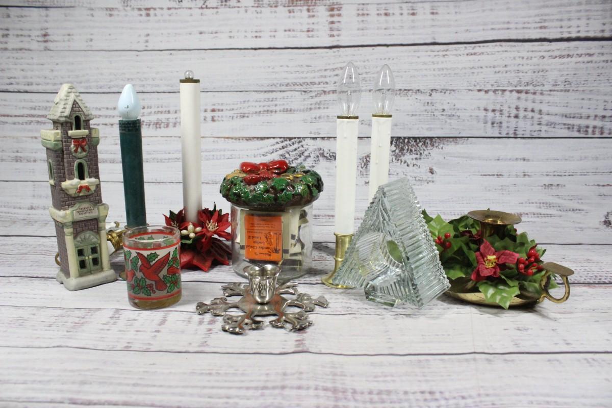 Vintage Christmas Candles and Reef Jar Lot, there's no significant damage to any of the pieces and is in good condition. The electronic candles have not been tested. The Christmas reef jar is filled with vintage matchbooks.