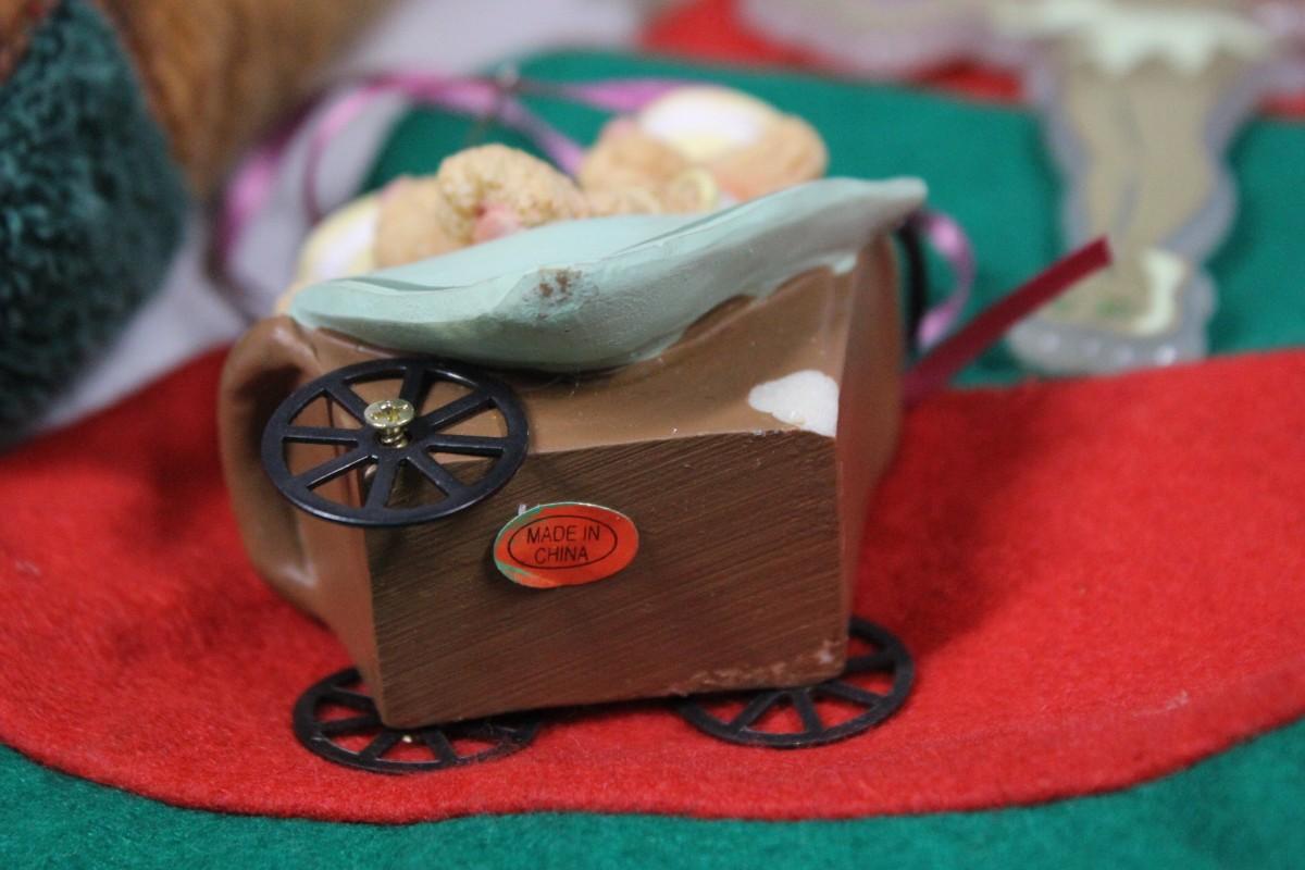 Christmas Lot Tree Skirts, Decorations, Tablecloths & More, one of the decorations has a chipped off wheel. There's no other significant damage to any of the pieces and is in good condition, check pictures for more details.