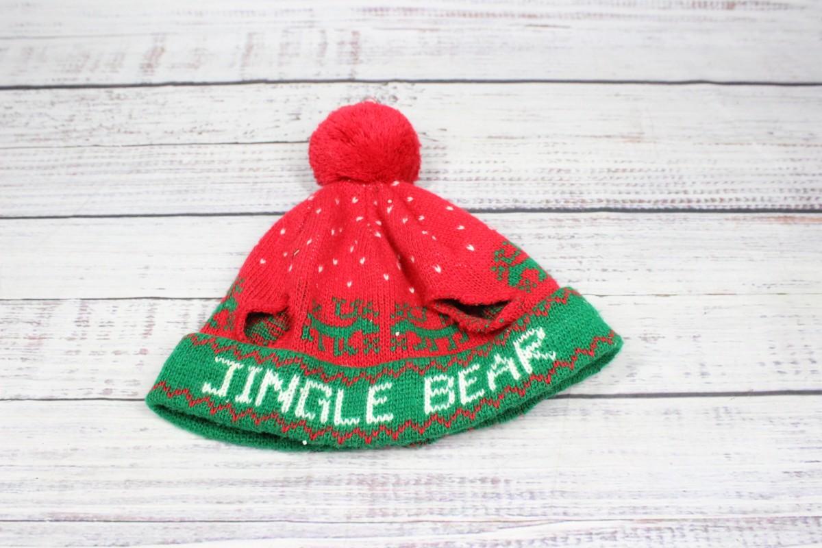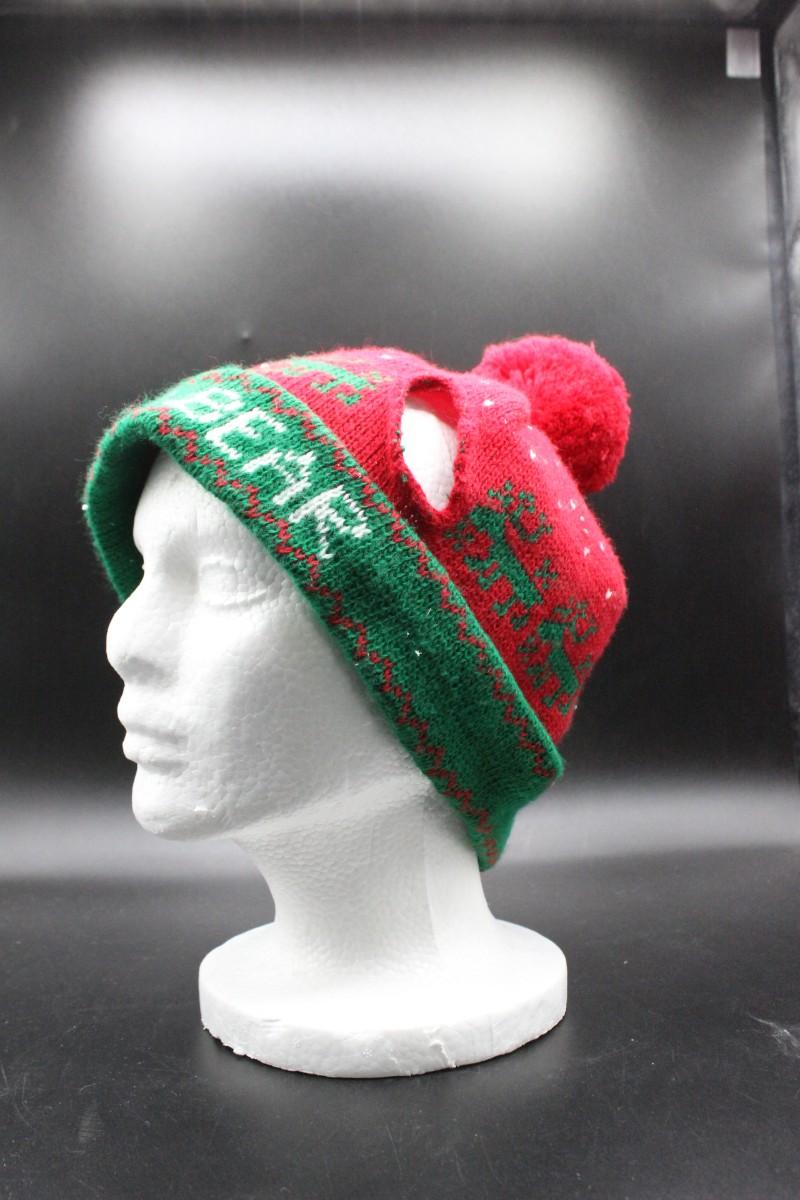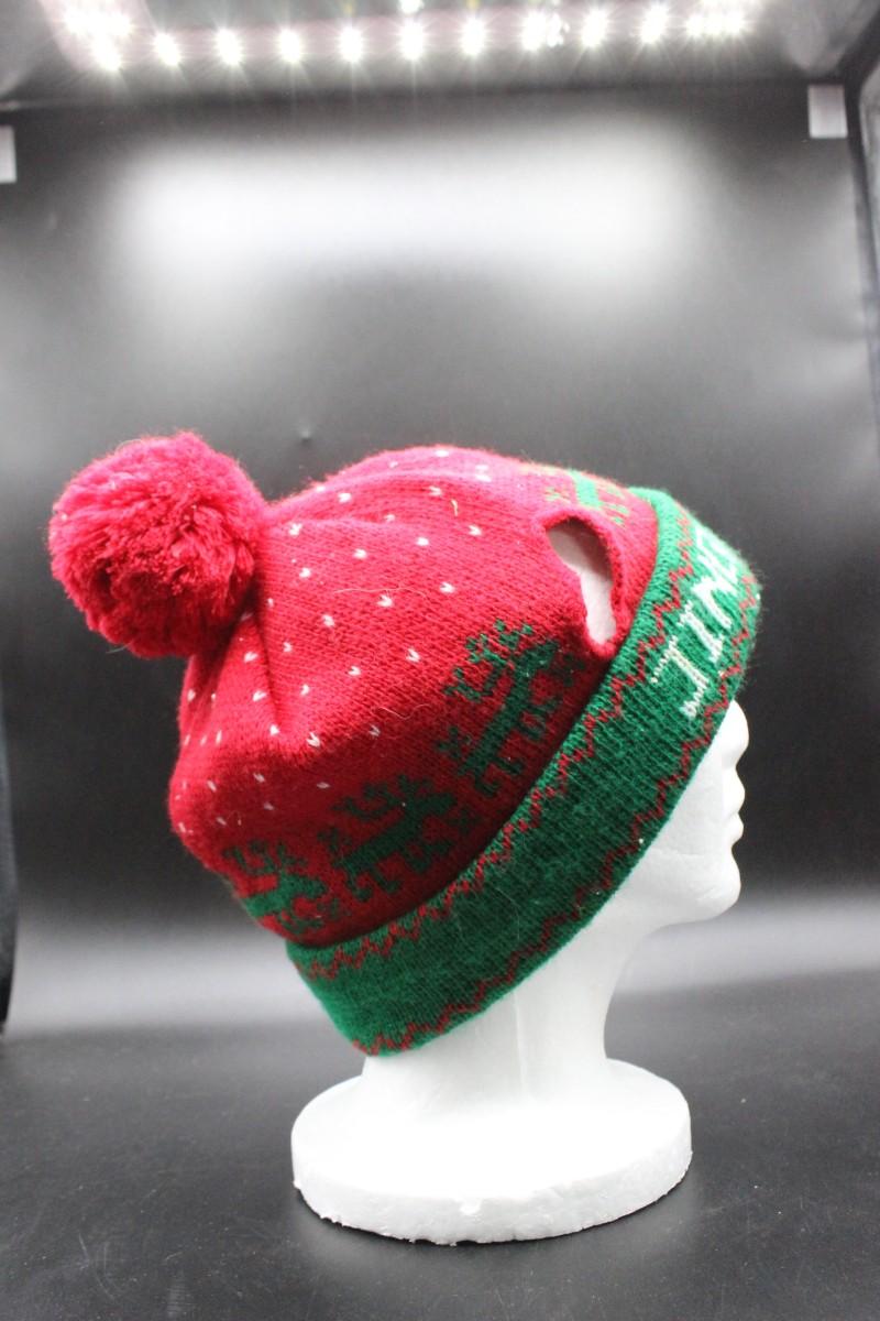 Christmas Reindeer Beanie Hat, there are no rips or tears to the beanie and is in good useable condition. There is no tag to indicate size, but it appears that it's a medium. There are two holes near the top of the beanie to fit reindeer antlers through, check pictures for more details.