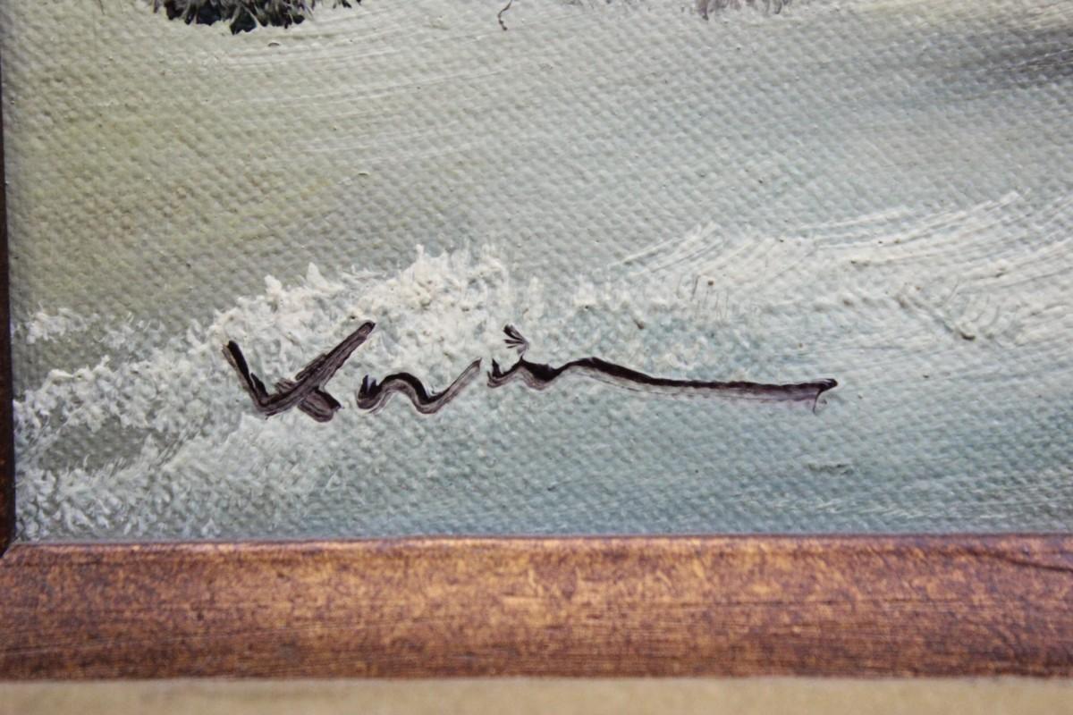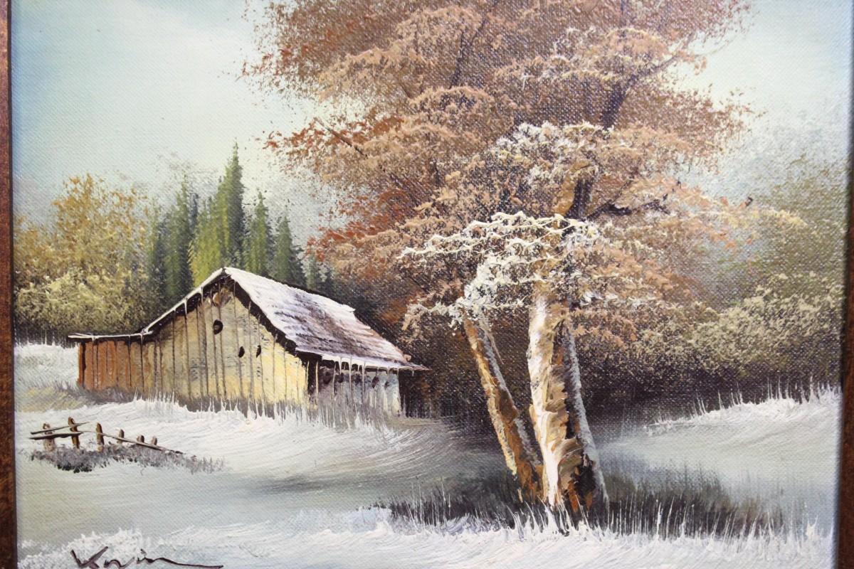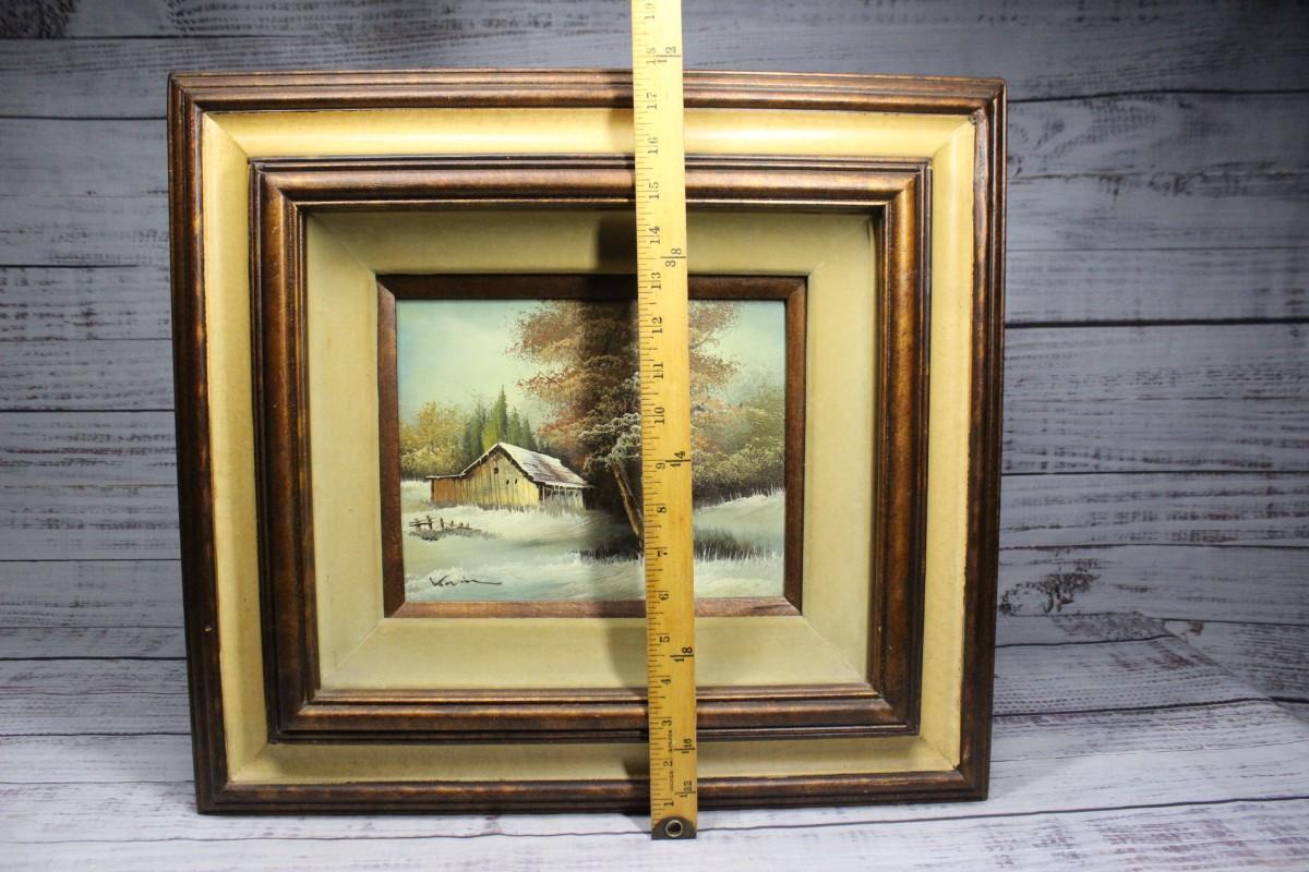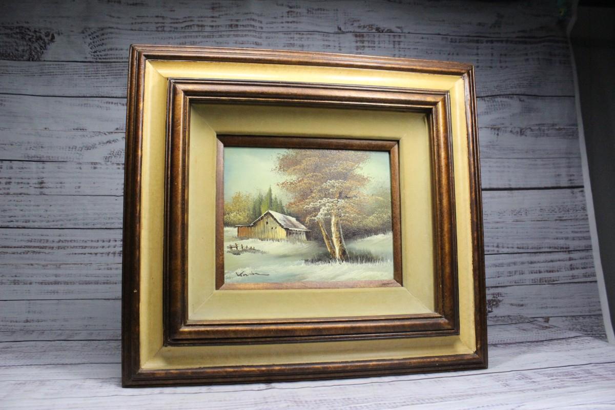 Vintage Small Framed and Signed Cabin Winter Painting, there's no cracks or chips to the frame or canvas and is in good vintage condition. Check pictures for more details and for sizing.