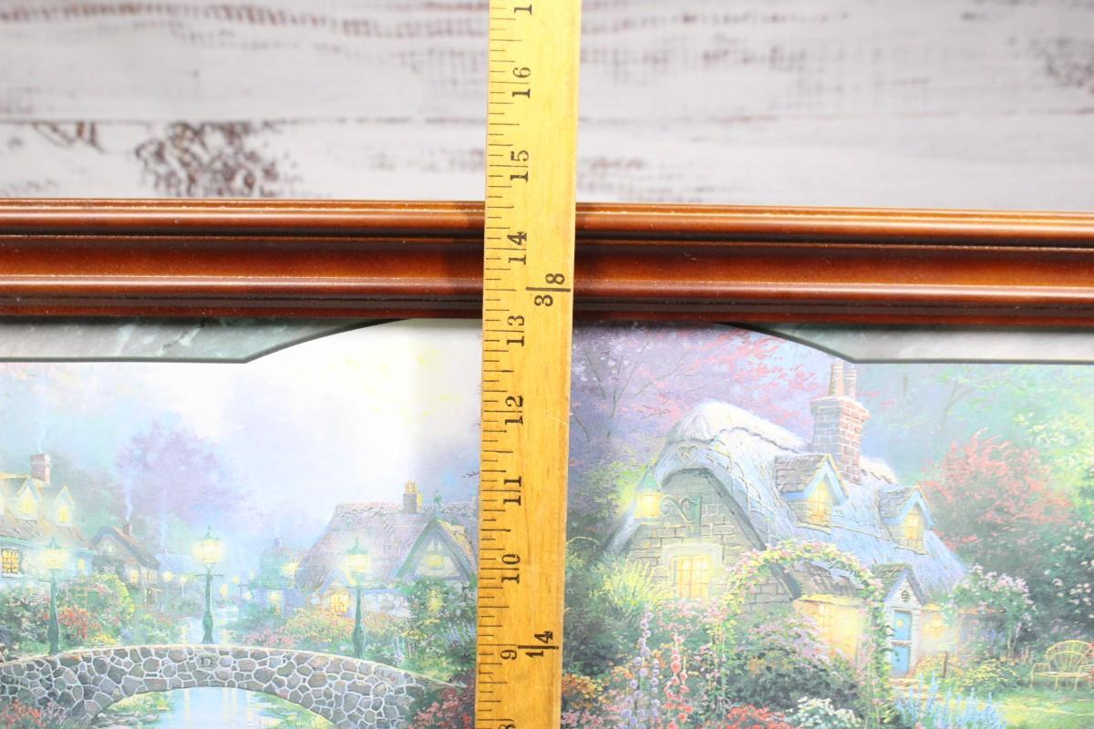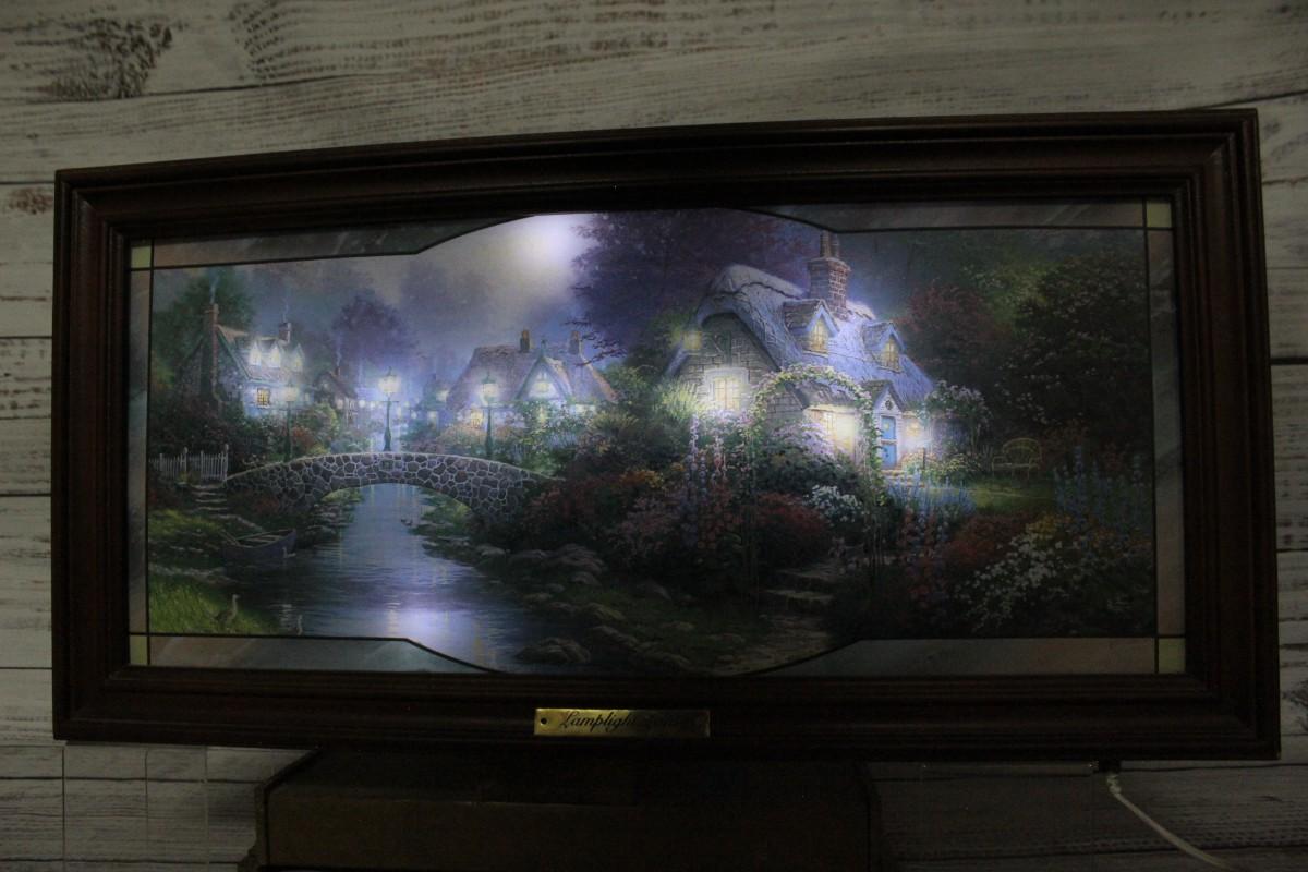 Vintage Lamplight Bridge Thomas Kinkade Light Up Picture, there's no significant cracks or chips to the frame and is in good vintage condition. Has been tested, the light is a little dim. Check pictures for more details and for sizing.
