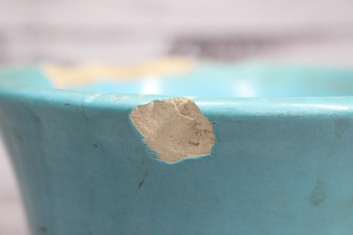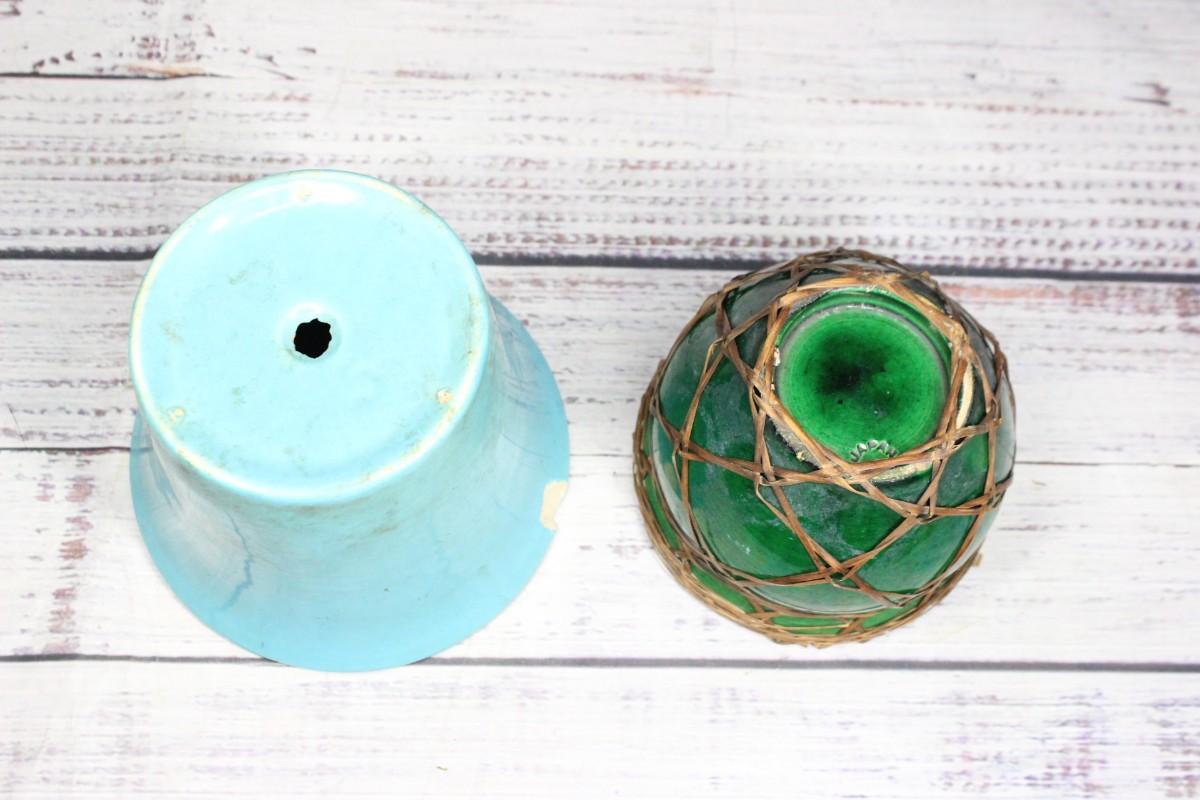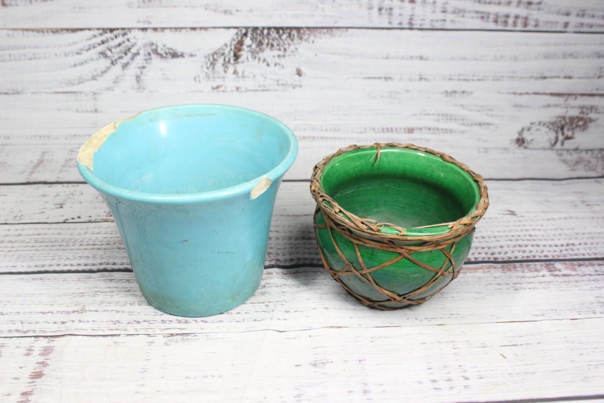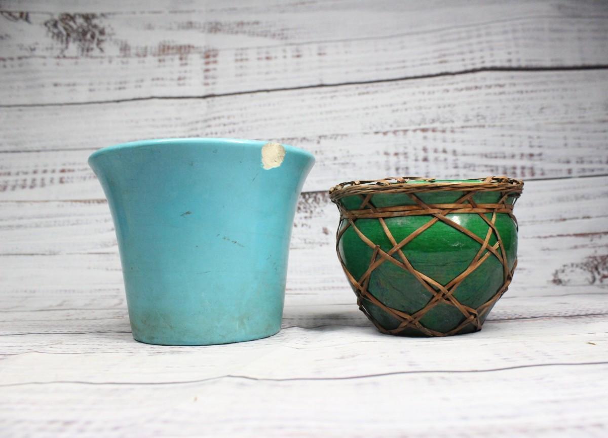 Pair of Vintage Small Flower Pots, there is some chipping to the blue flower pot, check pictures for more details and for sizing. The green flower pot is made in Japan, and is in good vintage condition.