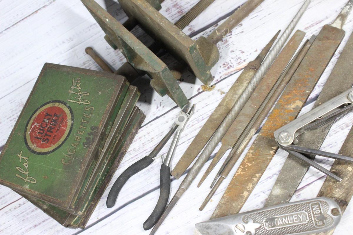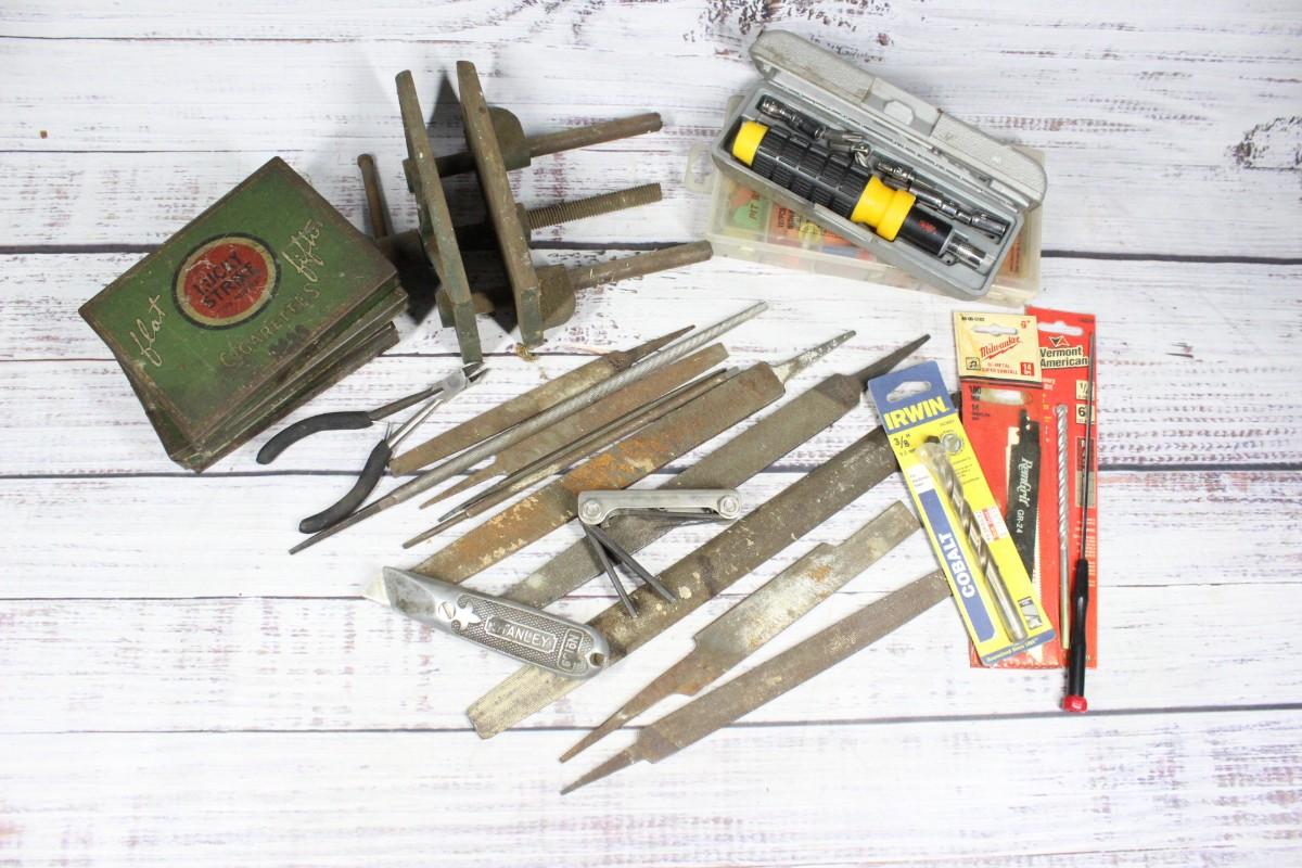Lot of Tools, Files, Drill Bits, & More, check pictures for more details about what comes in the lot. The lot also comes with empty green metal cigarette tins.