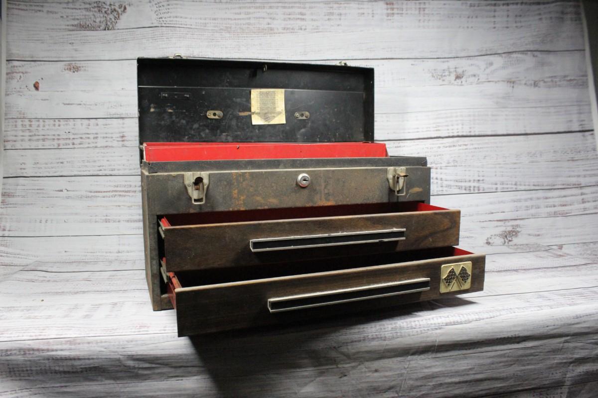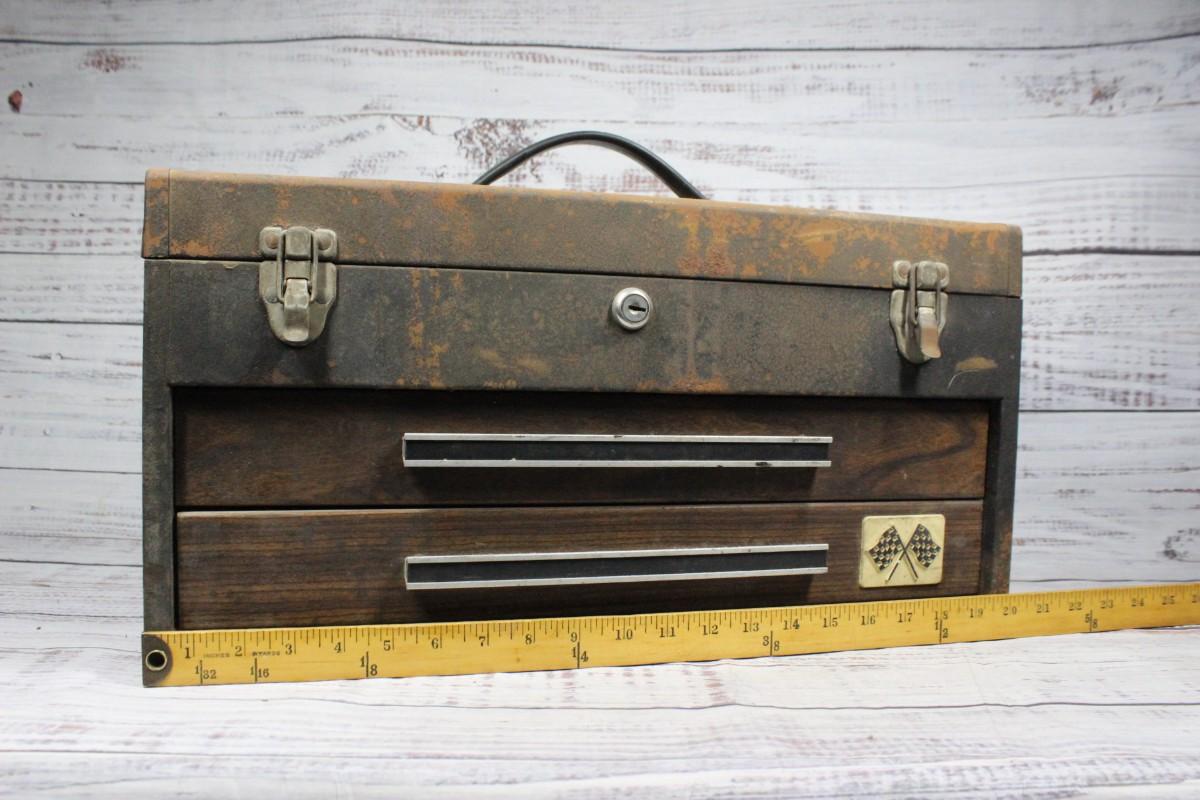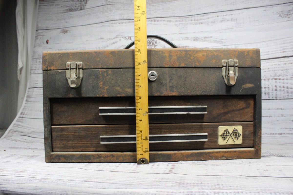 Vintage Sears Craftsman Woodgrain Rally Tool Box, there is some natural wear to the tool box and has to be cleaned. There is no damage to the drawers, latches, or the box. Does not come with key, check pictures for more details and for sizing.
