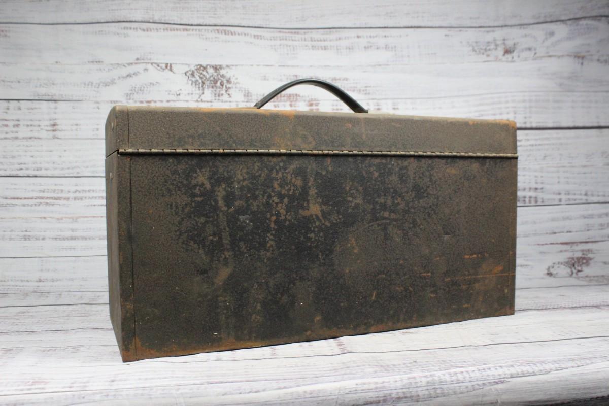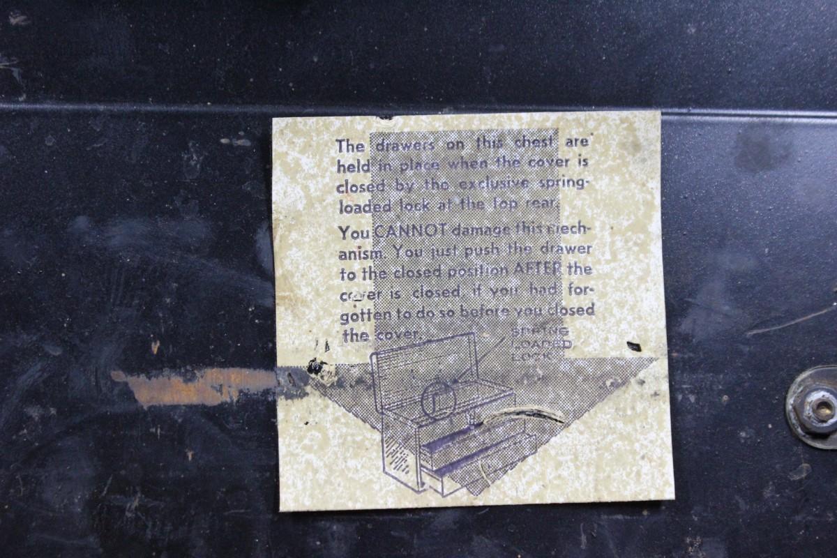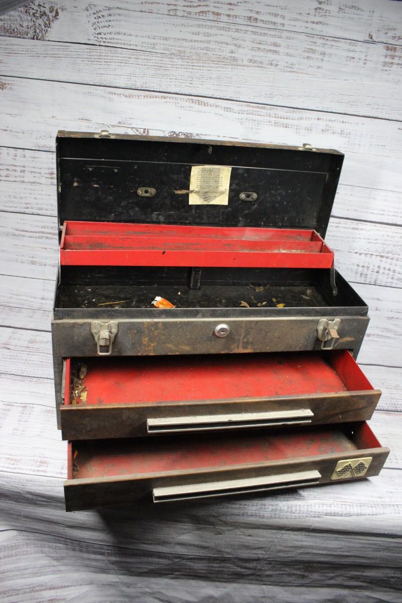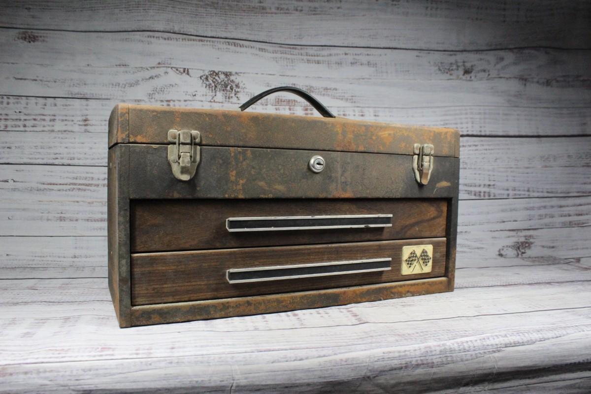 Vintage Sears Craftsman Woodgrain Rally Tool Box, there is some natural wear to the tool box and has to be cleaned. There is no damage to the drawers, latches, or the box. Does not come with key, check pictures for more details and for sizing.