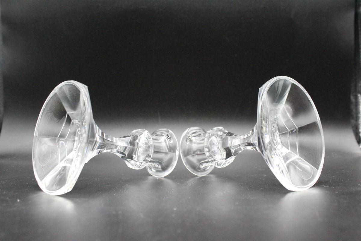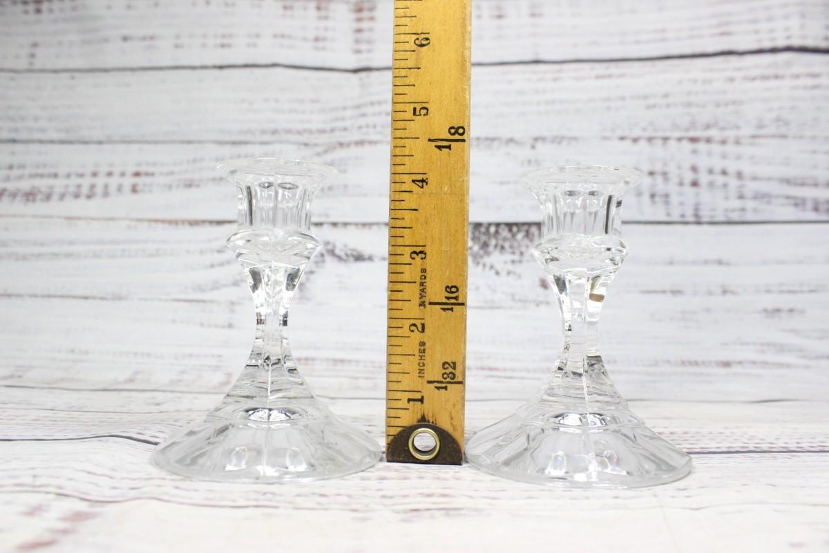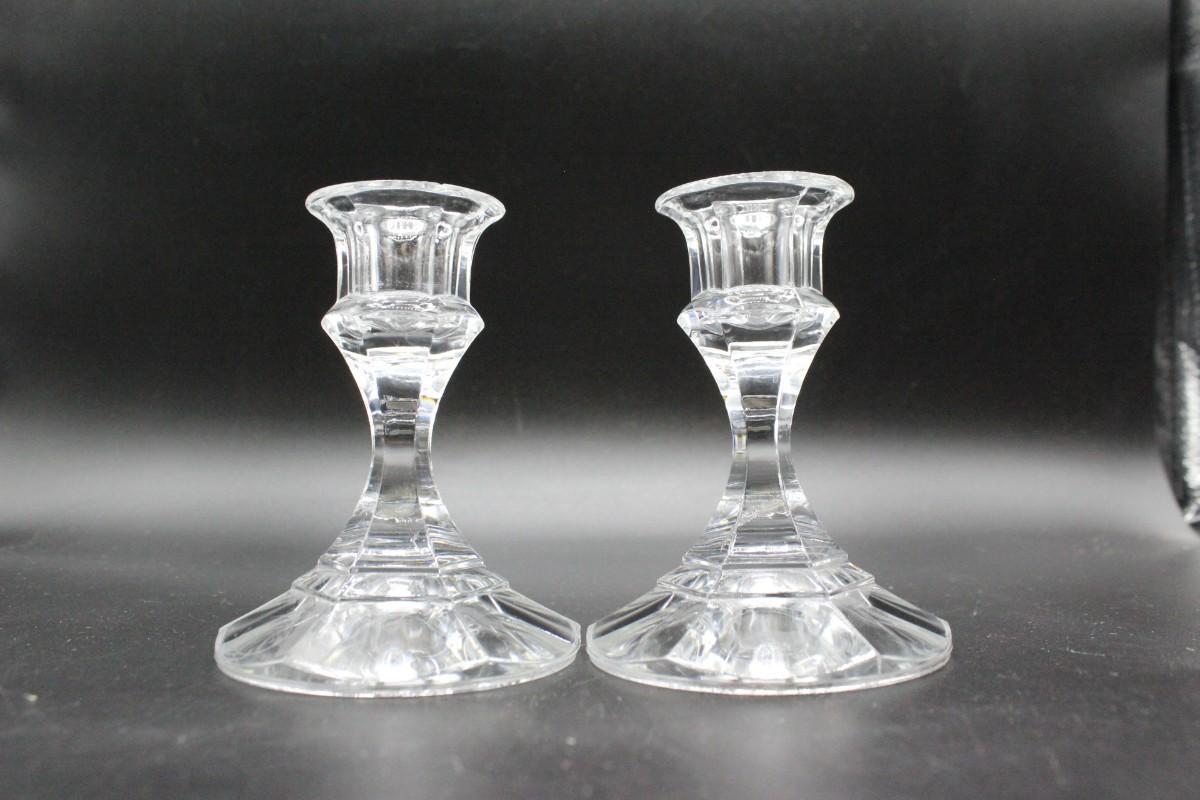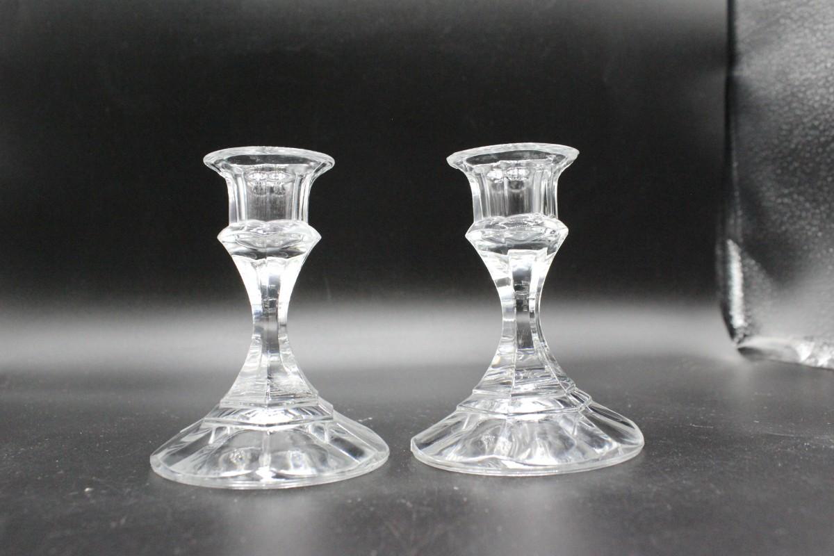 Pair of Lead Crystal Glass Candleholders, there are no chips or cracks to any of the pieces and is in good useable condition. Check pictures for more details and for sizing.