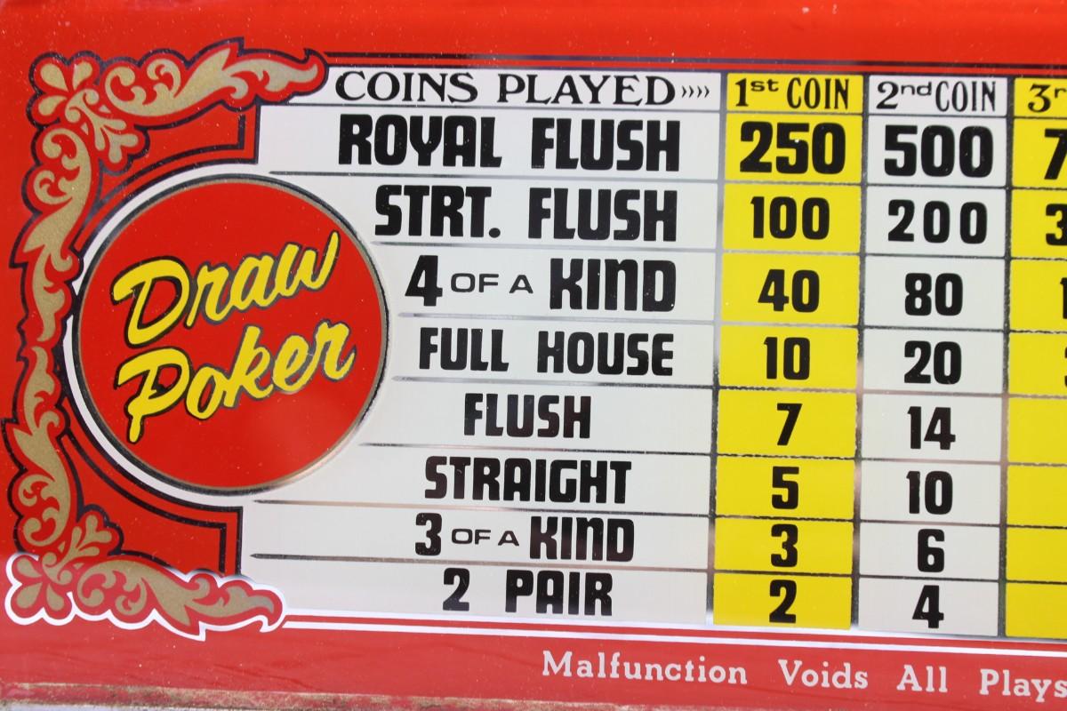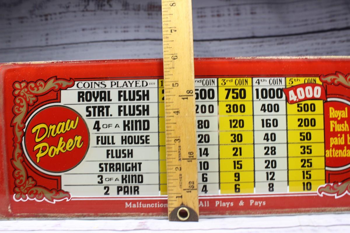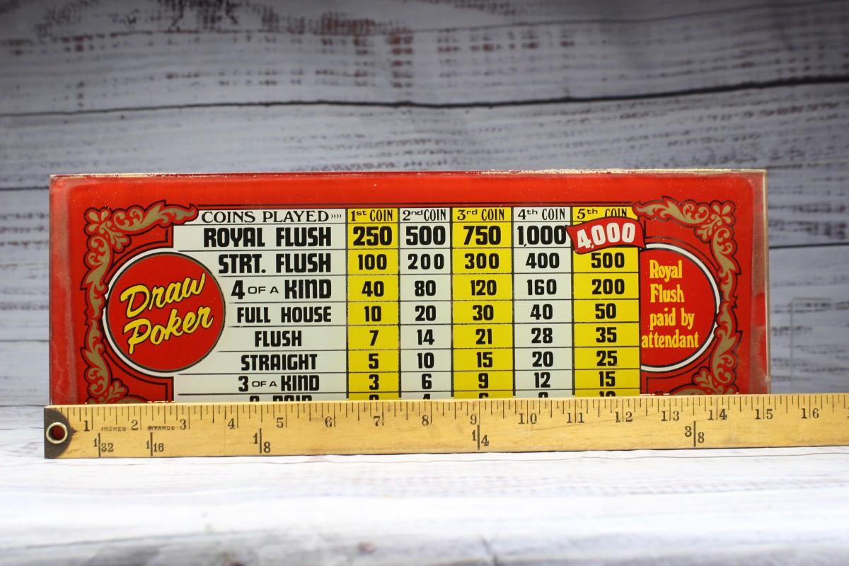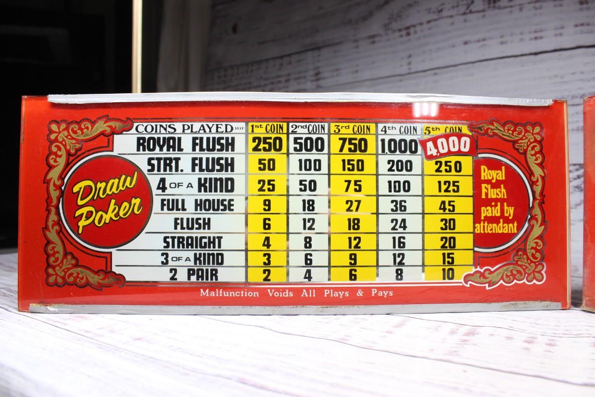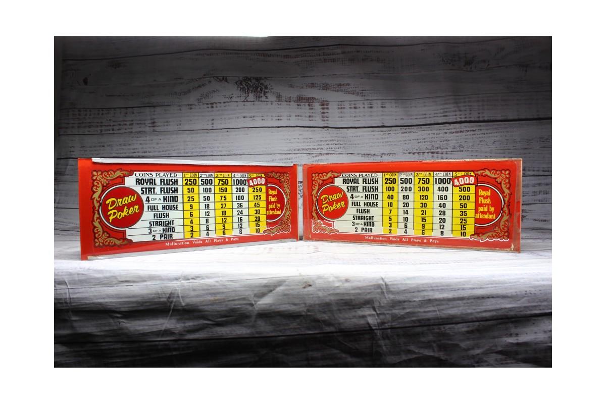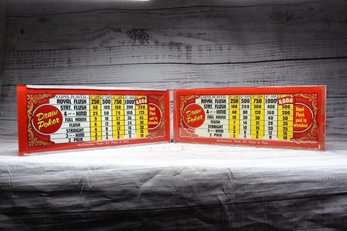 Pair of Vintage Retro Draw Poker Slot Machine Glass Panel Inserts, there is no significant chips or cracks to either of the pieces and is in good vintage condition. The graphics and color is still vibrant, check pictures for more details and for sizing.