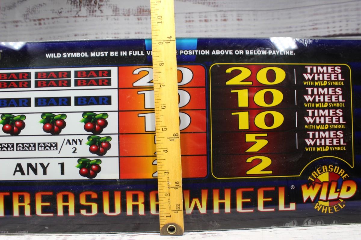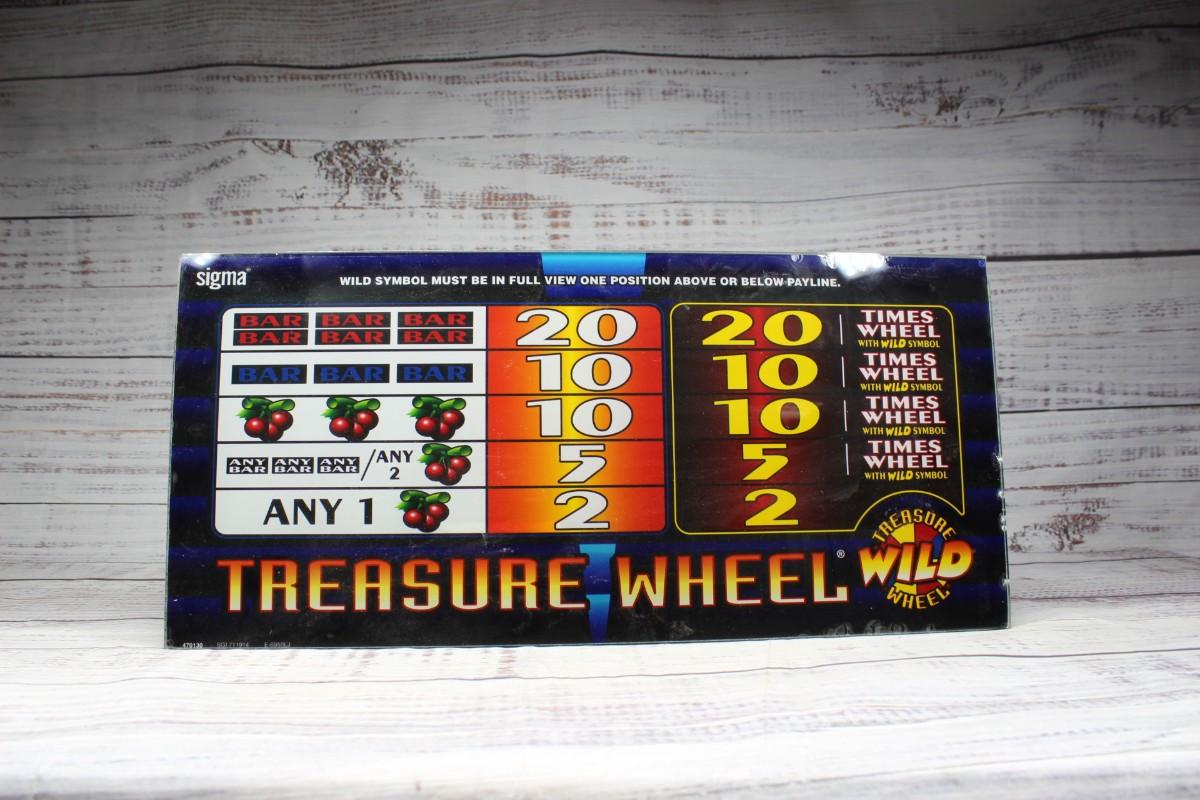 Retro Sigma Game Treasure Wheel Slot Machine Glass Panel Insert, there is some light cracks on the right side of the glass, but there is no other significant damage to the piece and is in good condition. Check pictures for more details.