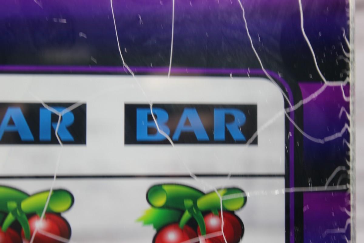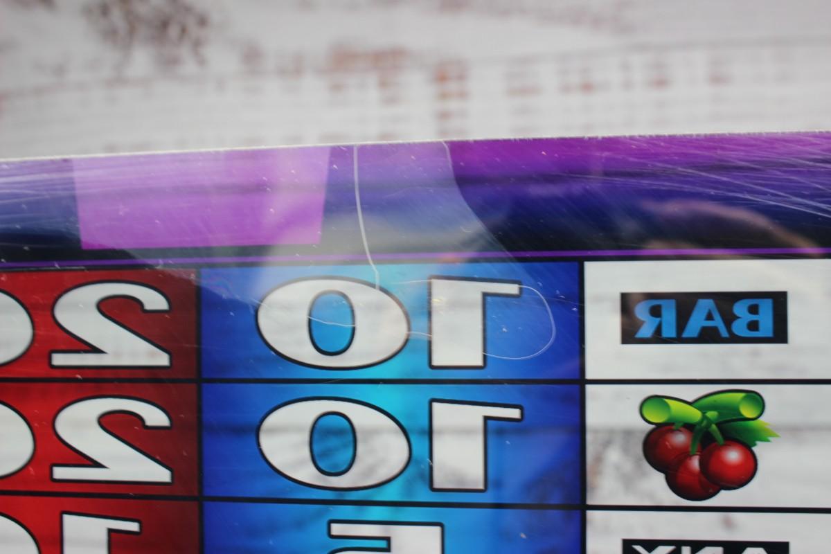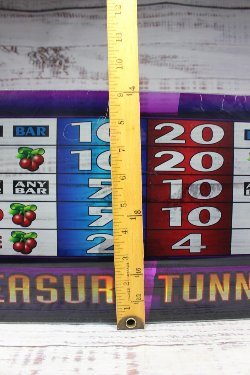 Retro Sigma Game Treasure Tunnel Slot Machine Purple Glass Panel Insert, there is some "cracking" to the graphics and some peeling. Check pictures for more details and for sizing.