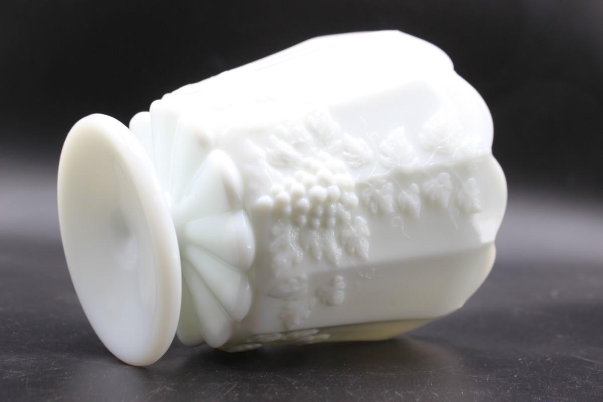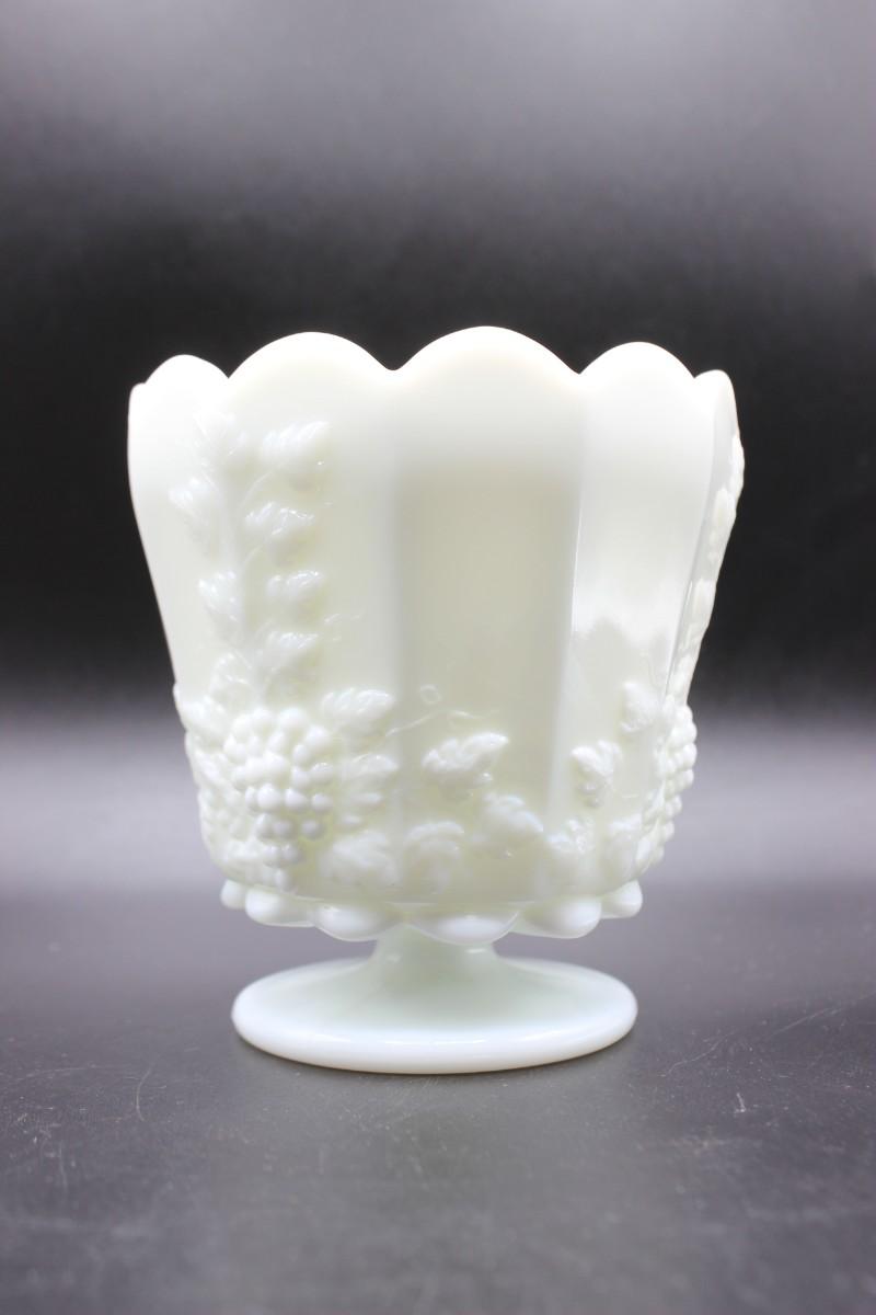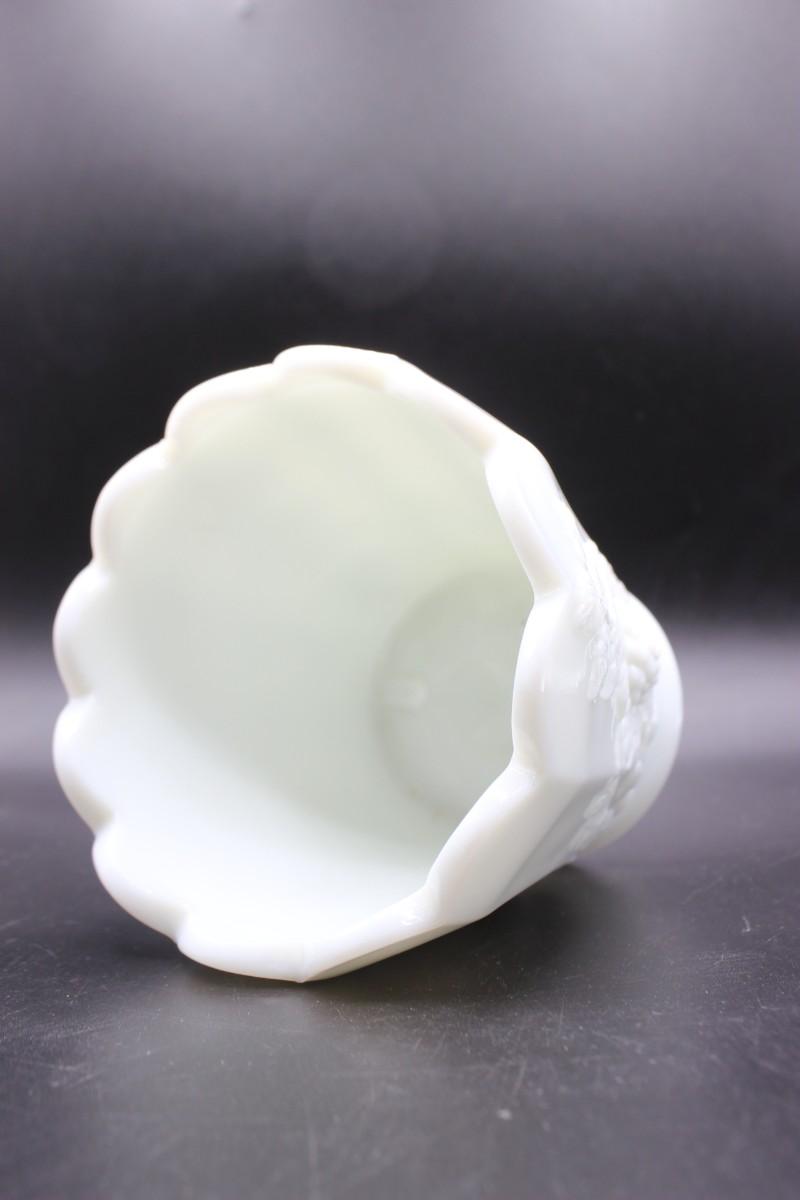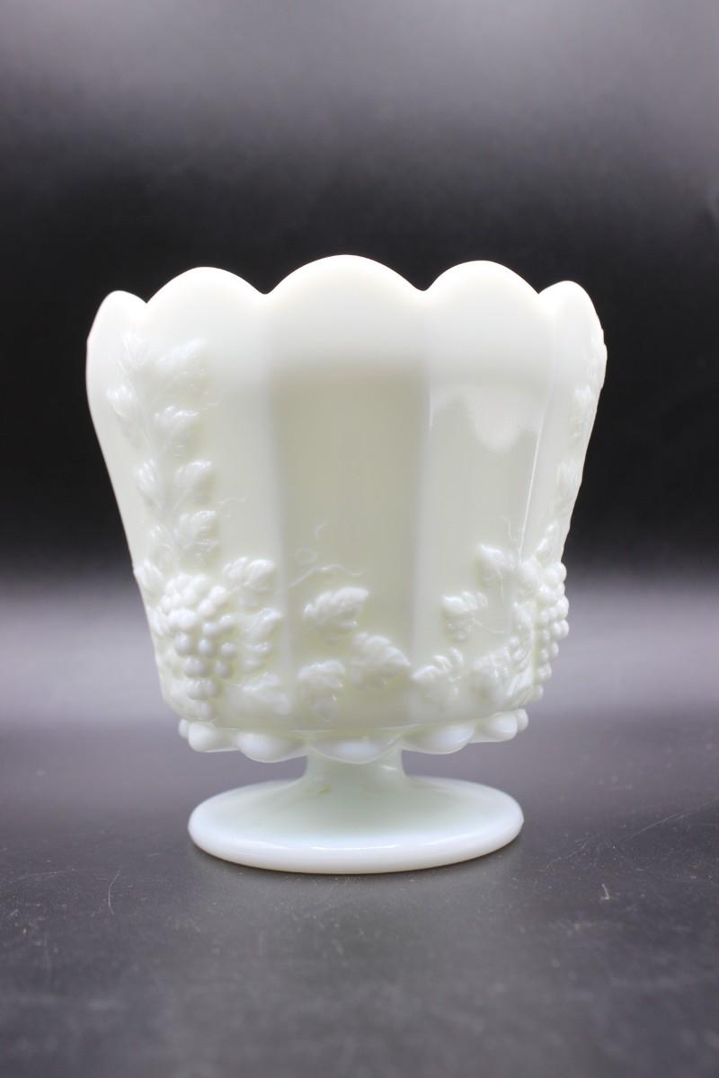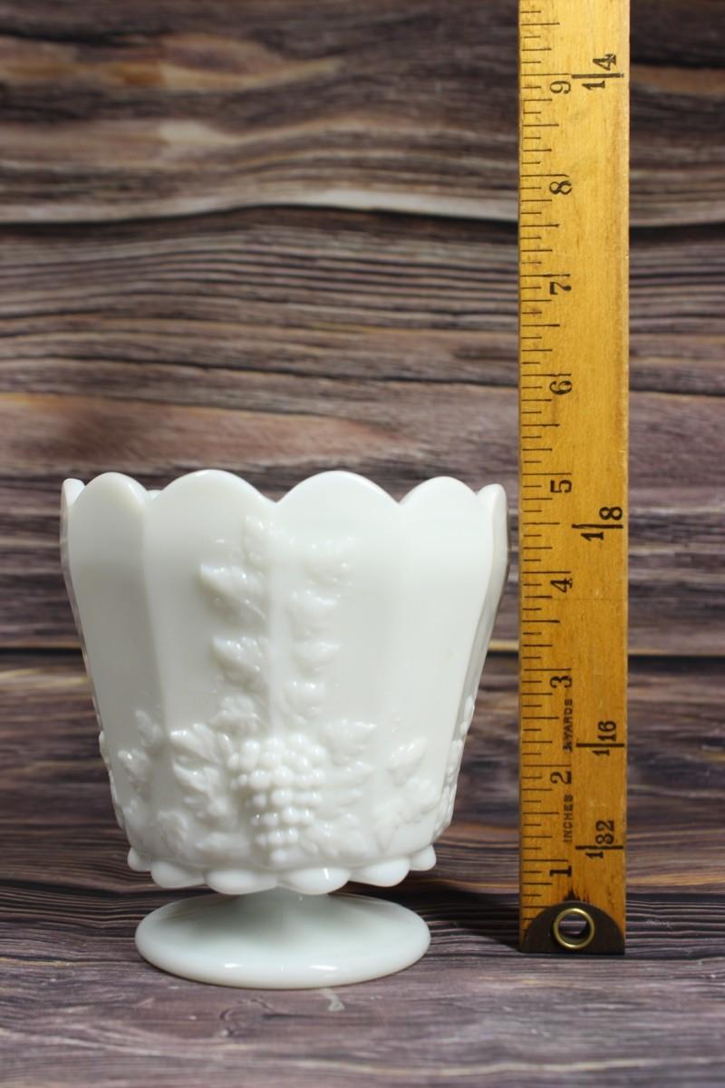 Vintage Westmoreland Milk Glass Paneled Grape Small Planter, there's no significant chips or cracks to the piece and is in good vintage condition. Check pictures for more details and for sizing.