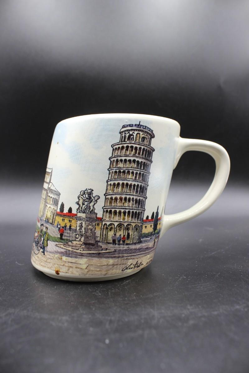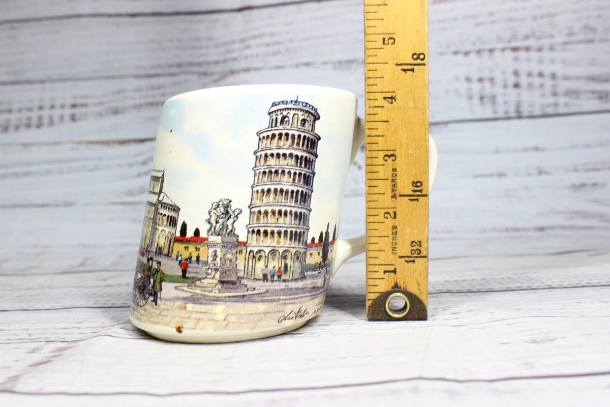 Vintage Made in Italy Leaning Tower of Pisa Ceramic Souvenir Mug stamped with a maker's mark "PF" on the bottom. There are no significant chips or cracks to the piece and is in good condition, check pictures for more details and for sizing.