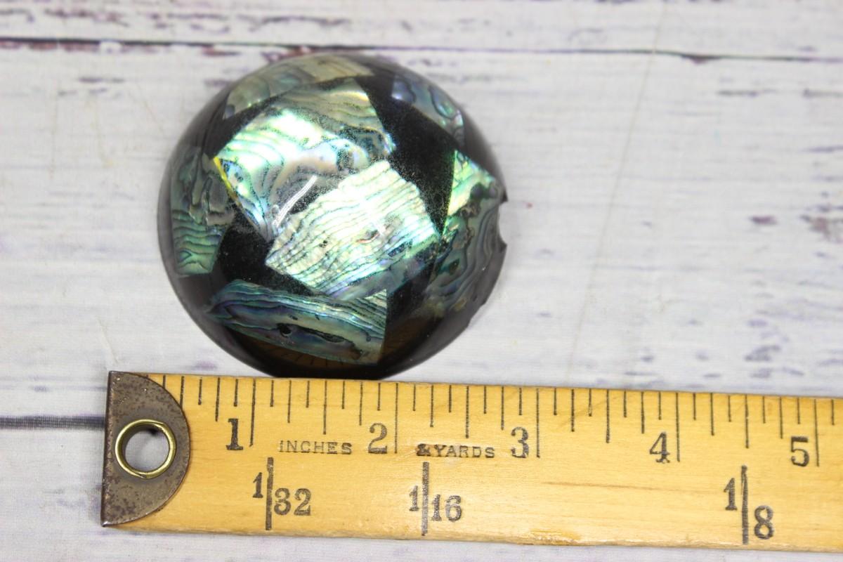 Vintage New Zealand Paua Shell Paper Weight, there is a crack on the rim of the piece, but there is no other significant damage and is in good vintage condition. Check pictures for more details and for sizing.