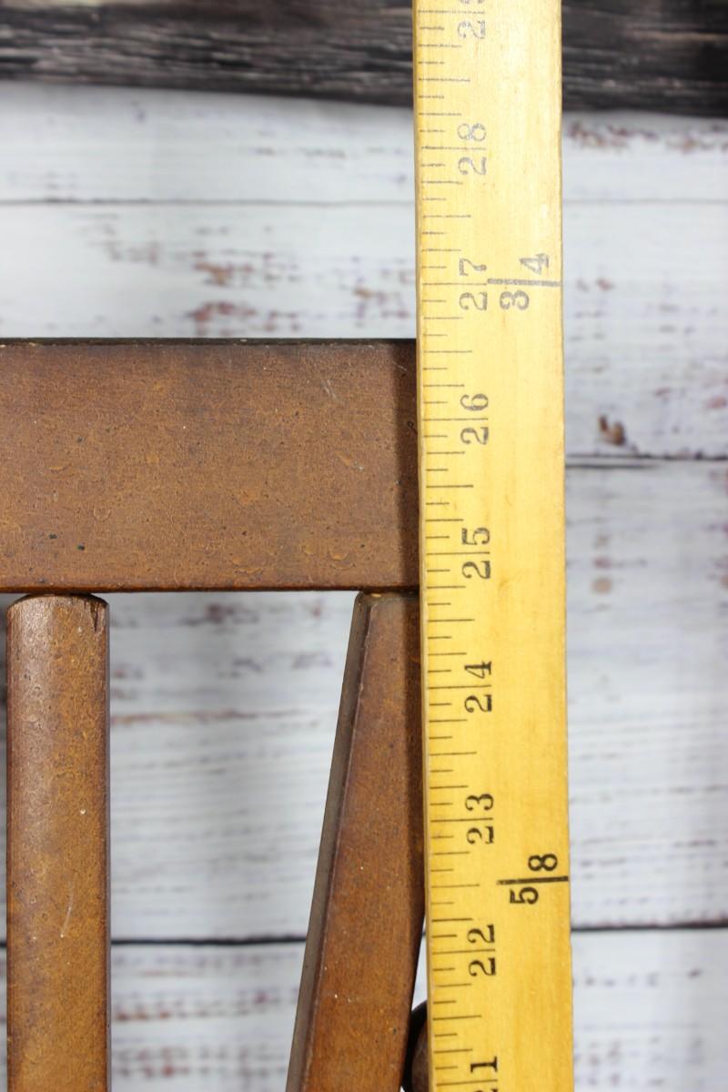 Vintage Wooden Baby Doll High Chair with Tray and Footrest, there is no significant chips or damage to high chair and is in good vintage condition. Check pictures for more details and for sizing, stands at about 26 1/2 inches tall.