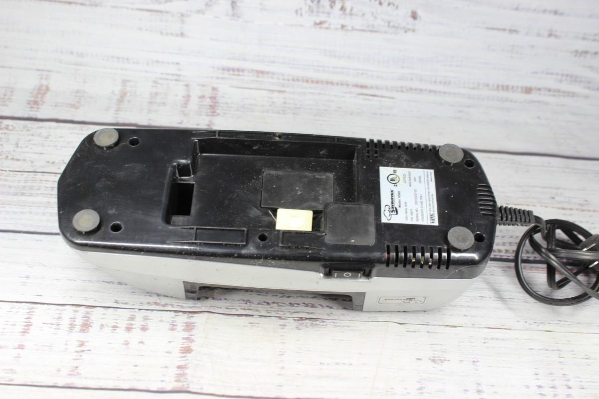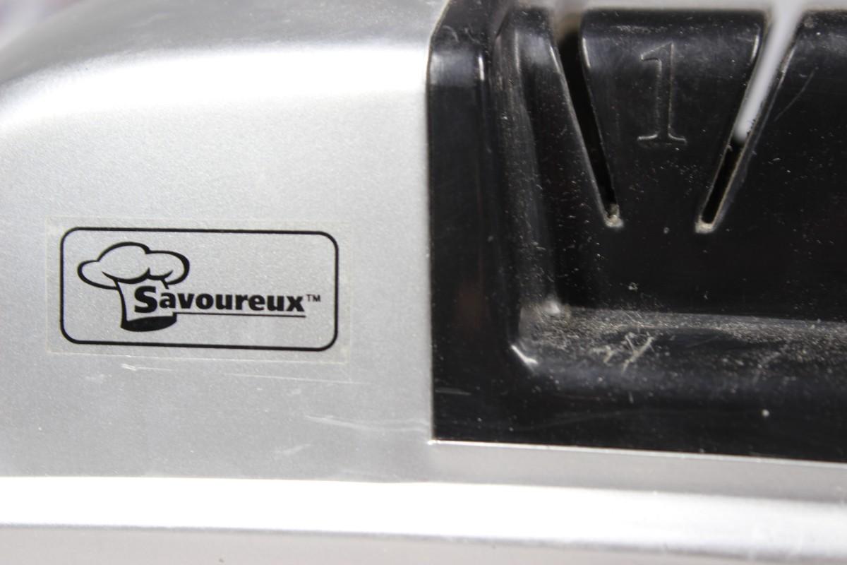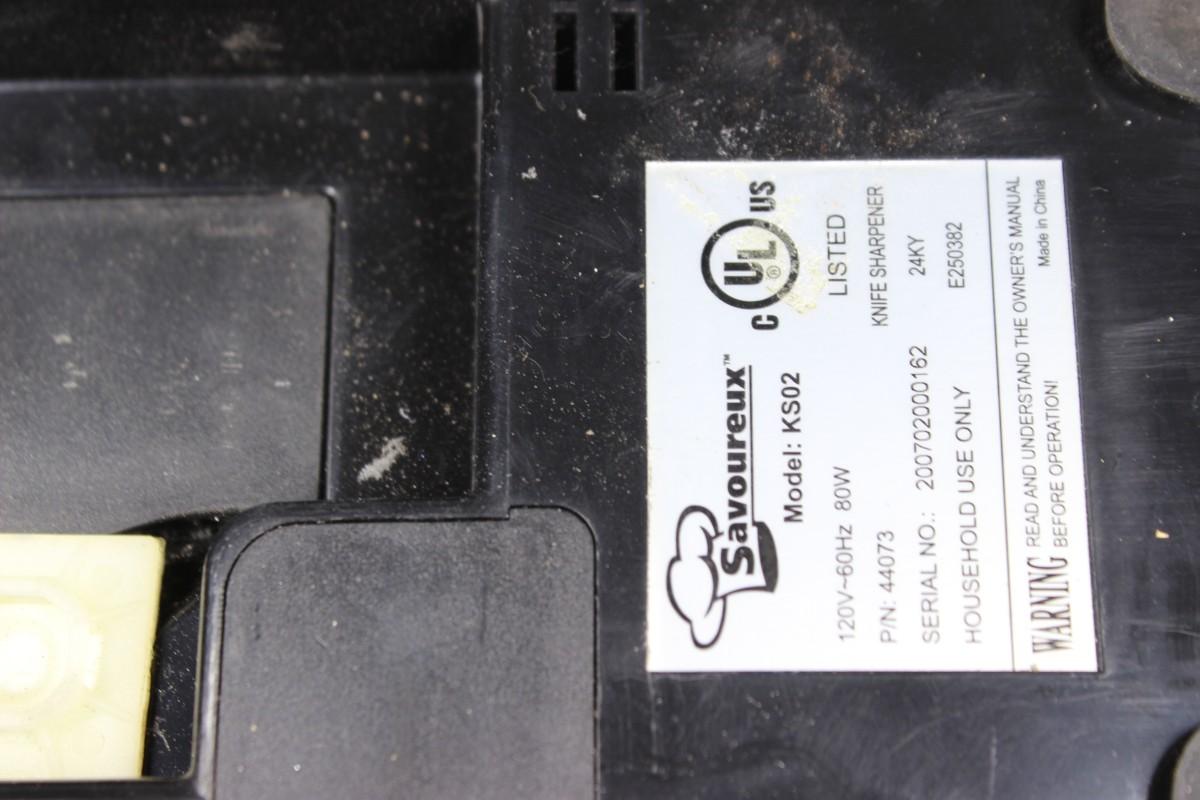 Savourex Electric Knife Sharpener, there is no significant damage to the piece and is in good condition. Turns on and works perfectly, but we did not test out sharpening a knife. Check pictures for more details and for sizing.