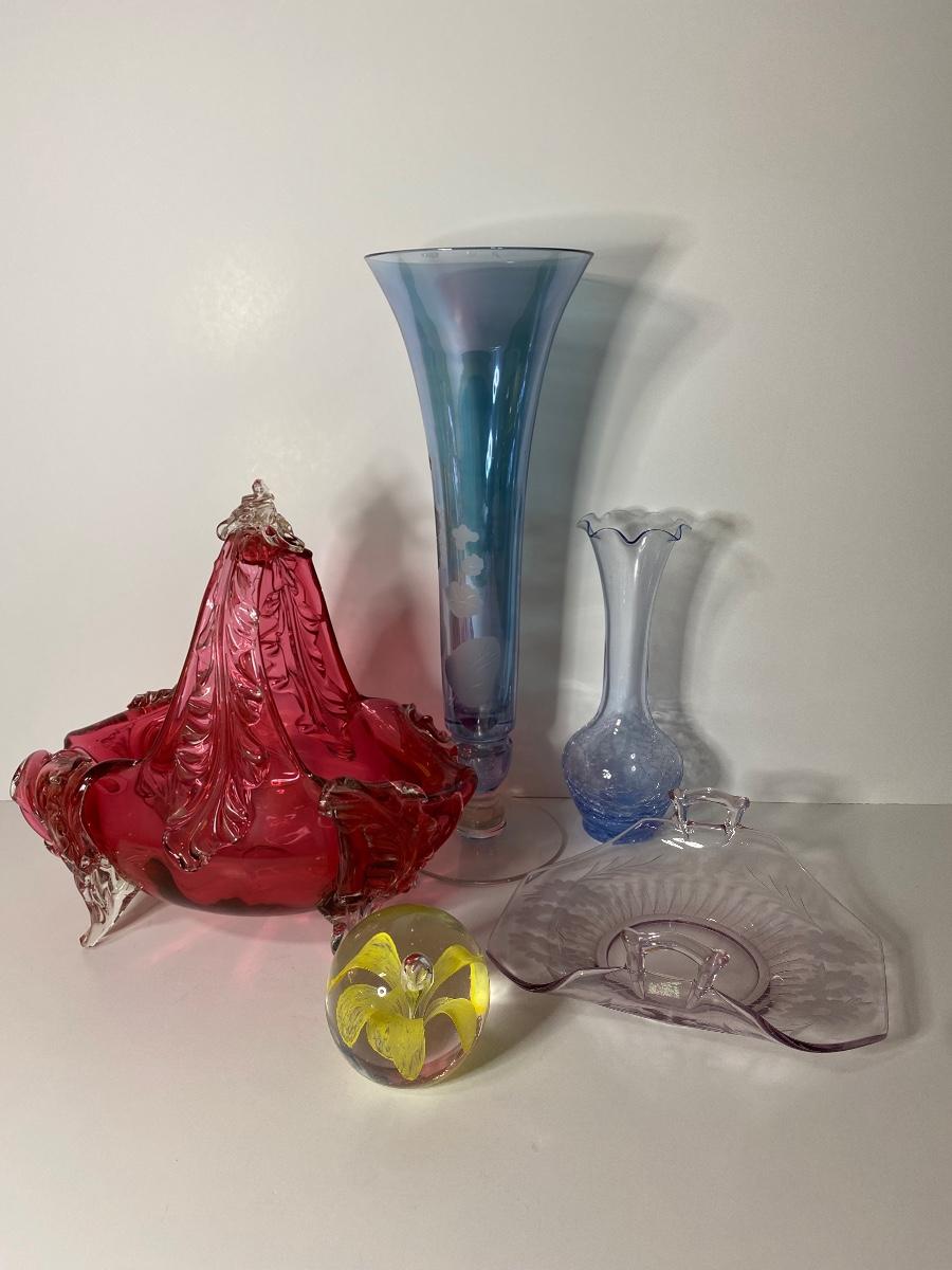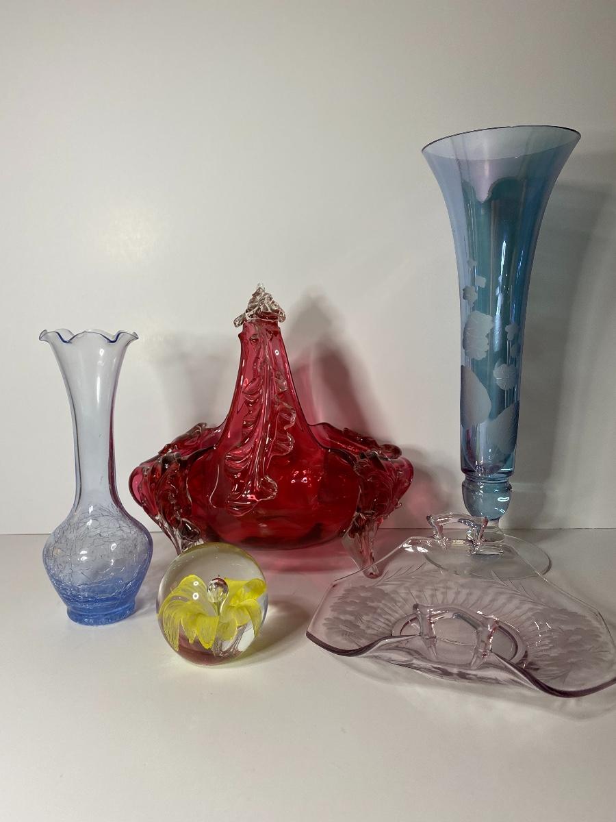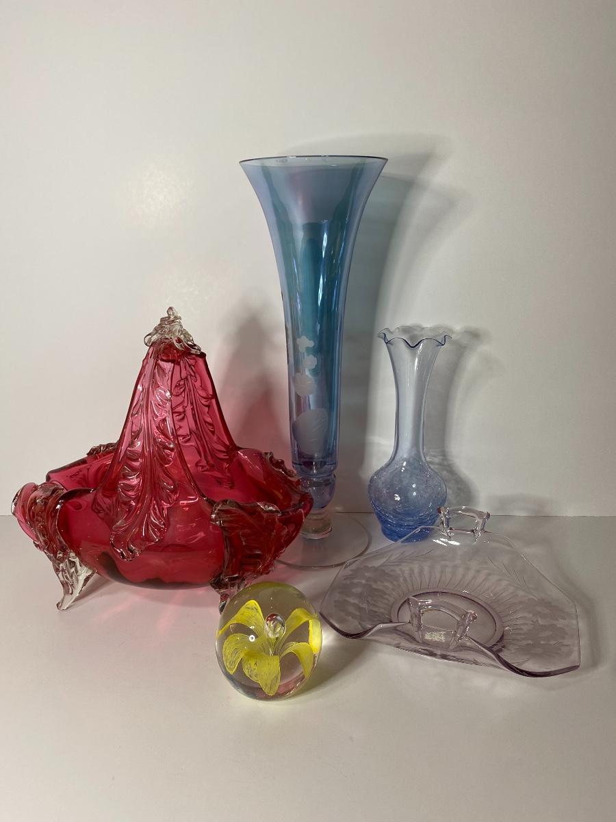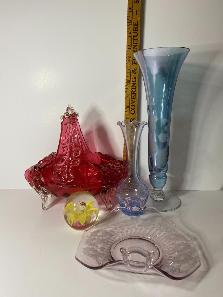 Paperweight, glass basket, glass dish and set of vases. All glass is beautiful and brightly colored. Please see all pictures as they are the best representation of the items. The pictures show condition, measurements if taken, and what is included in the lot. Due to the large amount that we photograph and the time frame, we are not always able to take measurements. All items unless noted, are pre-owned and have been used. If you purchased furniture, you must bring help. We do not allow one person to carry large furniture out on their own. Bring help, tools and a truck for the safety of our client’s homes, and your personal safety. Company policy. Thank you.