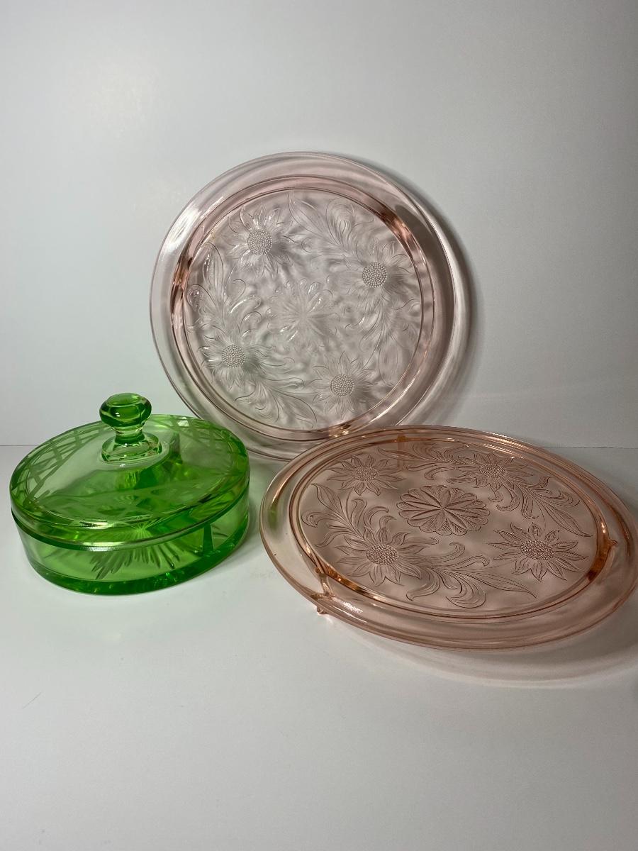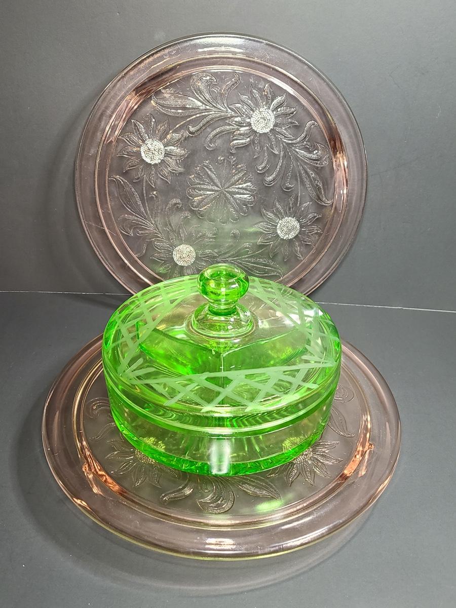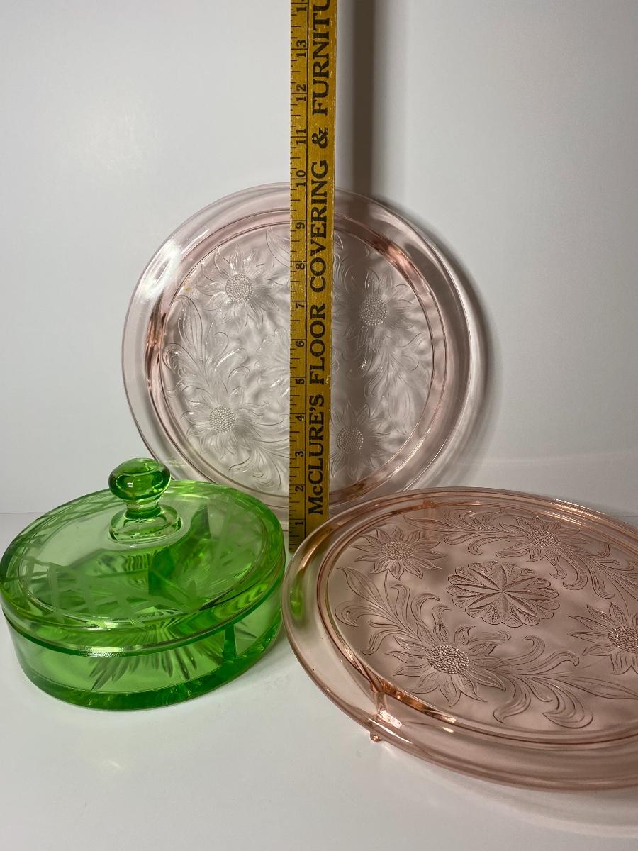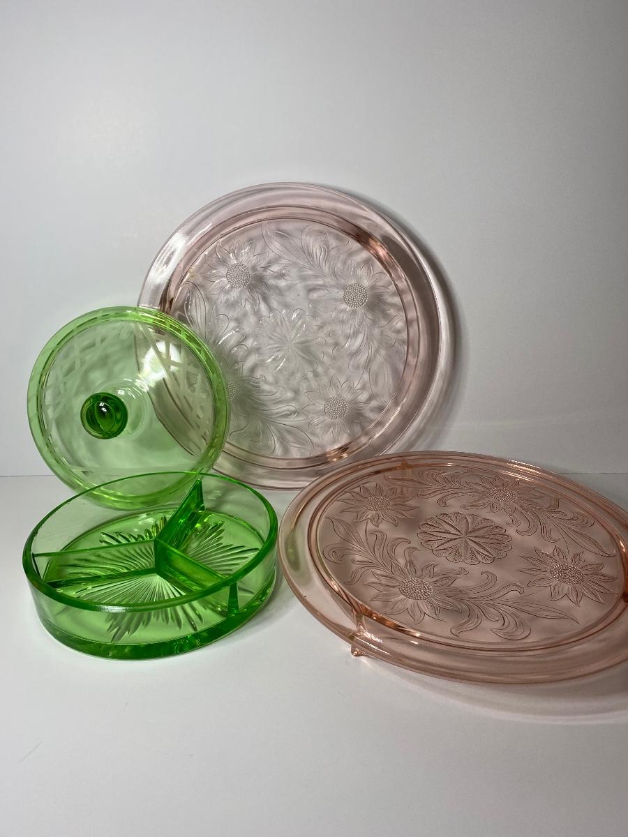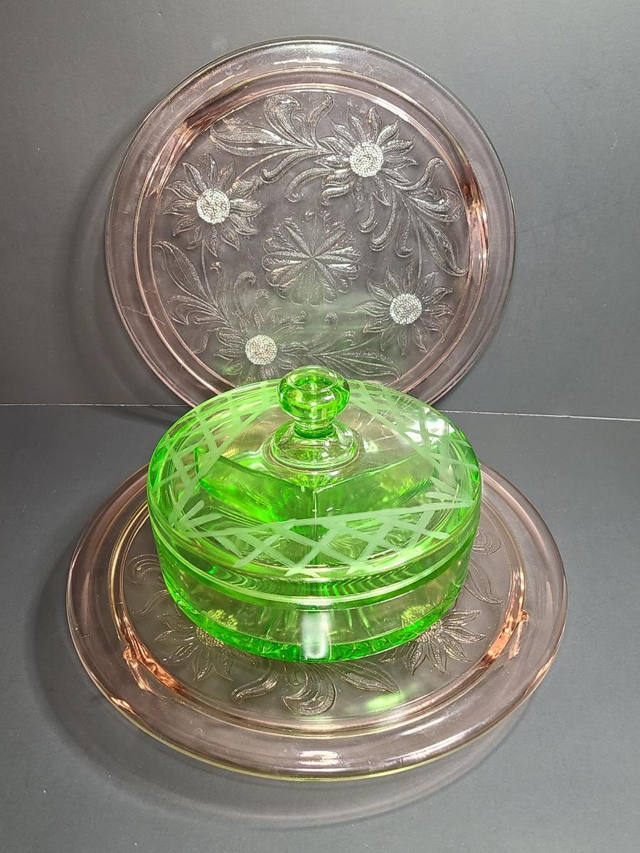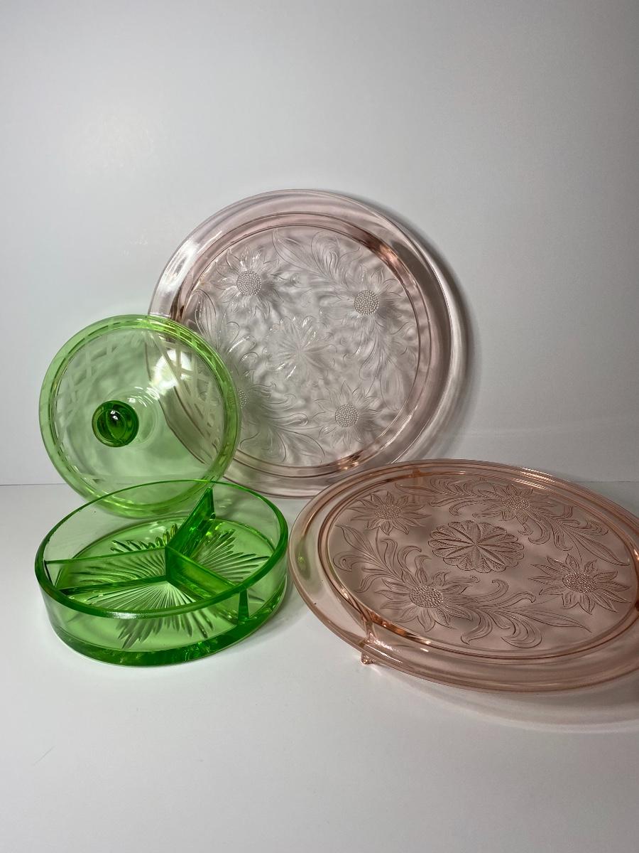 Lot 42: Green (Uranium Glass) Candy Dish, and Pink Cake Plates