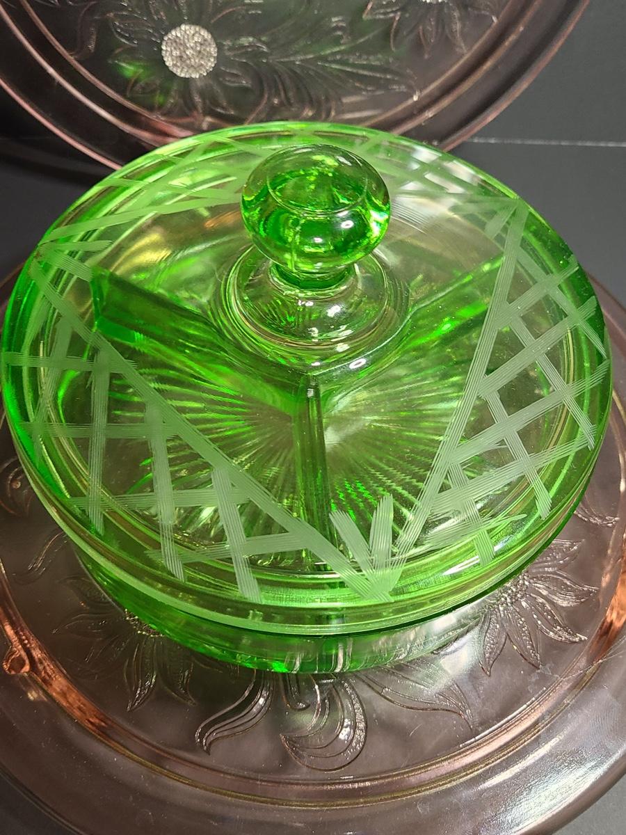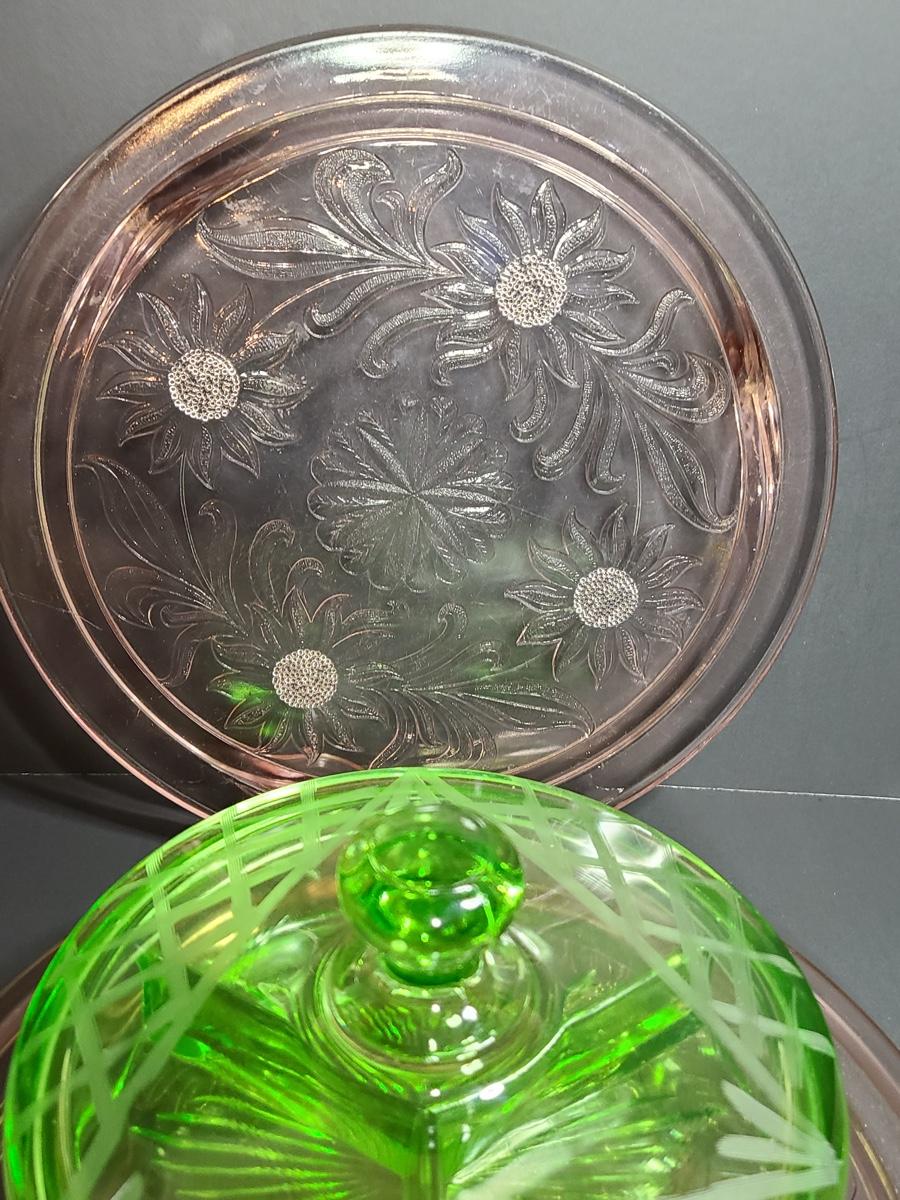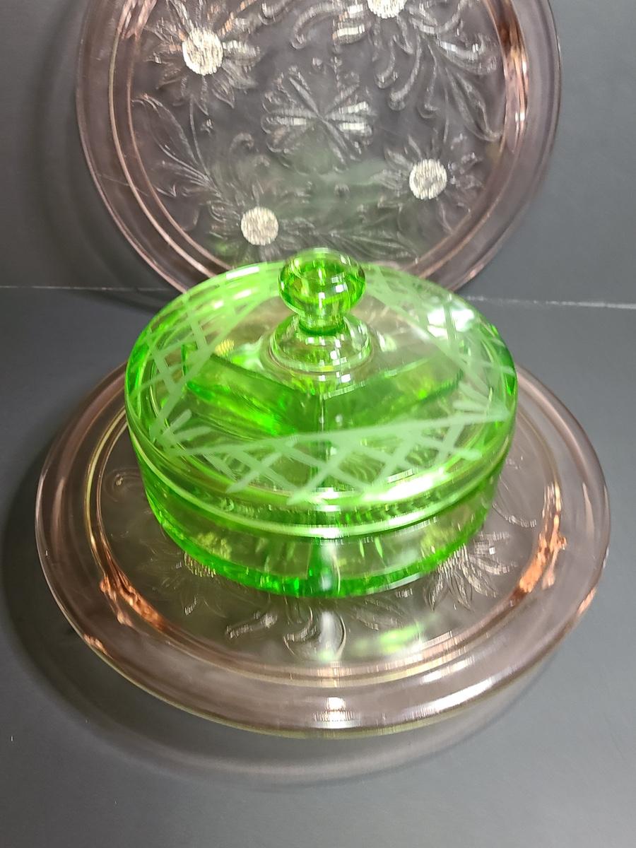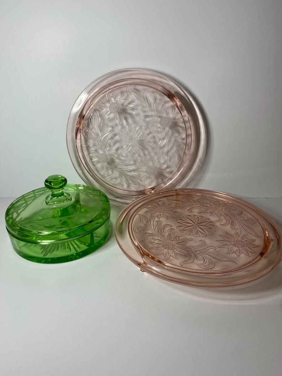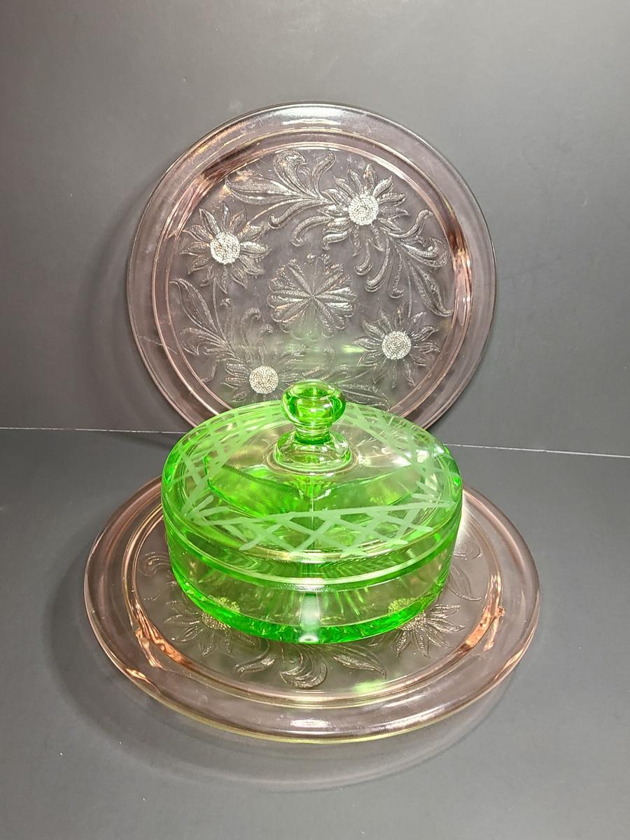 Lot 42: Green (Uranium Glass) Candy Dish, and Pink Cake Plates