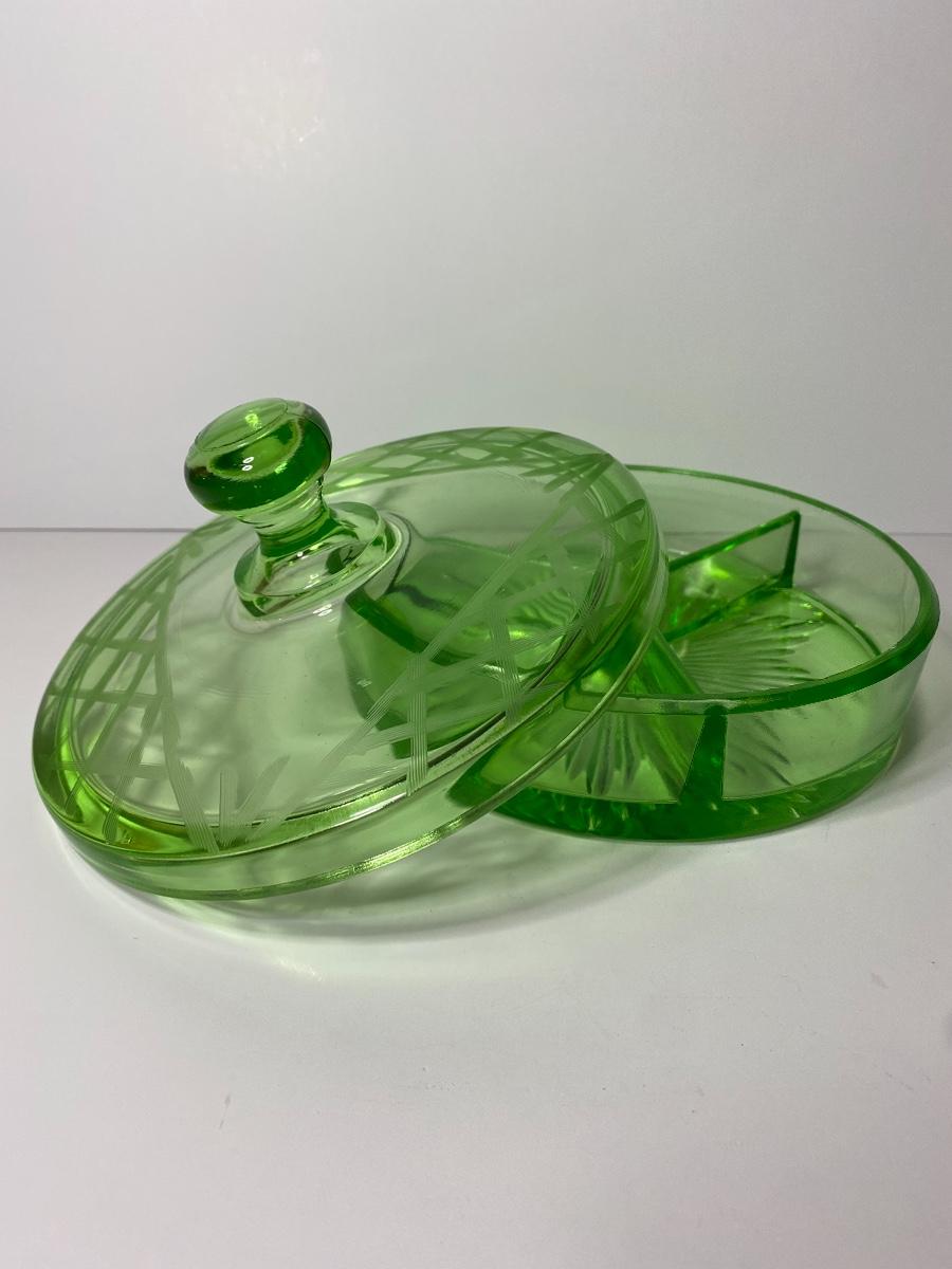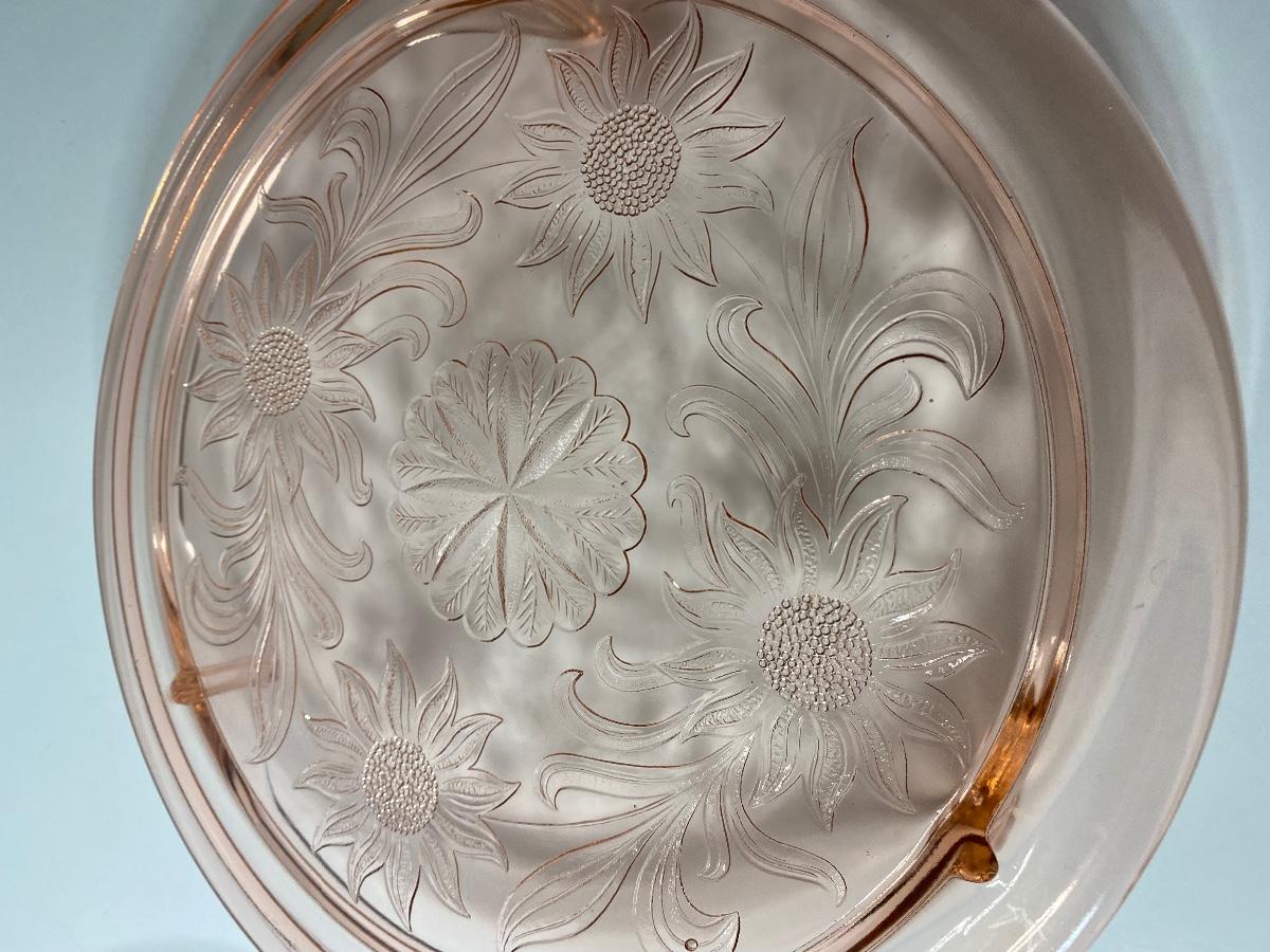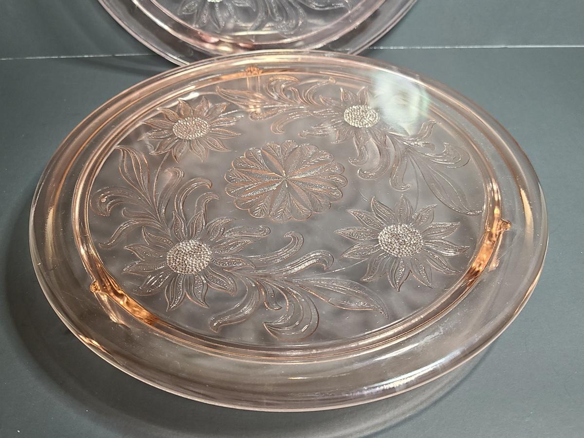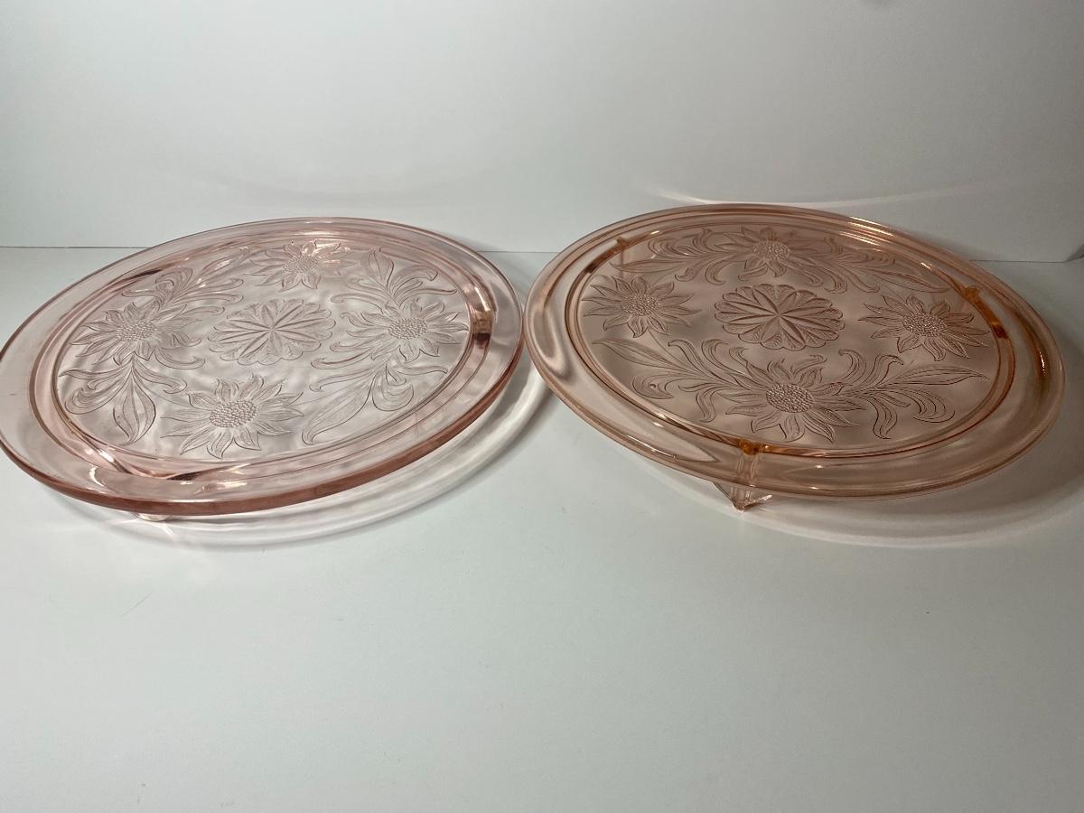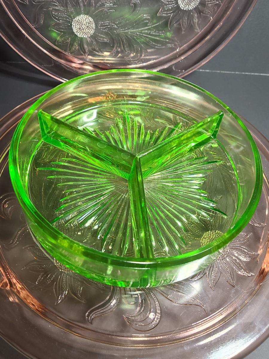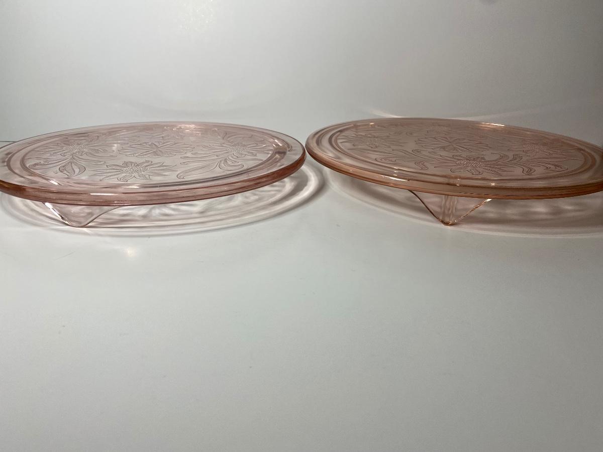 Lot 42: Green (Uranium Glass) Candy Dish, and Pink Cake Plates