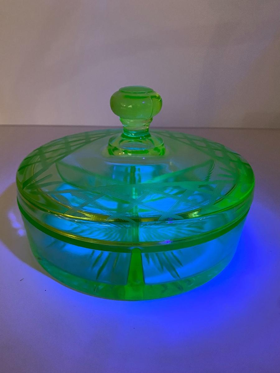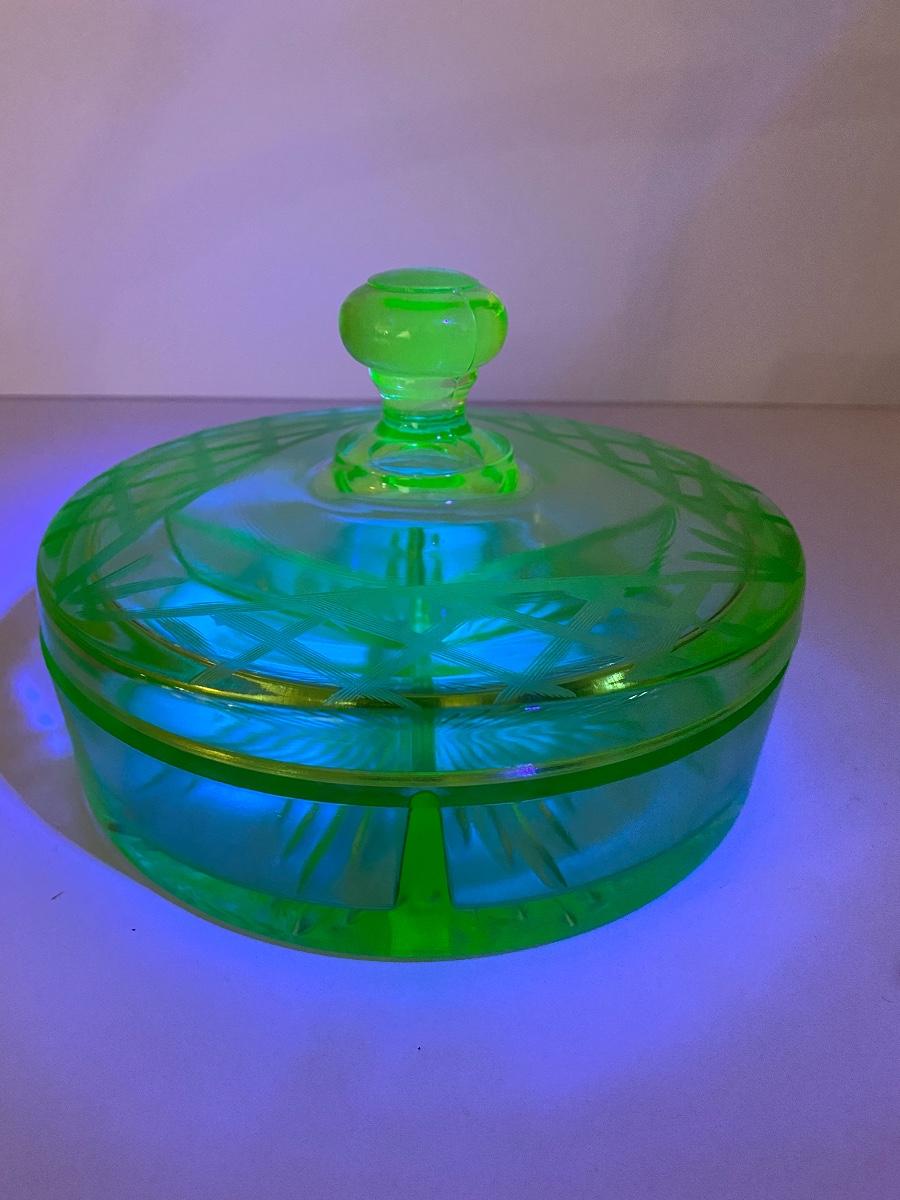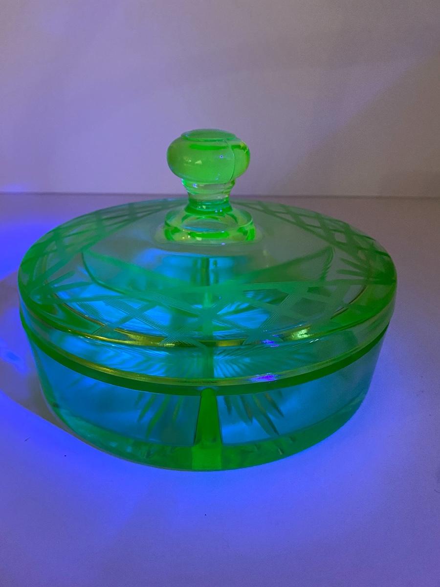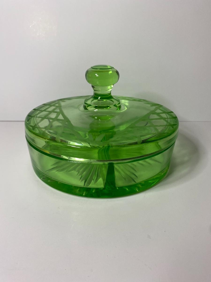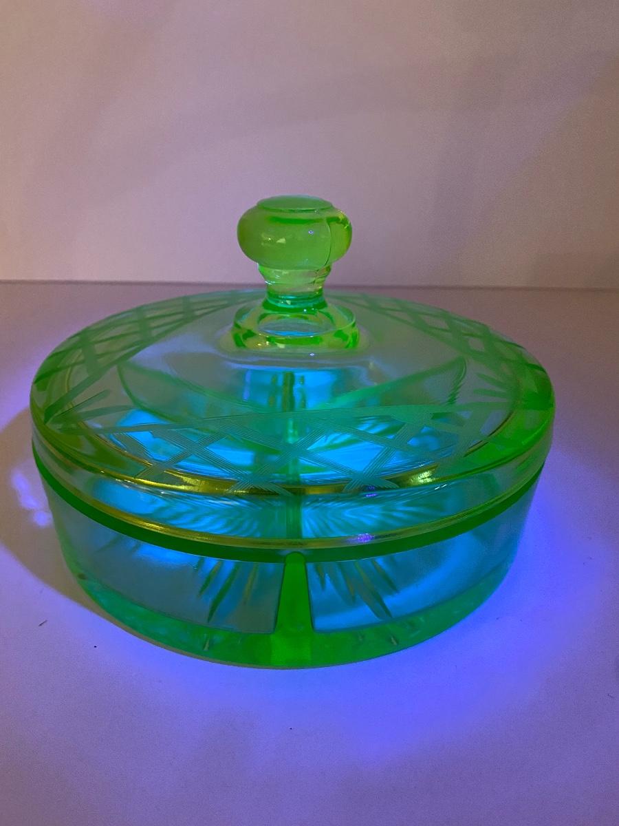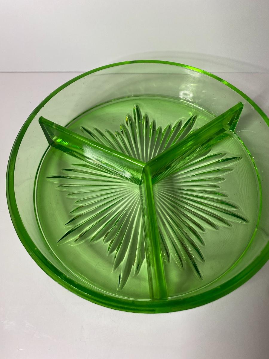Lot 42: Green (Uranium Glass) Candy Dish, and Pink Cake Plates