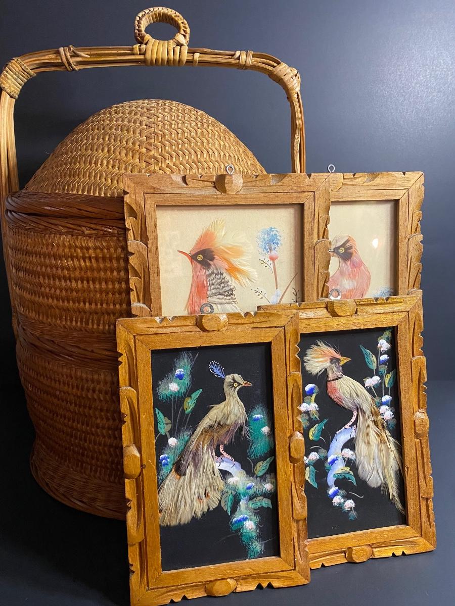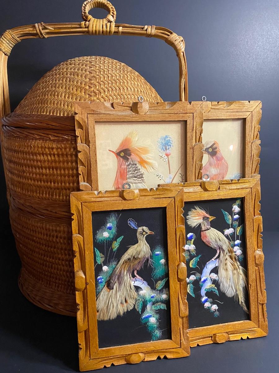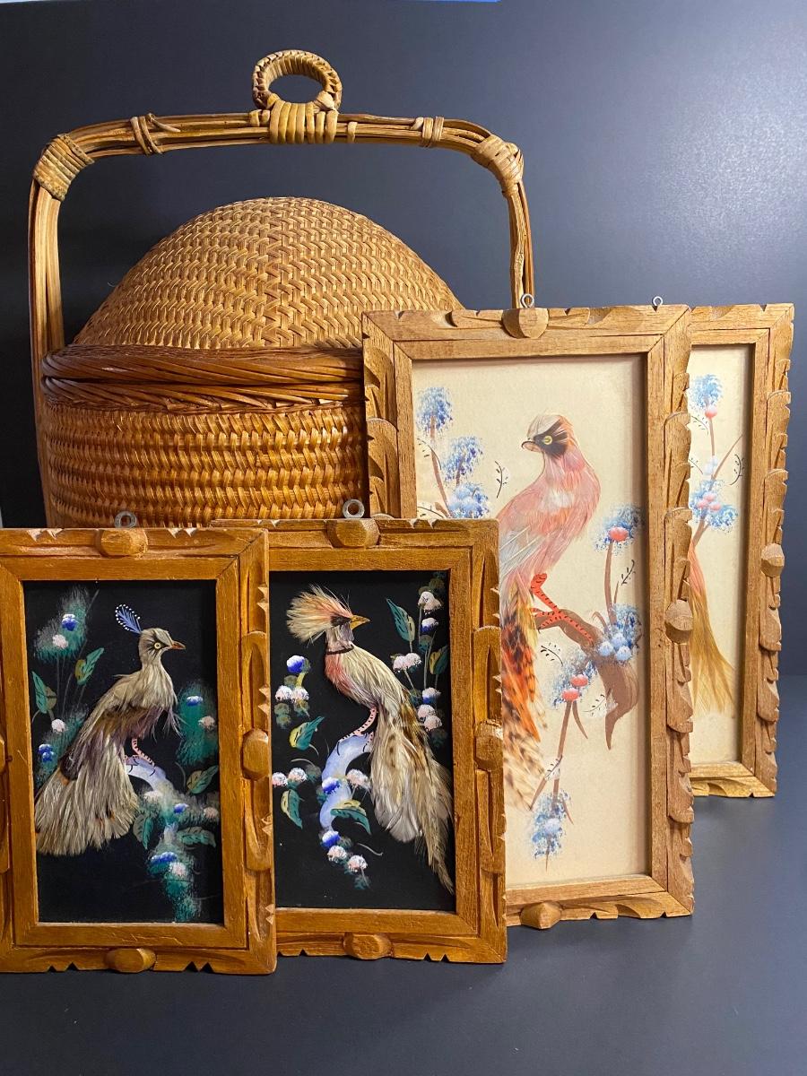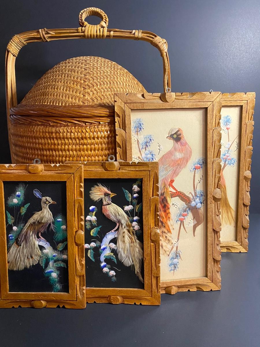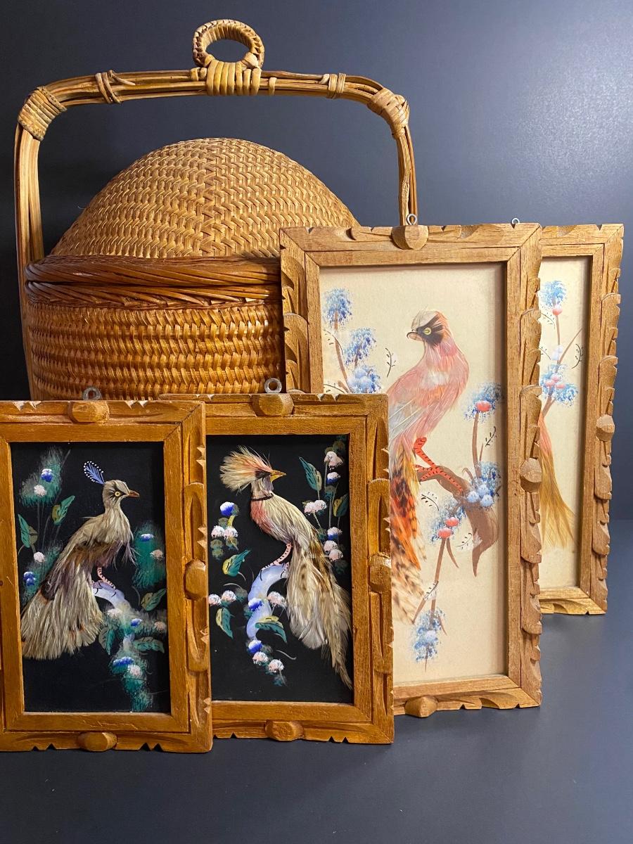 Lot 440: Asian 2 Tier Wedding Basket, MCM Feather Bird Art Sets